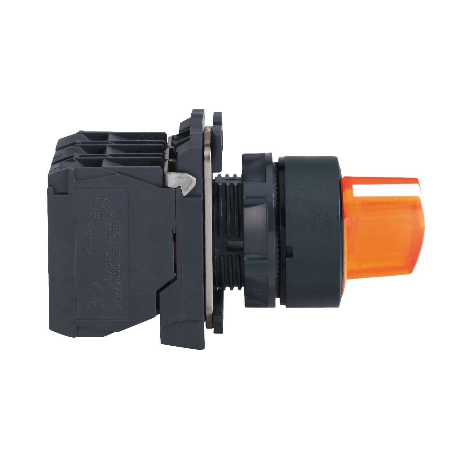 Harmony XB5 - bouton tournant - à manette - lumineux - DEL intégrée - orange - Ø22 - collerette dépassante - plastique noir - 2 positions - fixes - 1O+1F - 230/240VAC - fixation Ø22 - raccordement par vis-étrier