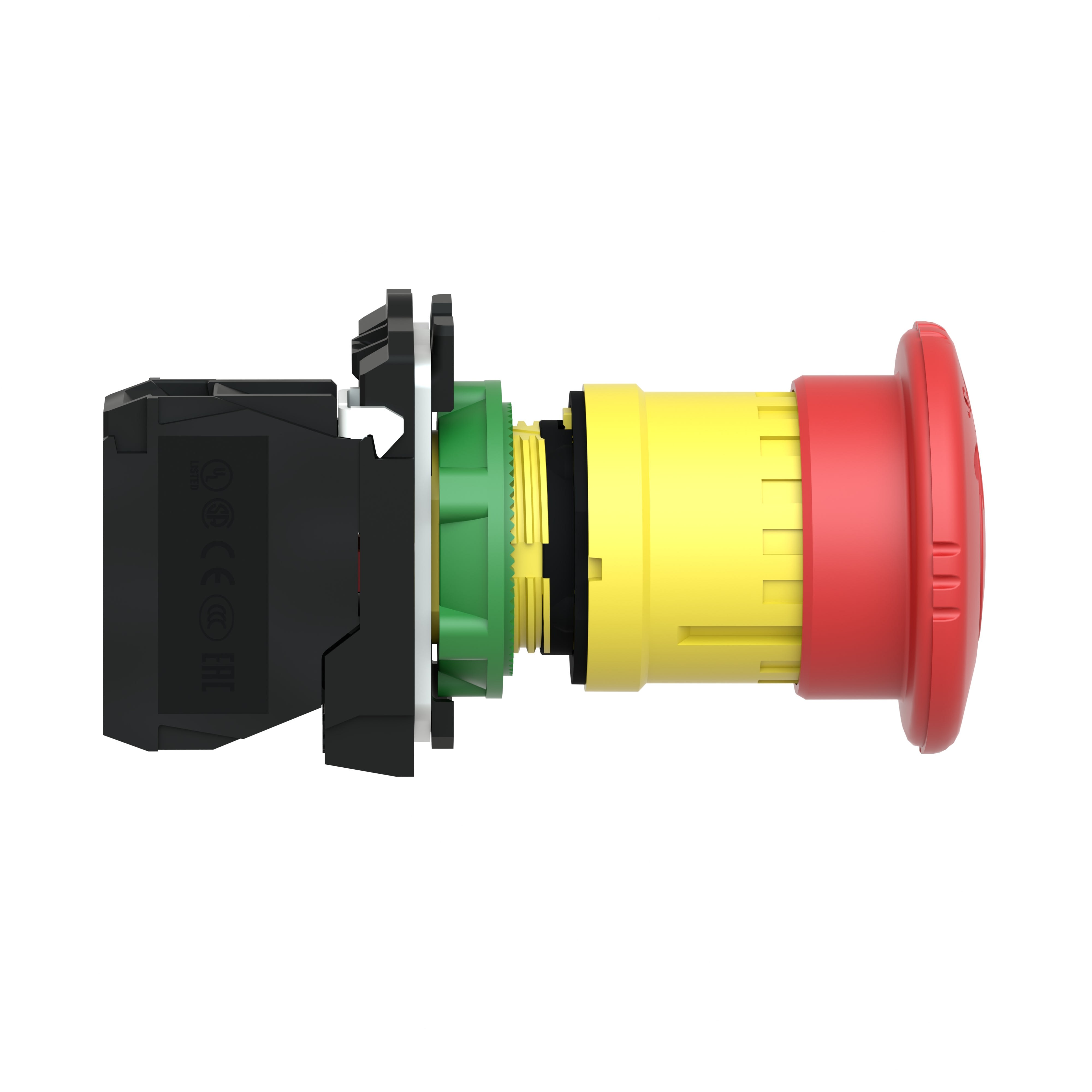 Ce bouton-poussoir d'arrêt d'urgence Harmony XB5 à tête champignon fonctionne avec un verrouillage mécanique, il faut tourner pour le déverrouiller. Il a une colerette en plastique et est livré avec bouton d'arrêt d'urgence rouge de diamètre 40 mm, non marqué. Il comporte 1 contact à rupture lente NF et un raccordement avec bornes à vis-étrier. Il se distingue clairement visuellement à distance grâce à une couleur claire et une forme de champignon proéminente de 40 mm. Il s'installe facilement dans une découpe de panneau standard de 22 mm de diamètre. Il est résistant aux chocs, à la poussière, à l'eau et aux vibrations grâce à un indice de protection IP66 / IP67 / IP69 / IP69K, ce qui le rend idéal pour une utilisation dans des environnements difficiles. Il pèse 60g.Sa lunette en plastique le rend idéal pour les applications nécessitant une bonne résistance aux agents chimiques et / ou une double isolation électrique.