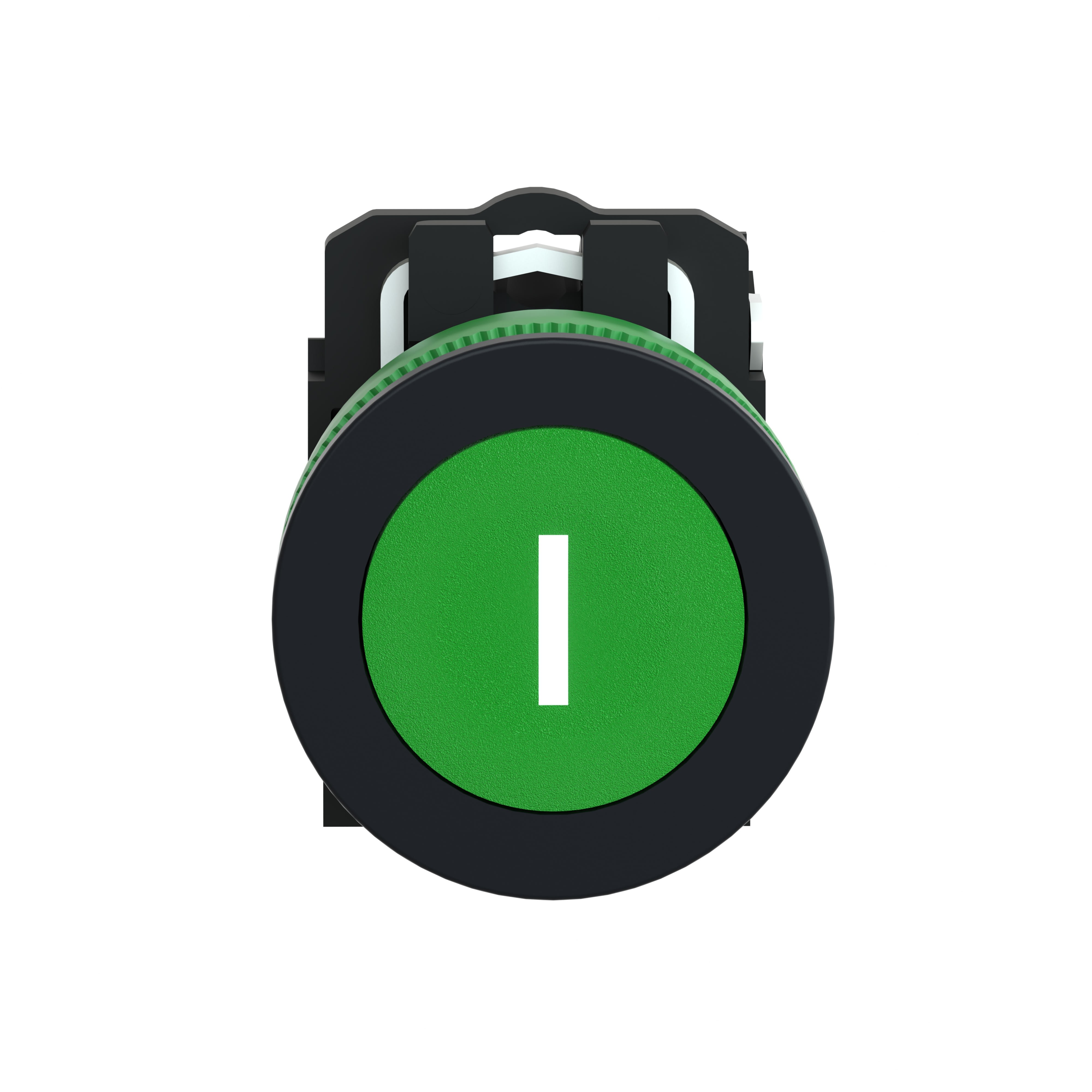 Harmony XB5 - bouton poussoir - à impulsion - poussoir affleurant - vert - avec marquage - Ø22 - collerette affleurante - plastique noir - 1F - fixation Ø30 - raccordement par vis-étrier