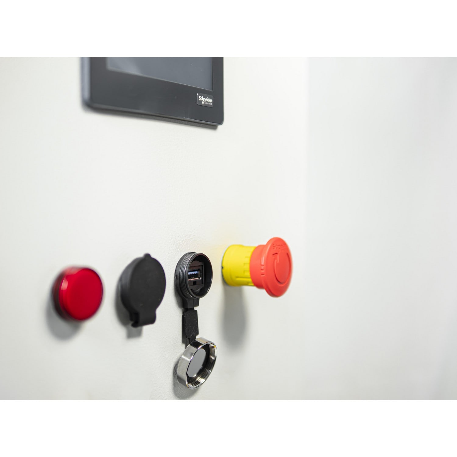 Ce port USB monté sur le panneau Harmony XB5 permet de connecter des dispositifs USB à votre machine. Il offre un moyen simple de se connecter à votre machine au moyen de connecteurs normalisés, sans ouvrir la porte de l'armoire de commande. L'interface est un port USB 3.0 de type A, assurant un transfert de données à grande vitesse et une large compatibilité avec les périphériques USB standard. Il permet un accès facile et sécurisé à l'automatisation et aux contrôleurs de votre machine via un port situé sur la porte de l'armoire de commande. Ce port monté sur panneau en plastique est doté d'une prise de type A et d'un couvercle de protection en élastomère. Le port bénéficie d'une protection IP20 à l'arrière et d'une protection IP64/IP67 à l'avant. Il a une profondeur de 38,2 mm (1,50 po) derrière le panneau et pèse 0,020 kg (0,044 lb). Ce produit est conforme aux certifications CSA et UL. Les câbles, l'outil de serrage, les portes-étiquettes et les étiquette marquées ou non marquées pour ce port peuvent être achetés séparément. Muni d'un écrou de fixation, le port est conçu pour être monté dans une découpe de panneau standard de 22,5 mm avec une encoche anti-rotation. Il est compatible avec des épaisseurs de porte allant de 1 à 6 mm. La conception innovante et ergonomique de la gamme Harmony améliore la fiabilité des panneaux, des machines et des processus.