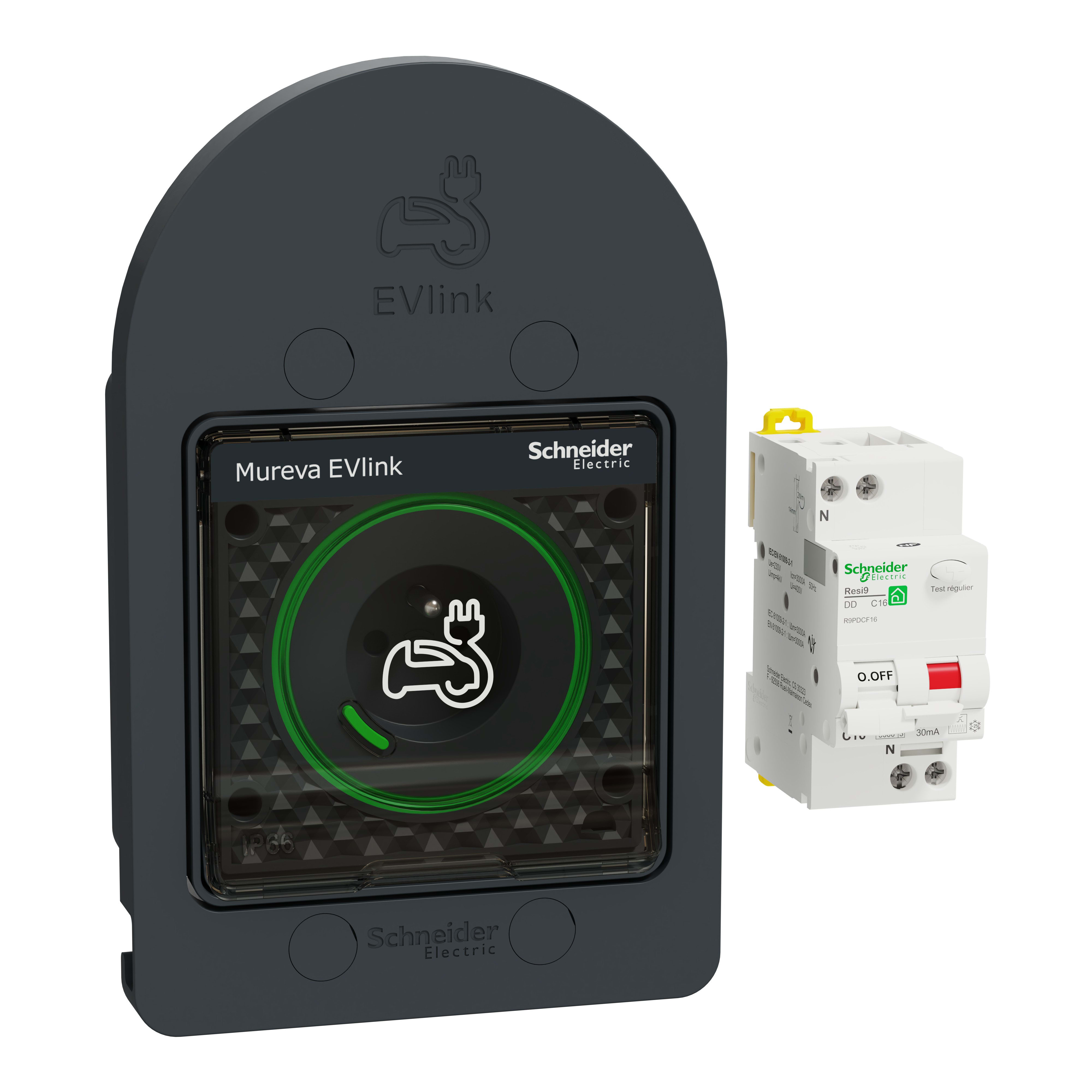 Ce kit disjoncteur différentiel + prise renforcée 16A / 250 V, étanche IP66 et robuste IK08, permet de réaliser une installation complète pour la recharge d'un véhicule électrique ou hybride rechargeable. La prise renforcée limite les échauffements et propose de nombreuses fonctionnalités : support de câble, indicateur lumineux et est connectable à Wiser. Elle sera installée sur une ligne dédiée et protégée par le disjoncteur différentiel. Elle ne requiert pas d'habilitation IRVE pour être installée. Son design tendance gris anthracite inspiré de la forme des bornes kilométriques françaises sublimera votre installation intérieure ou extérieure ! MUR36016 est un kit complet prêt à l'emploi : disjoncteur différentiel, boitier saillie avec entrées de câbles, prise renforcée 2P+T à éclipses, clapet transparent avec icône, support de câble avec crochets, presse étoupe et bouchons.Cette prise renforcée promet une grande ergonomie de câblage lors l'installation. Un gabarit de perçage, inclus dans le packaging, facilite le perçage des 8 trous : 4 pour le boitier et 4 pour le support de câble (vis non fournies). Le boitier possède 3 entrées de câbles : haut, bas, arrière. Le presse étoupe fourni garantit l'IP66. Le mécanisme de la prise, à connexion à vis (3x2,5mm²), se clipse et se déclipse sans outil dans une zone étanche complète brevetée. Son clapet se fixe à l'aide de 4 vis filetées métalliques (fournies et imperdables) assurant une robustesse et étanchéité durables dans le temps. Des bouchons sont fournies pour parfaire l'installation du support. Ce produit est certifié 8A VE (NF C 61-314) et homologué 16A renforcée (IEC 60884-1). Il est certifié Green Premium, l'écolabel qui s'engage à des performances durables et respectueuses de l'environnement et présente une fiche PEP. Mureva EVlink propose également la prise vendue seule dans le cas de tableau déjà équipé. Il existe 2 types de prises : sans clé et avec clé, celle-ci permettant de limiter manuellement l'accès à la prise. Pour des recharges rapides, choisissez les bornes EVlink Home, EVlink Home Smart et EVlink ProAC de Schneider Electric ! Les prises renforcées Mureva EVlink allient facilité d'installation, praticité, et évolutivité. Pour la recharge lente des voitures électriques, elle vous offre la simplicité d'une prise, l'intelligence en plus ! Développée autour de la gamme reconnue Mureva Styl, les prises renforcées Mureva Styl et EVlink sont idéales pour la recharge de véhicules électriques qui parcourent jusqu'à 50 km par jour et pour toutes les hybrides rechargeables. Schneider Electric propose toute une solution de produits connectées Wiser, ainsi que de nombreux produits étanches et robustes pour compléter votre installation : Mureva Styl, Mureva Tubes, Mureva Box, Murafix, Instaclips et Instacables, …