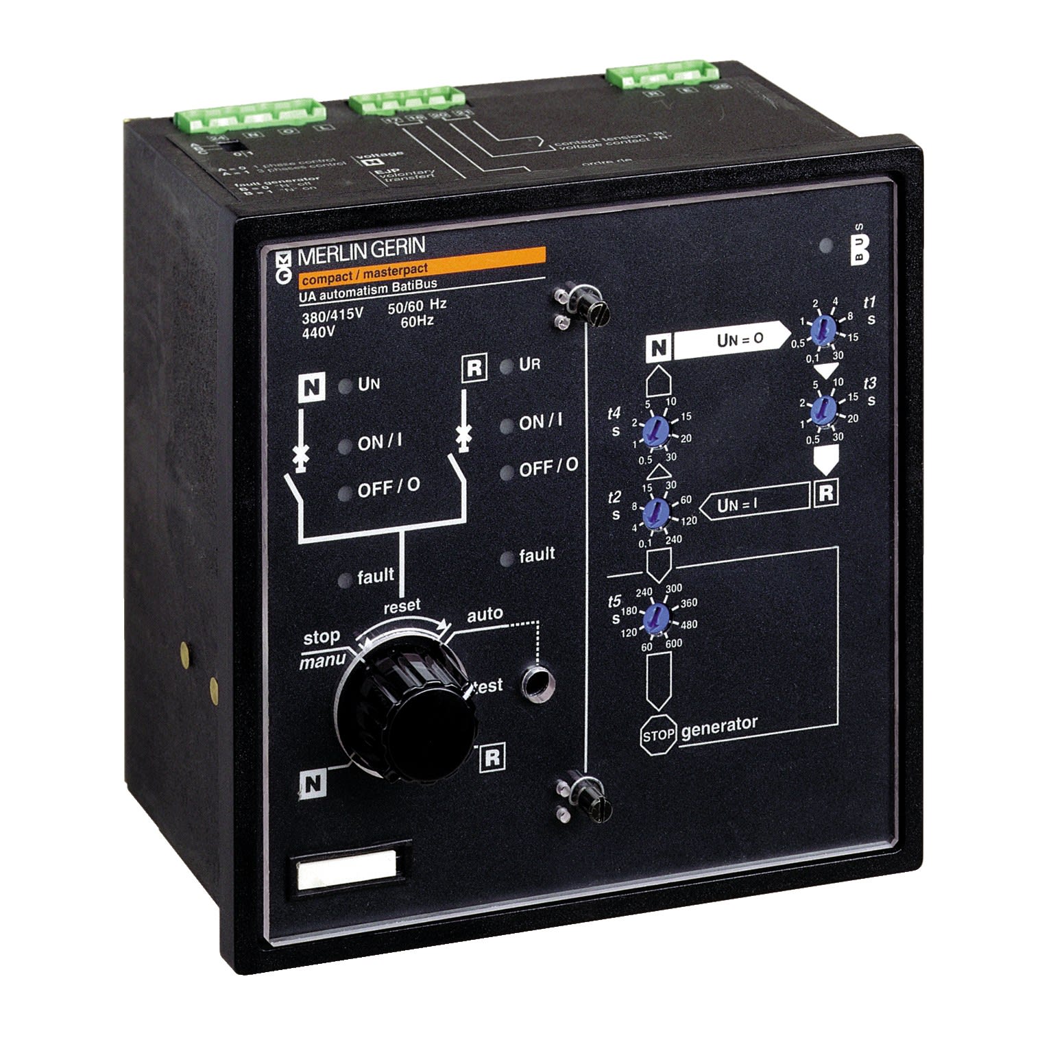 Il s'agit d'un contrôleur UA automatique du système inverseur de sources pour les appareils Compact NSX, Compact NS et Masterpact Il permet le transfert d'une source à une autre, le démarrage du groupe électrogène moteur et le délestage Il peut être installé directement sur la plaque de commande du Transferpact ACP ou monté sur le panneau avant du tableau La tension de commande est de 220VCA à 240CA 50/60Hz