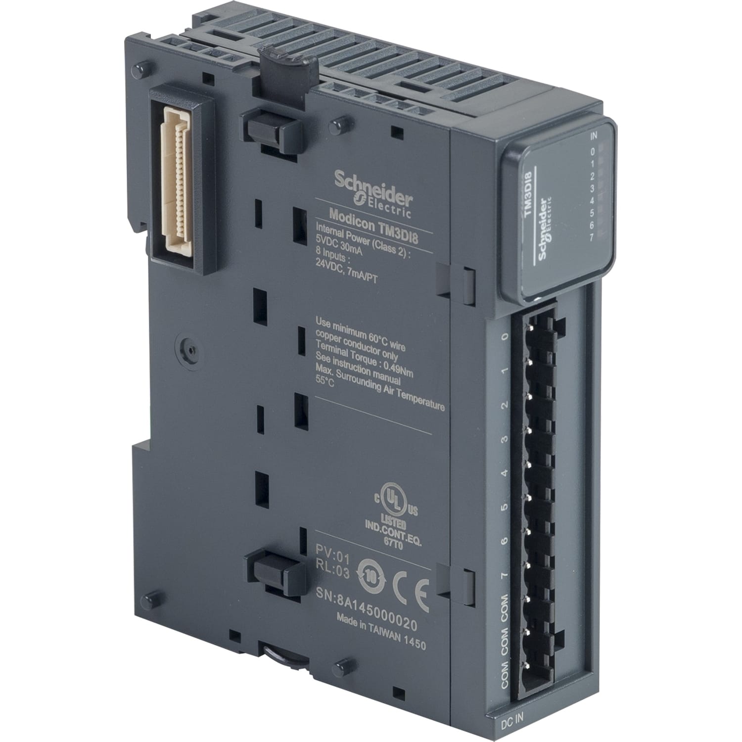 Ce produit fait partie de la gamme Modicon TM3, une offre de modules d'extension d'E/S pour Modicon M221, M241, M251 et M262. Le module d'entrées TOR dispose de 8 entrées avec logique de puits ou de source (positive / négative). Il s'agit d'un module d'entrée avec une tension d'entrée de 24V CC et une consommation de courant de 24mA / 5mA à 5V CC via un connecteur de bus. Il peut être utilisé pour créer des configurations jusqu'à 8 entrées. Il y a une isolation entre l'entrée et la logique interne à 500V CA et une non-isolation entre les entrées. Il est fourni avec une borne à vis amovible pour la connexion électrique avec un réglage de pas de 5,08 mm pour les sorties et l'alimentation. L'indice de protection est IP20. Ses dimensions sont de 27,4 mm (largeur) x 84,6 mm (profondeur) x 90 mm (hauteur). Il pèse 0,085 kg. Ce produit est certifié CE, CULus et C-Tick. Il répond aux normes EN / CEI 61131-2 et EN / CEI 61010-2-201. Ce module est compatible avec les contrôleurs logiques Modicon M241, Modicon M251 et Modicon M221. Il accepte les montages avec le Top hat type TH35-15, le Top hat type TH35-7.5 conformes à la norme CEI 60715 ou sur platine ou sur panneau avec un kit de fixation. Les modules d'extension Modicon TM3 ont été conçus avec un mécanisme d'assemblage à verrouillage simple. Les modules d'extension Modicon TM3 ont été conçus avec un mécanisme d'assemblage à verrouillage simple. Boostez les performances de votre contrôleur avec le système d'E/S Modicon TM3 spécialement conçu pour les contrôleurs logiques Modicon M221, M241 et M251.