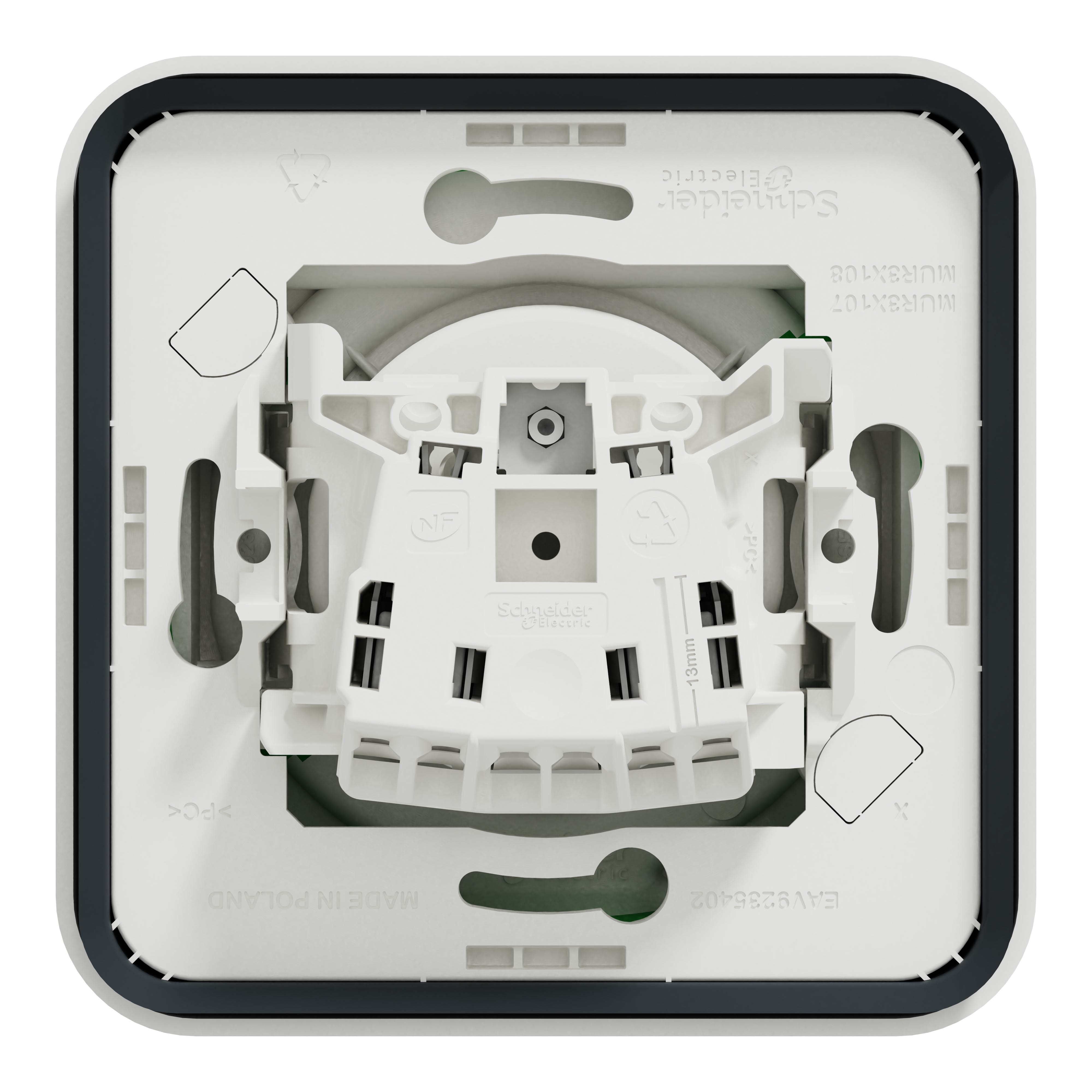 Cette prise renforcée promet une grande ergonomie de câblage lors de son installation. Le mécanisme de la prise, à connexion à vis (3x4mm² max), est fin, se clipse et se déclipse sans outil dans une zone étanche complète brevetée. Le cadre est compatible avec les boites d'encastrements du marché. Un ajustement du niveau d'horizontalité est possible sur quelques degrés. Un joint étanche à l'arrière garantit l'étanchéité et s'adapte aux différentes surfaces de murs. Son clapet, avec icône, associé à une membrane d'étanchéité se fixe à l'aide de 2 vis filetées métalliques pour assurer une robustesse et étanchéité durables dans le temps.