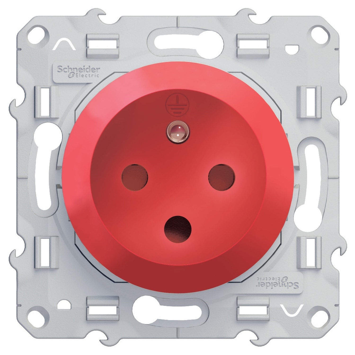 La prise de courant Odace S52009903 de Schneider Electric est un mécanisme équipé d’un cadre de fixation en plastique rouge. Son boîtier de montage adapté peut être encastré dans la surface du mur. Les bornes de raccordement de cette prise de courant sont des bornes à vis. Cet appareil est au standard français. Il a également obtenu le certificat LCIE, NF. Cette prise de courant dispose de volets et d'une protection contre les manipulations 2P + E. Son mode de fixation se fait par vis. Réalisée en matériau ASA + PC, PBT (polybutylène téréphtalate) GF30, PC (polycarbonate) GF10 FR, cette prise de courant est fiable et résistante avec prise de terre. Son courant nominal est de 16 A. L'indice de protection IP de cet appareil est IP21D.