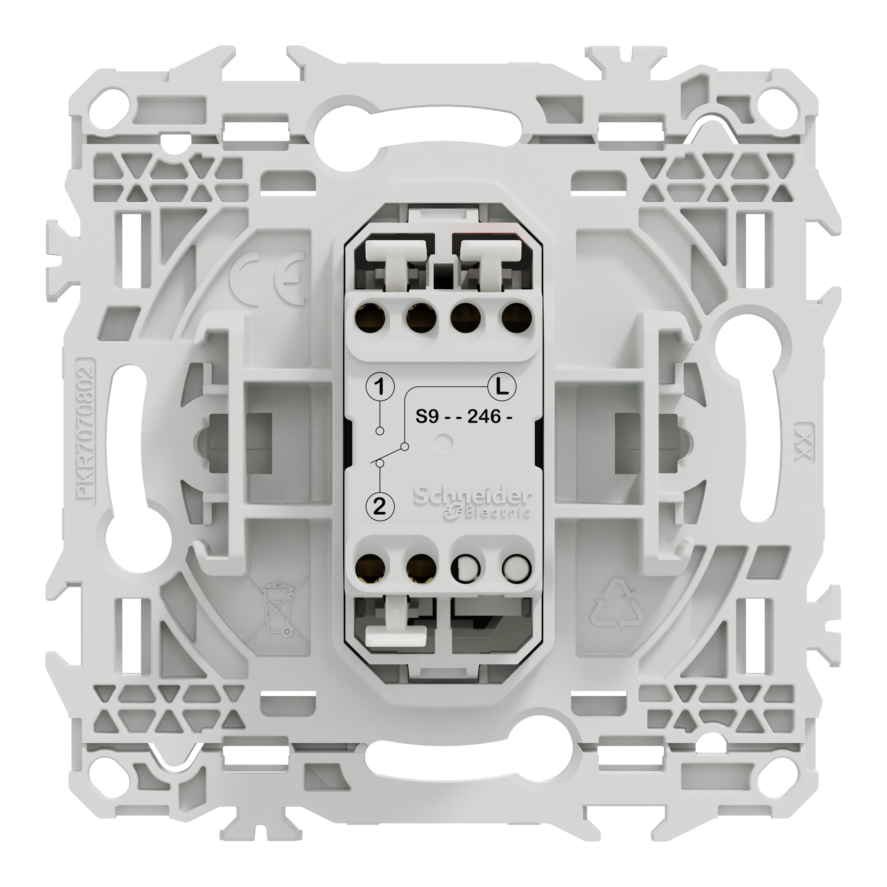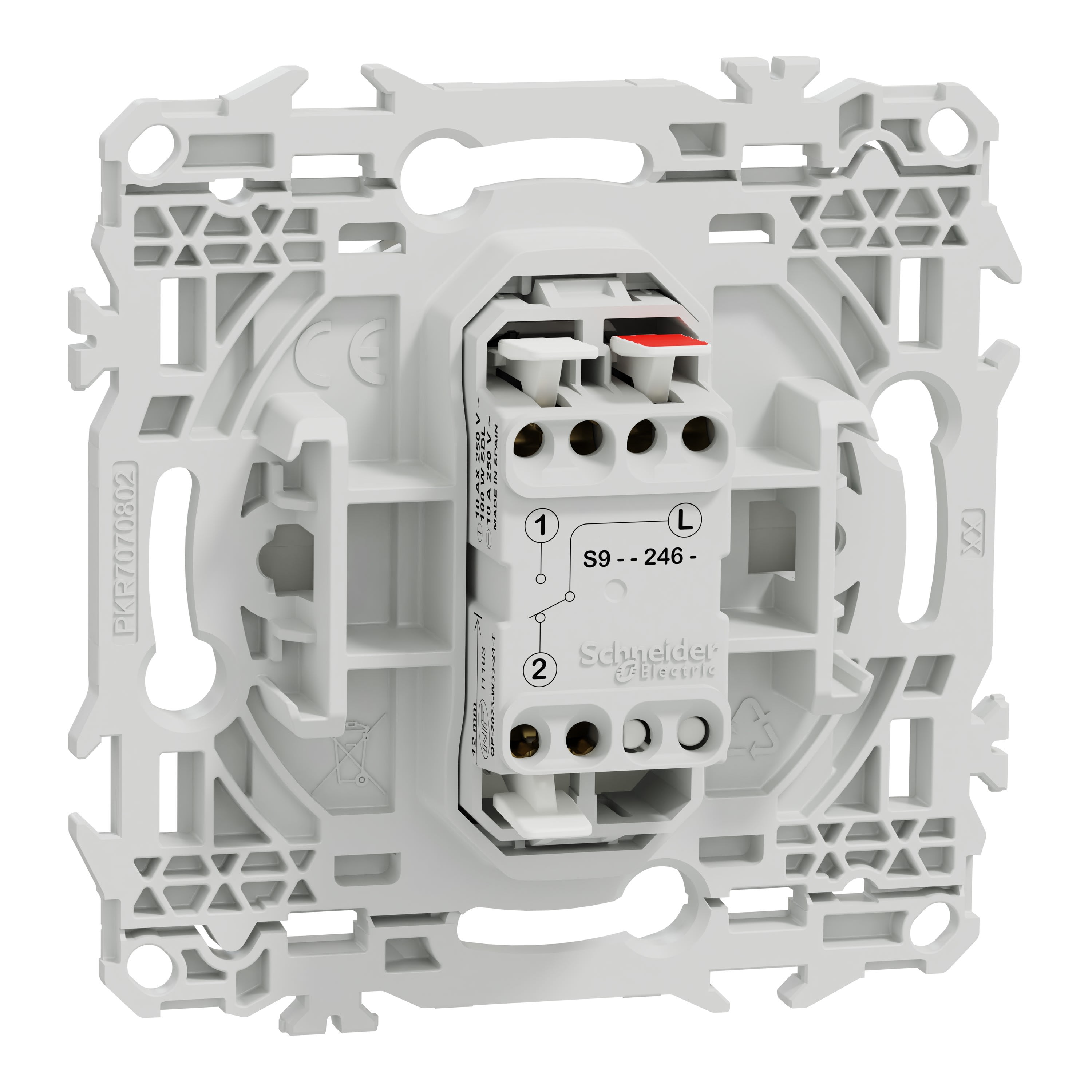 La fixation du mécanisme est facile et robuste sur tout type de boîte d'encastrement grâce à son support rigide à vis ou à griffes clipsables en option idéales pour la rénovation. Le produit dispose de bornes automatiques qui permettent un raccordement rapide et sécurisé des câbles jusqu’à 2x1,5mm² rigides ou souples & multibrins, simplifiant l’installation et réduisant le risque d’erreur.