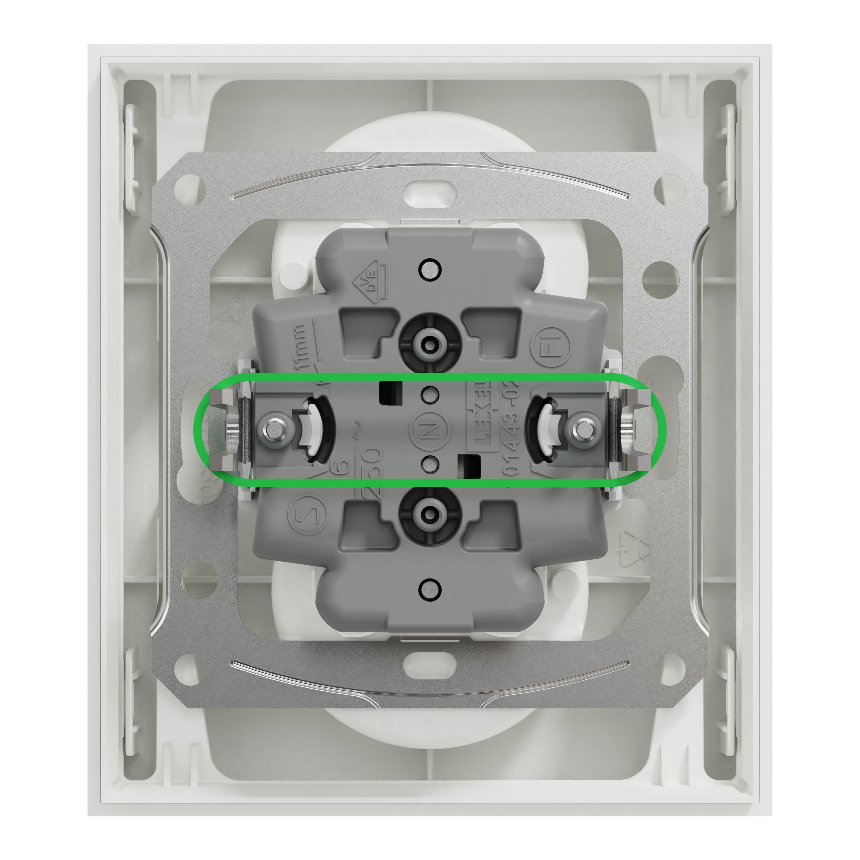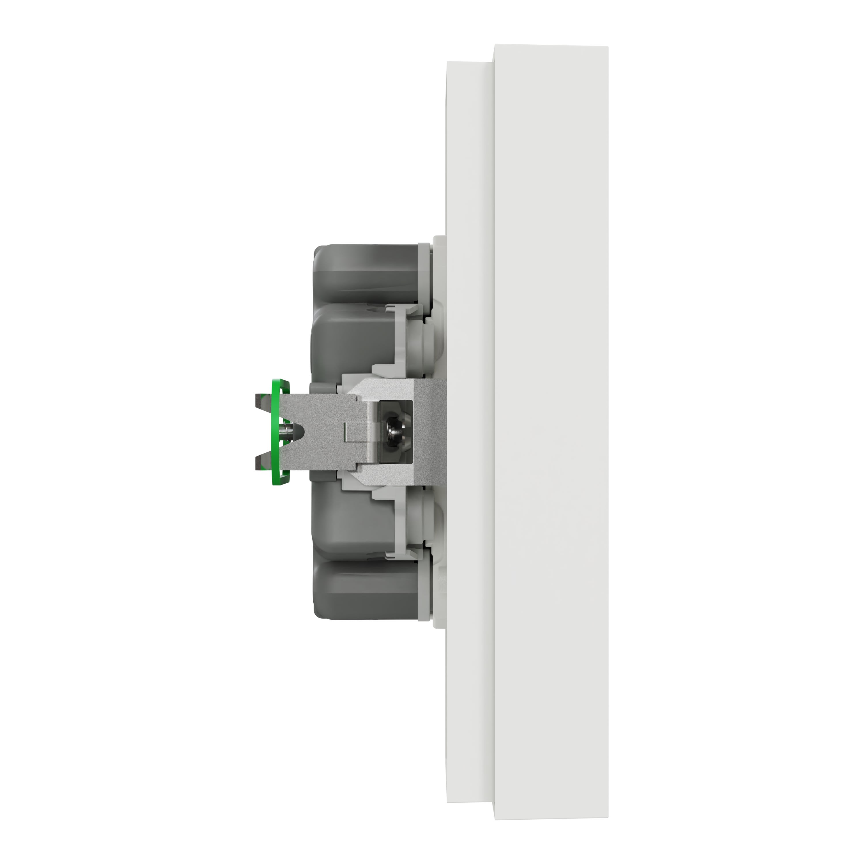 La prise de courant double Odace est livrée avec son support de fixation intégré, avec griffes, et sa plaque de finition.