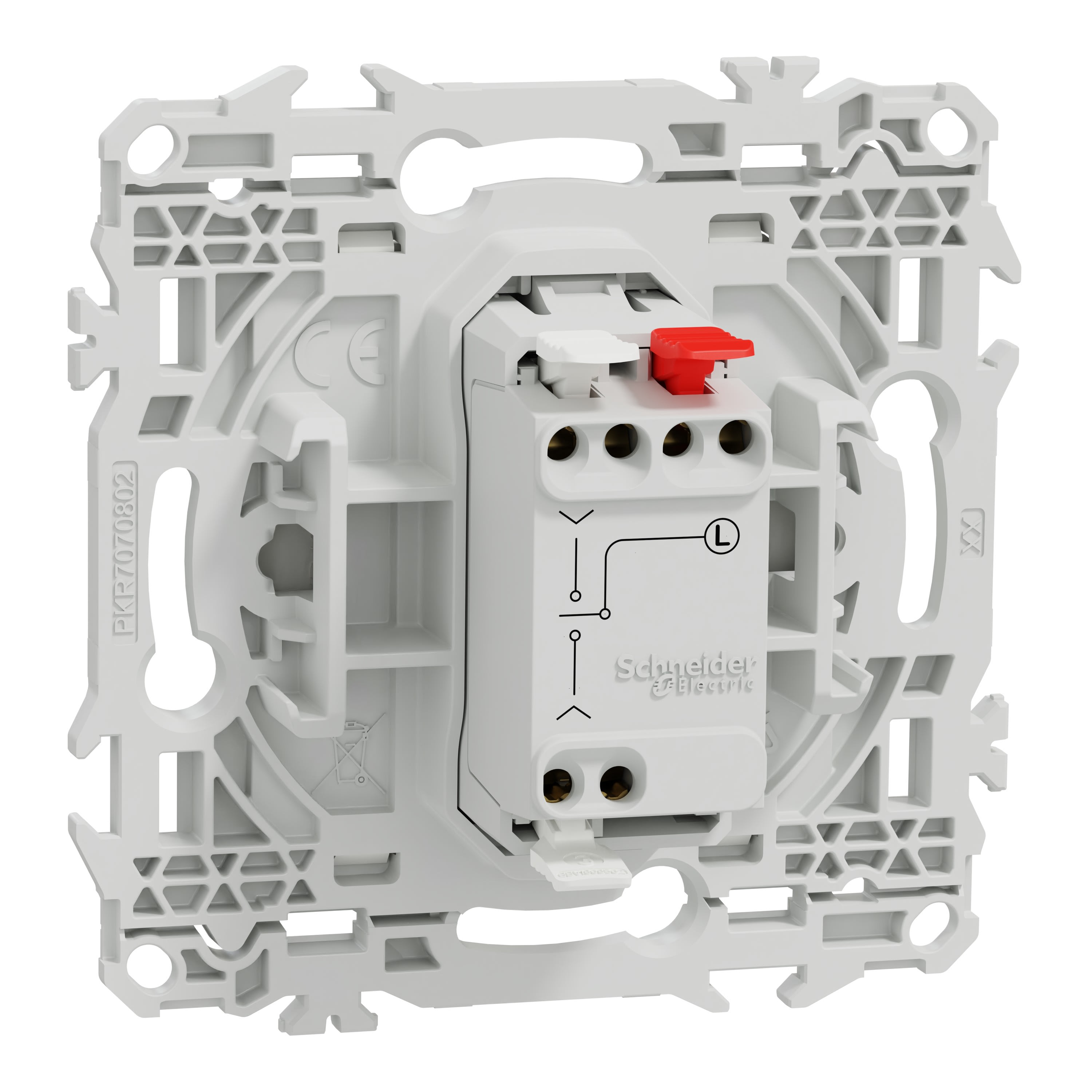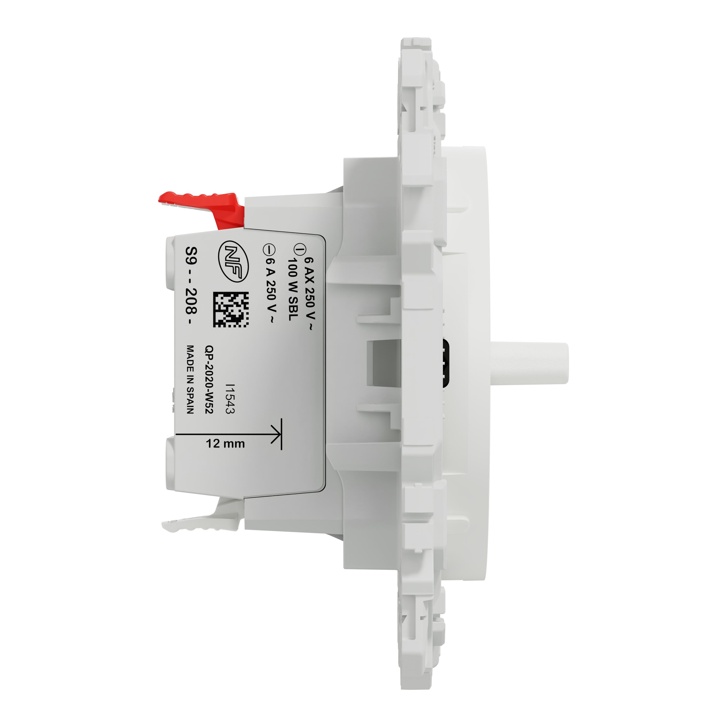 La fixation du mécanisme est facile et robuste sur tout type de boîte d'encastrement grâce à son support rigide à vis ou à griffes clipsables en option idéales pour la rénovation. Le produit dispose de bornes automatiques qui permettent un raccordement rapide et sécurisé des câbles jusqu’à 2x1,5mm² rigides ou souples & multibrins, simplifiant l’installation et réduisant le risque d’erreur.