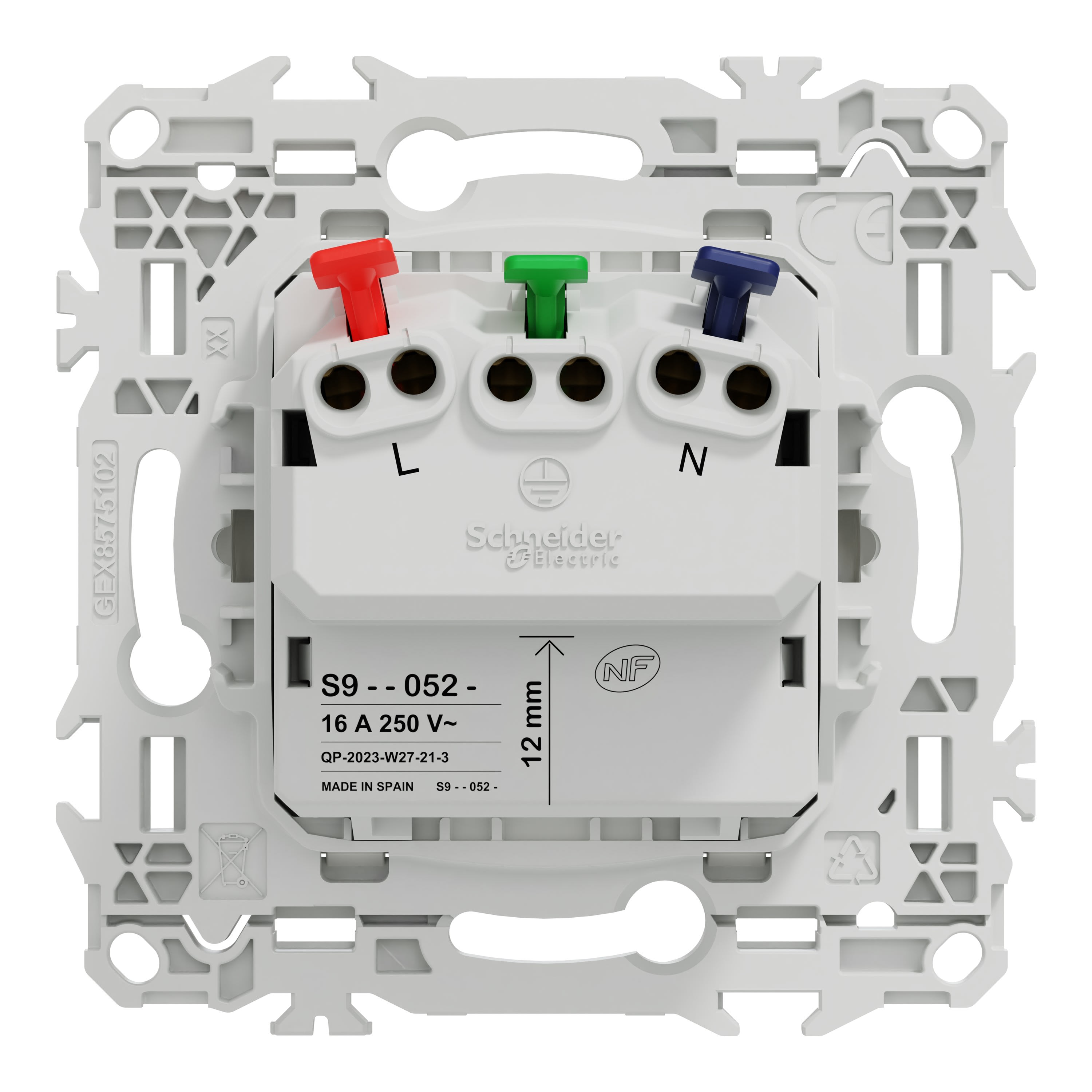 La fixation du mécanisme est facile et robuste sur tout type de boîte d'encastrement grâce à son support rigide à vis ou à griffes clipsables en option idéales pour la rénovation. Le produit dispose d'une connexion rapide et fiable sans outil grâce aux bornes automatiques sans vis jusqu'à 2 câbles de 2,5mm² rigides ou souples & multibrins pour chaque pôle.