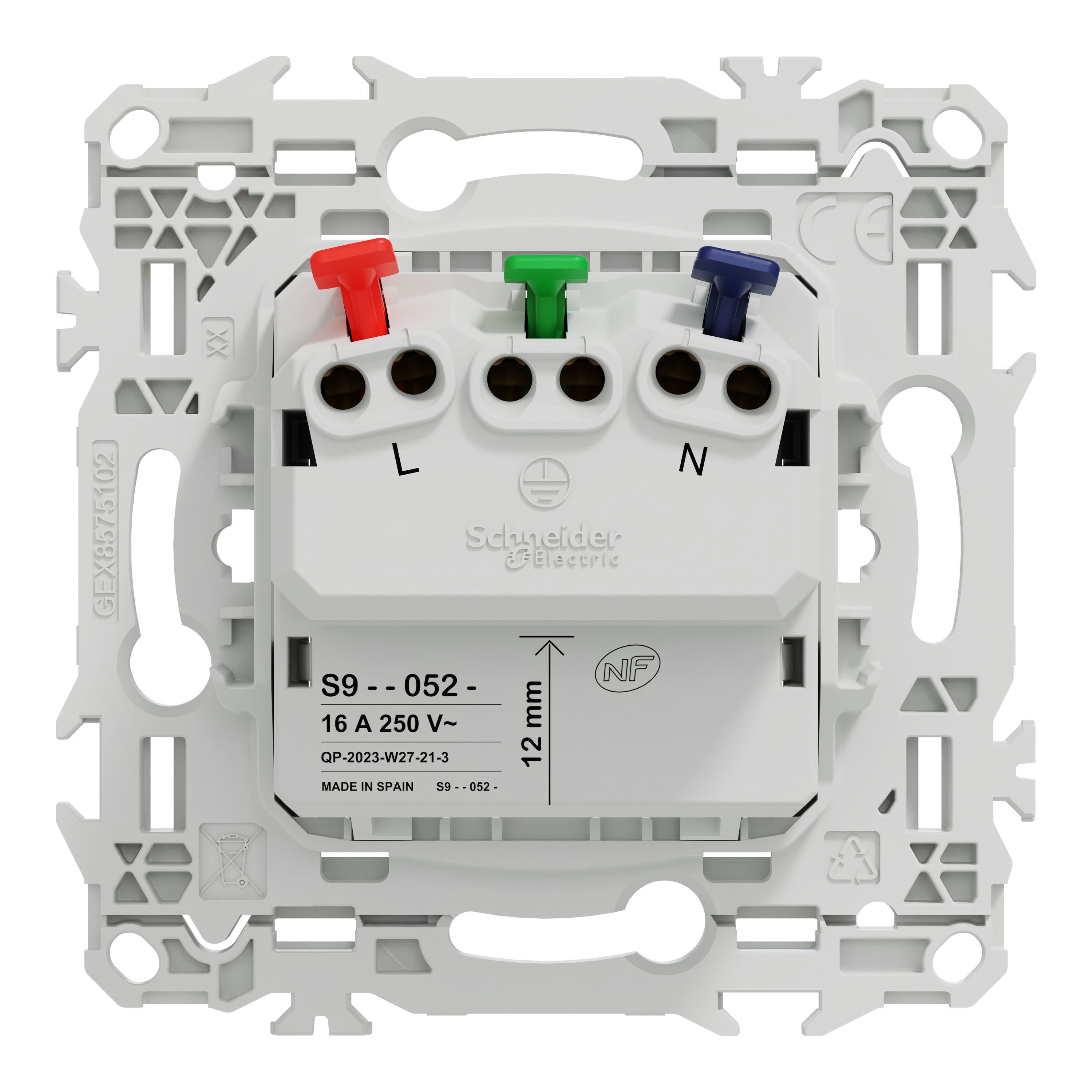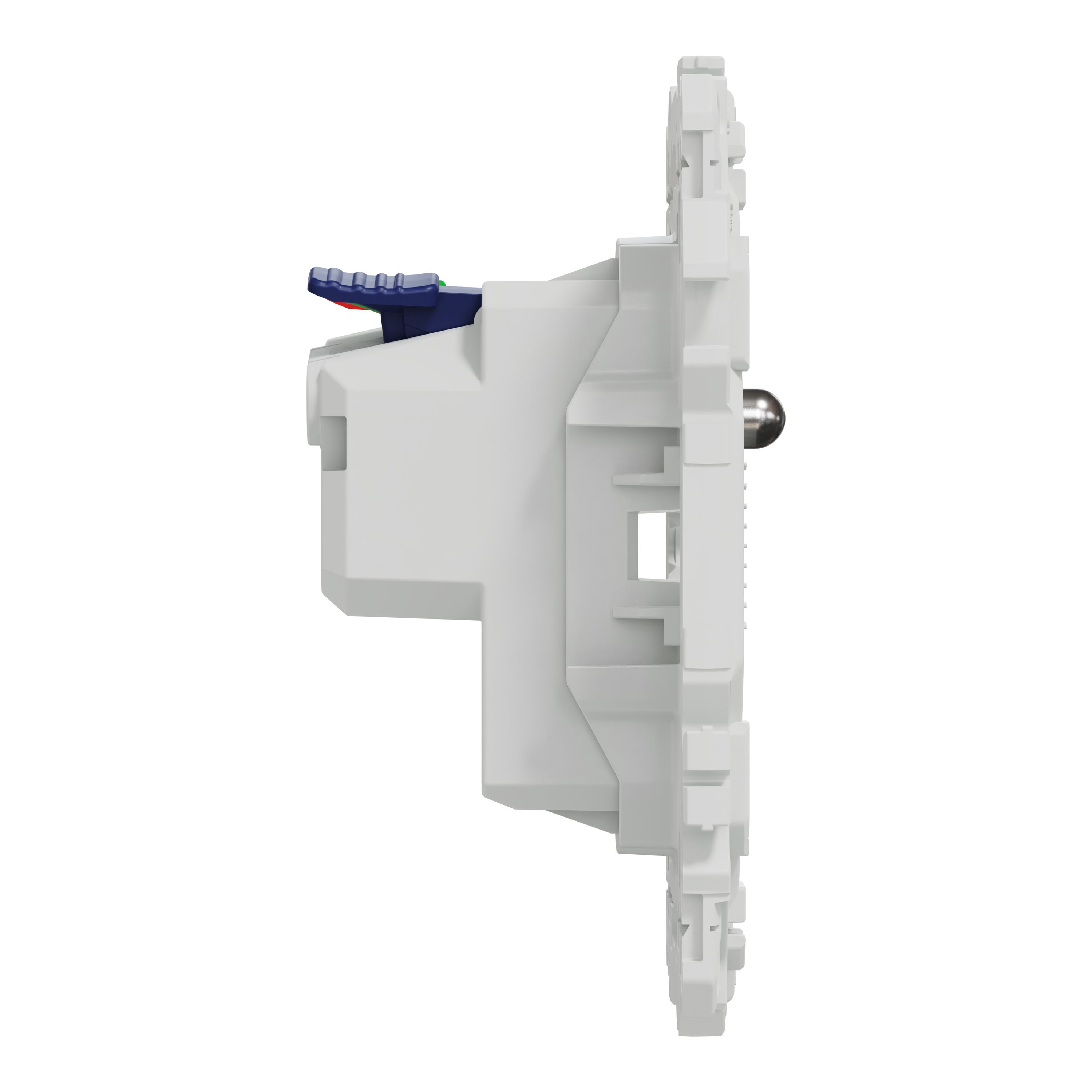 La fixation du mécanisme est facile et robuste sur tout type de boîte d'encastrement grâce à son support rigide à vis ou à griffes clipsables en option idéales pour la rénovation. Le produit dispose d'une connexion rapide et fiable sans outil grâce aux bornes automatiques jusqu'à 2 câbles de 2,5mm². Cette version sans enjoliveur offre la possibilité de choisir la couleur de l'enjoliveur au dernier moment.