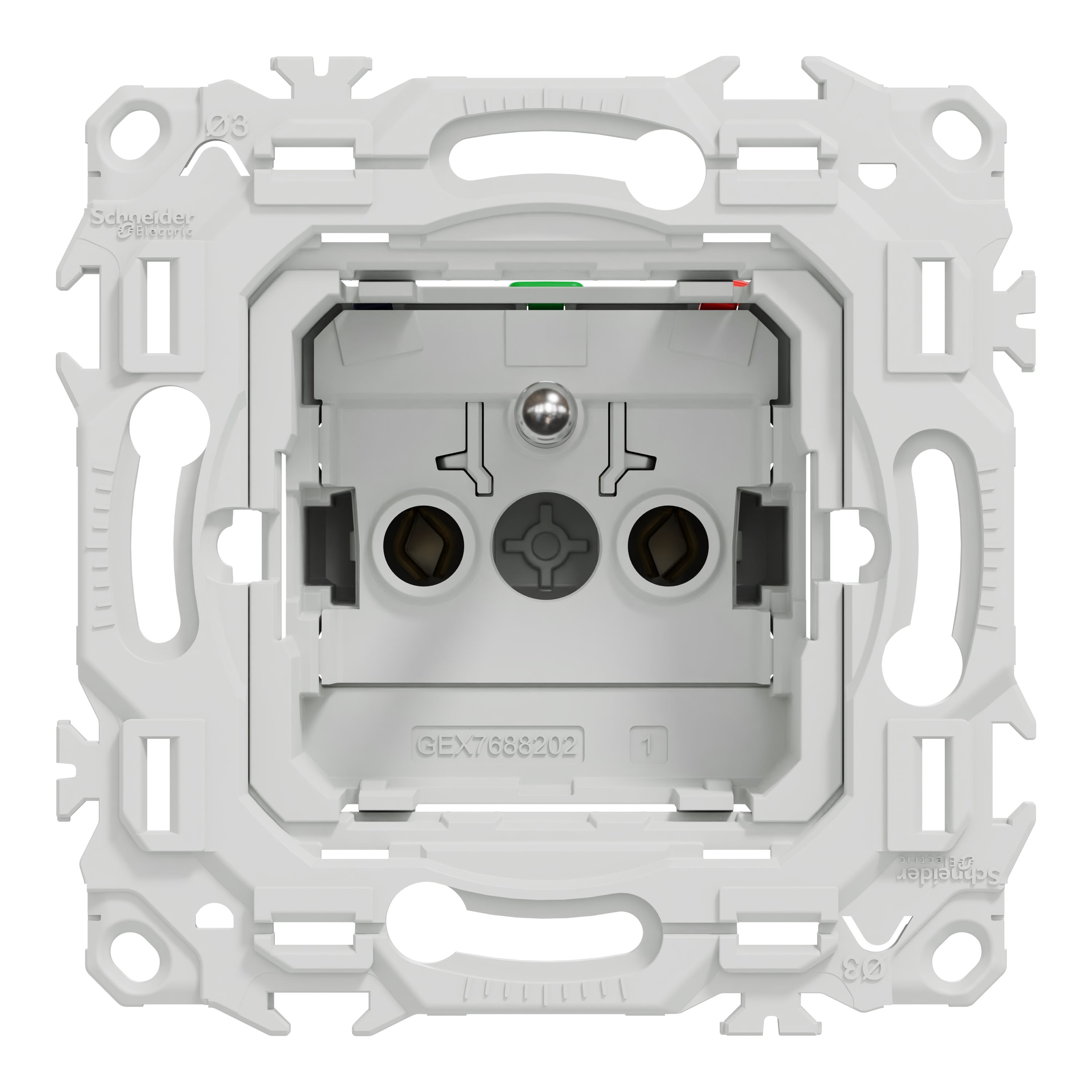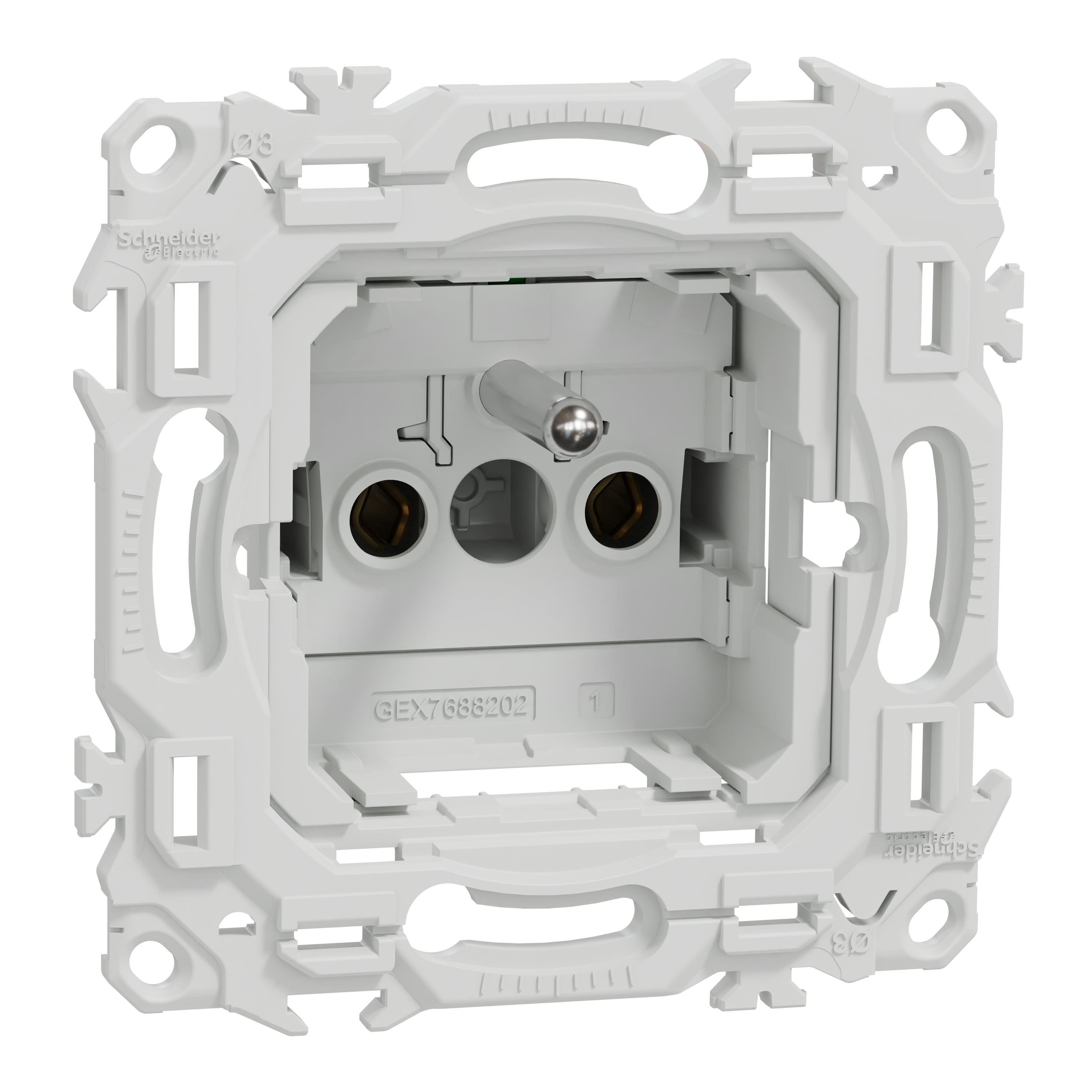 La prise de courant Odace sans enjoliveur est livrée avec son support de fixation intégré et son cache peinture. Elle est à associer à un enjoliveur de prise (blanc ou noir), et une plaque de finition Odace, Odace Métal, Odace Architecte ou Odace Origine.