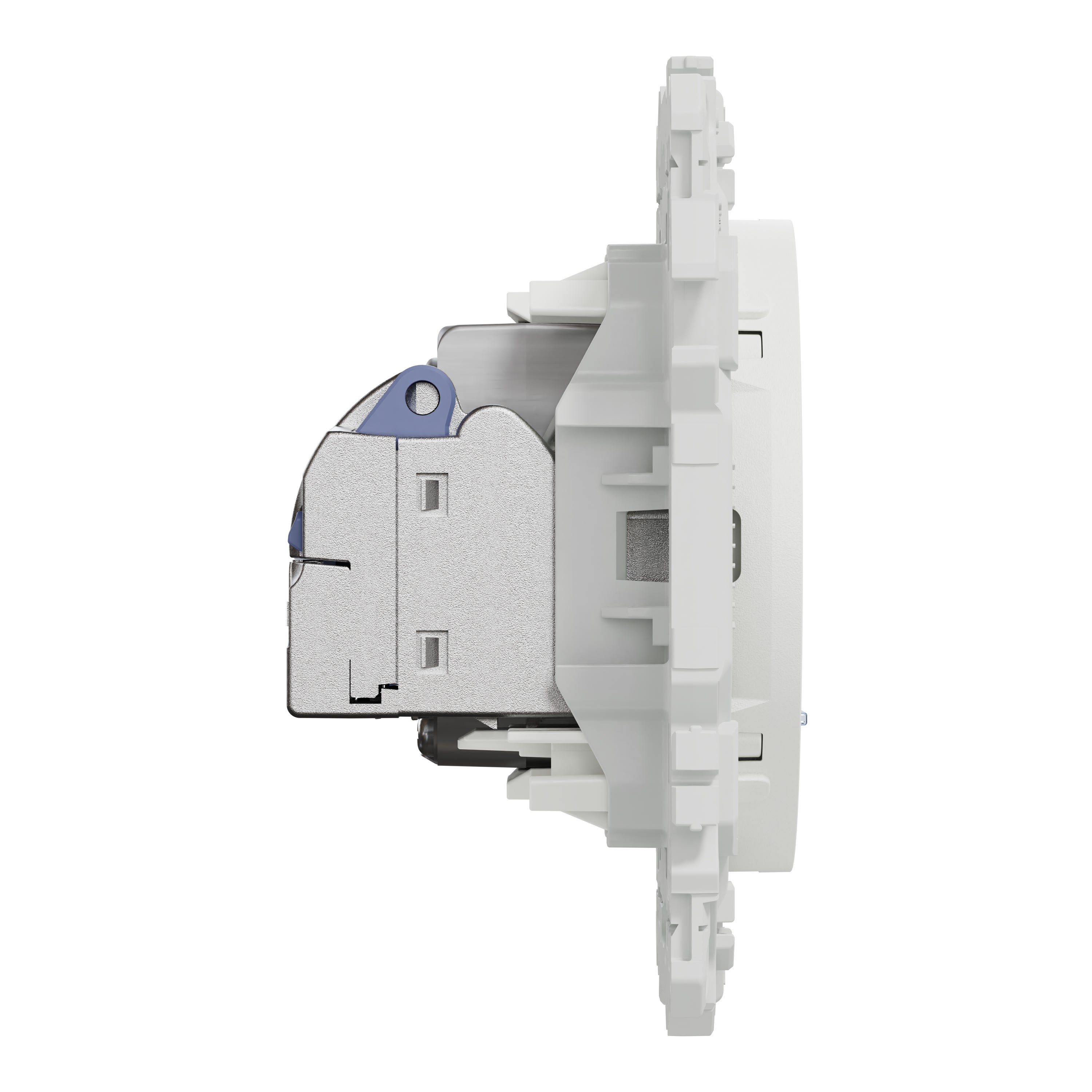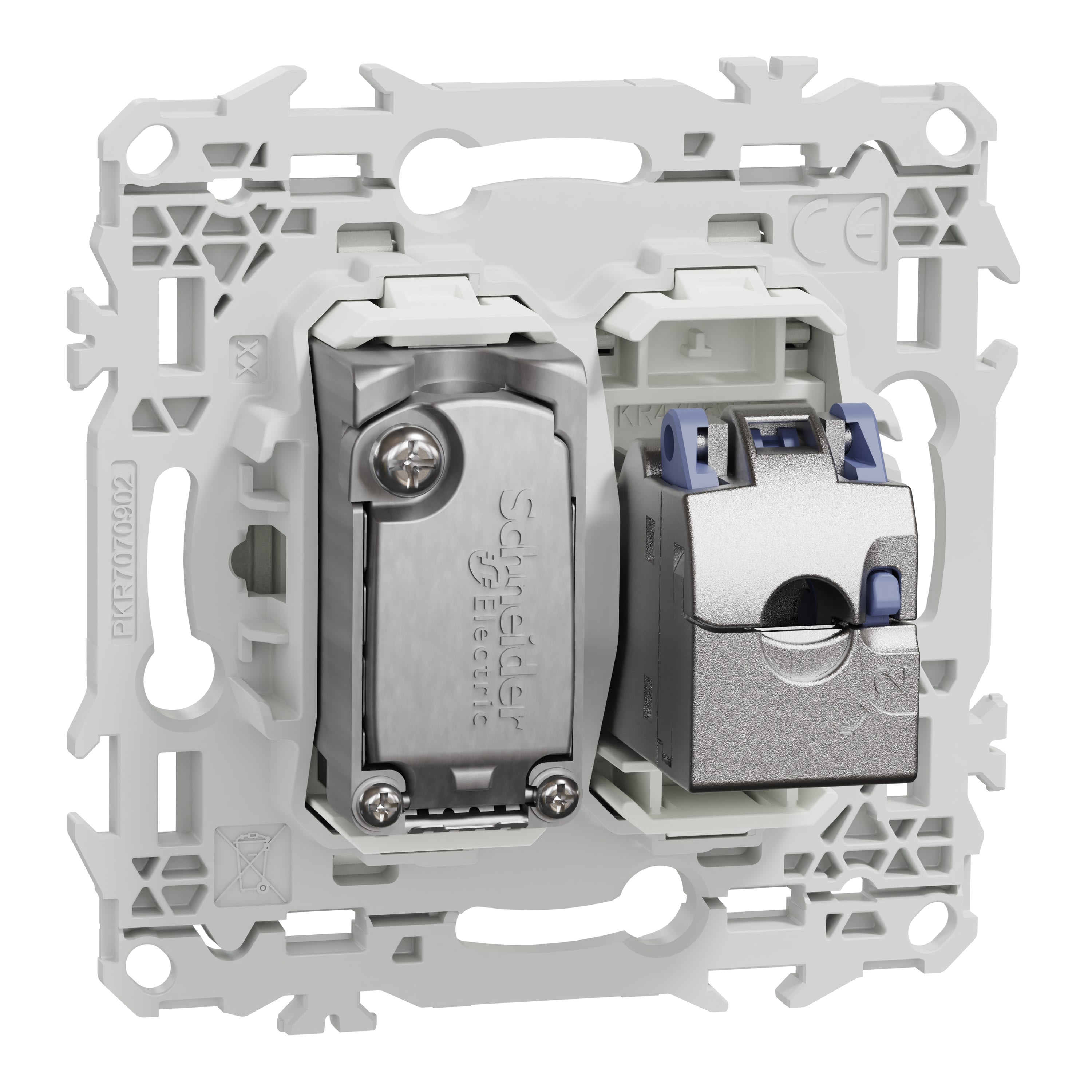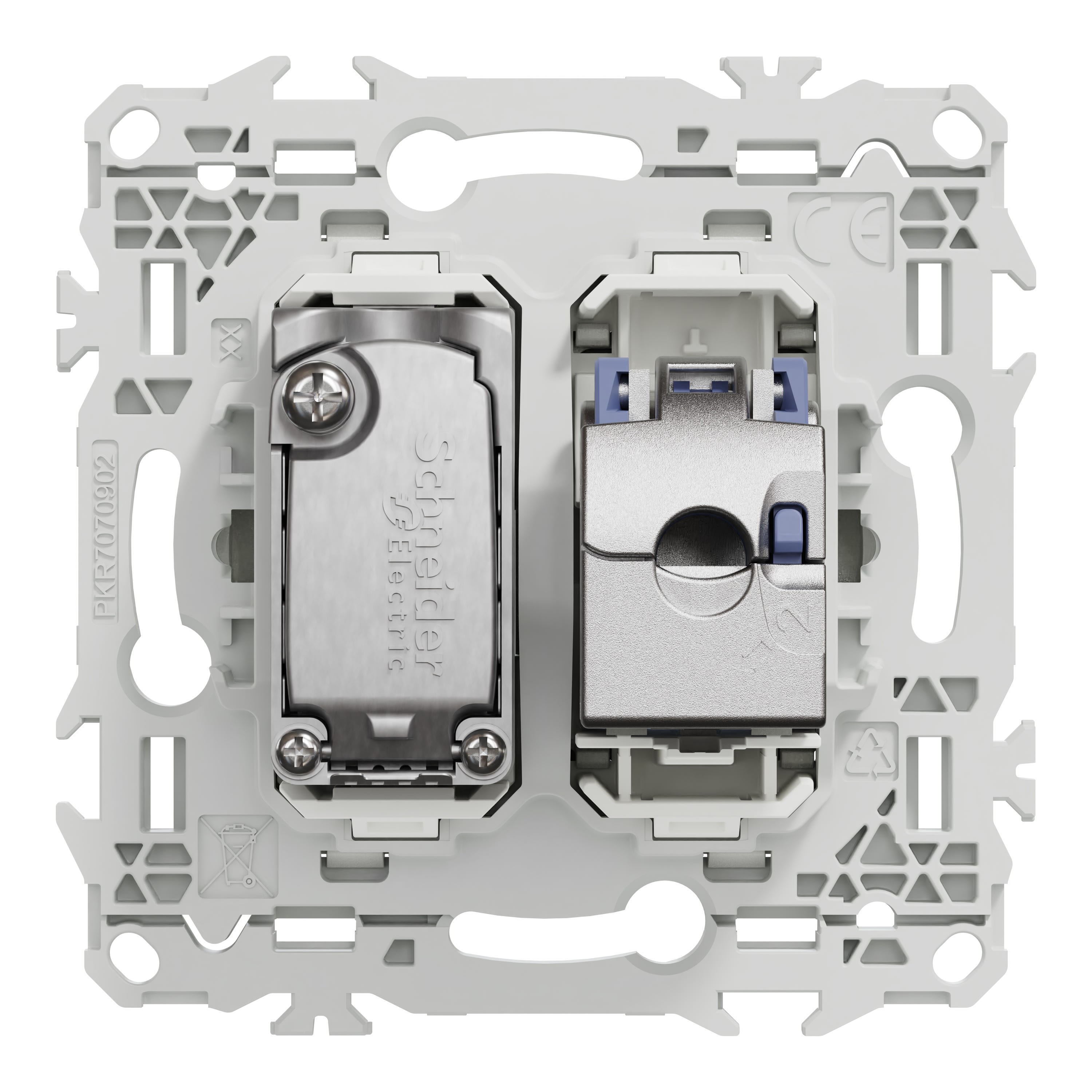 La fixation du mécanisme est facile et robuste sur tout type de boîte d'encastrement grâce à son support rigide à vis ou à griffes clipsables en option idéales pour la rénovation. Le connecteur S-One en 1 seule pièce permet un montage et démontage facile du câble RJ45.