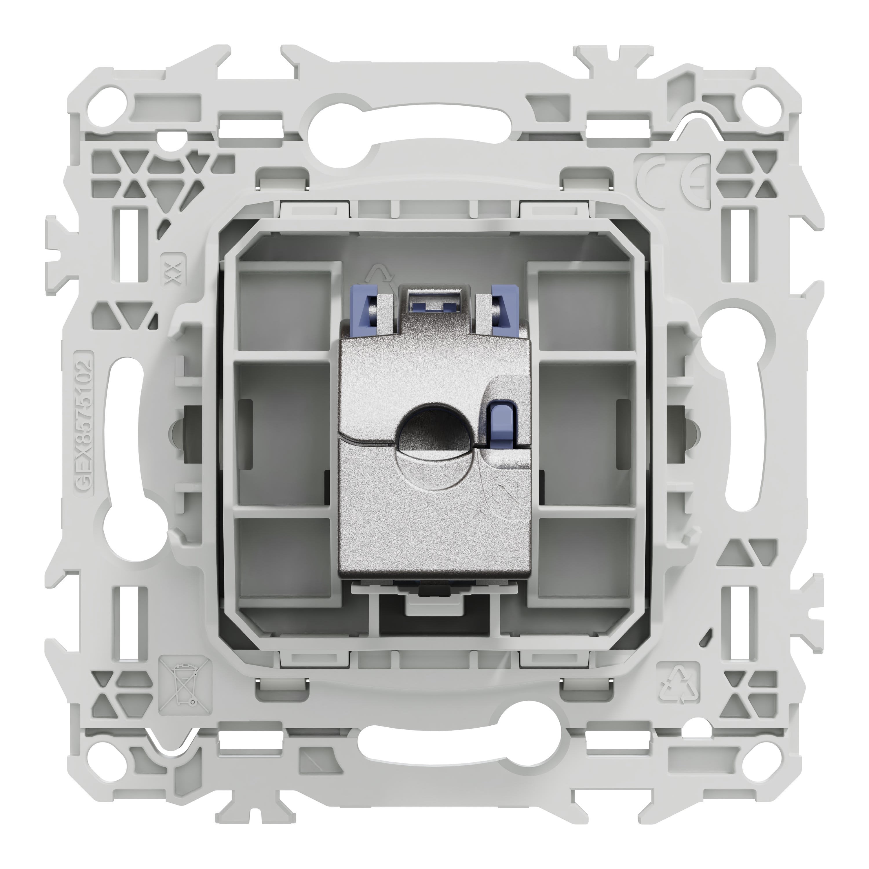 La fixation du mécanisme est facile et robuste sur tout type de boîte d'encastrement grâce à son support rigide à vis ou à griffes clipsables en option idéales pour la rénovation. Le connecteur S-One en 1 seule pièce permet un montage et démontage facile du câble RJ45.