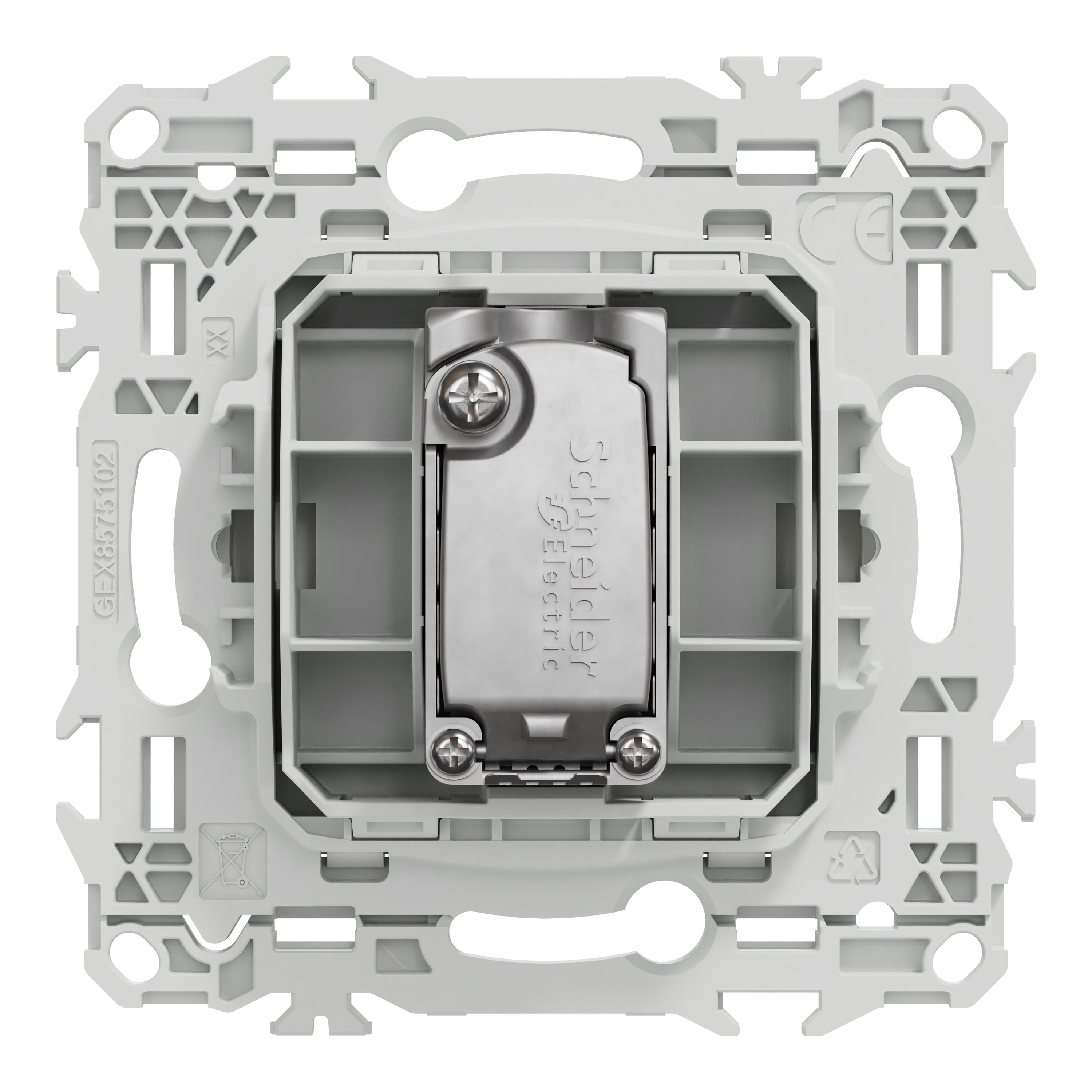 Cette prise télévision prend en charge un câble télé et une sortie coaxiale avec embout mâle. La fixation du mécanisme est facile et robuste sur tout type de boîte d'encastrement grâce à son support rigide à vis ou à griffes clipsables en option idéales pour la rénovation.