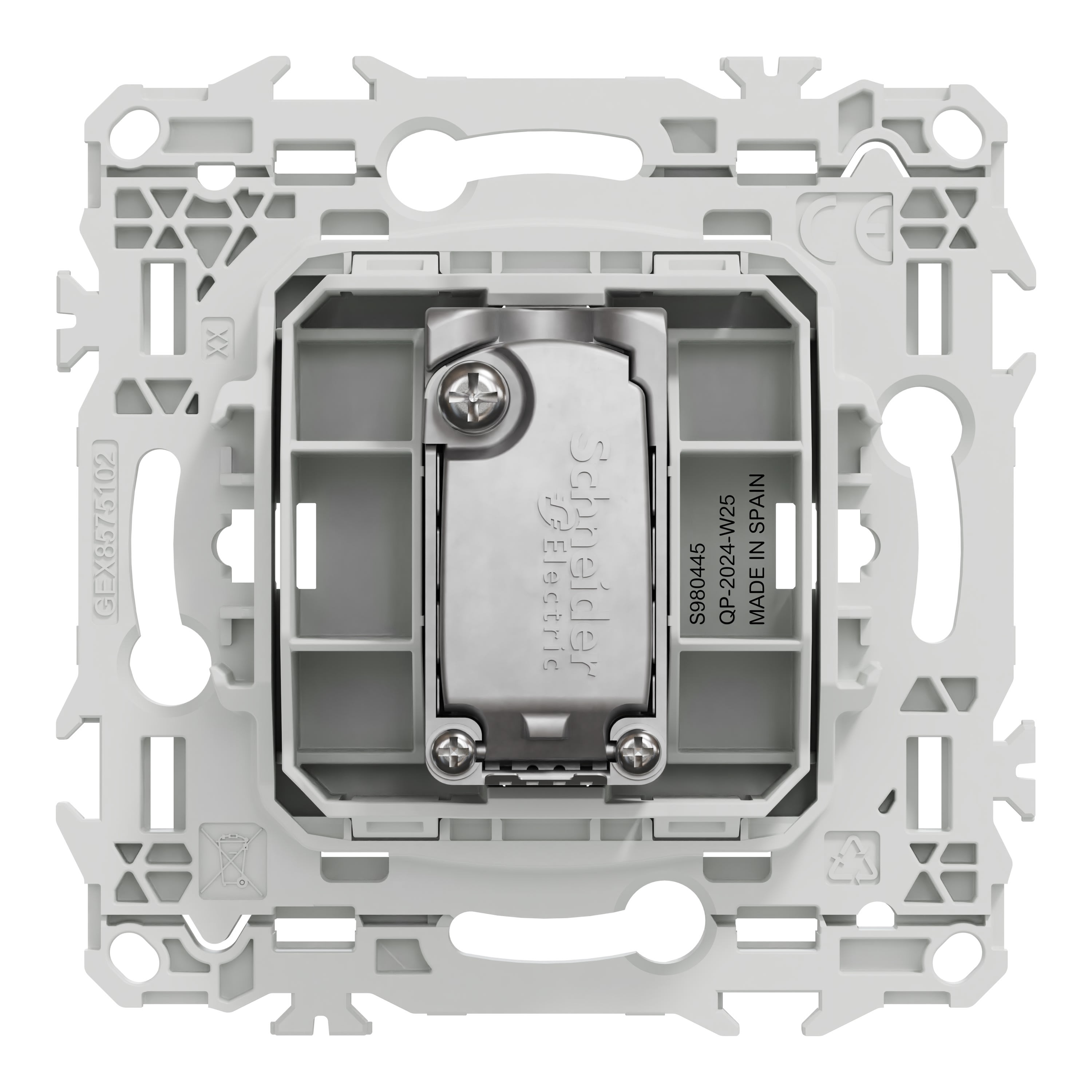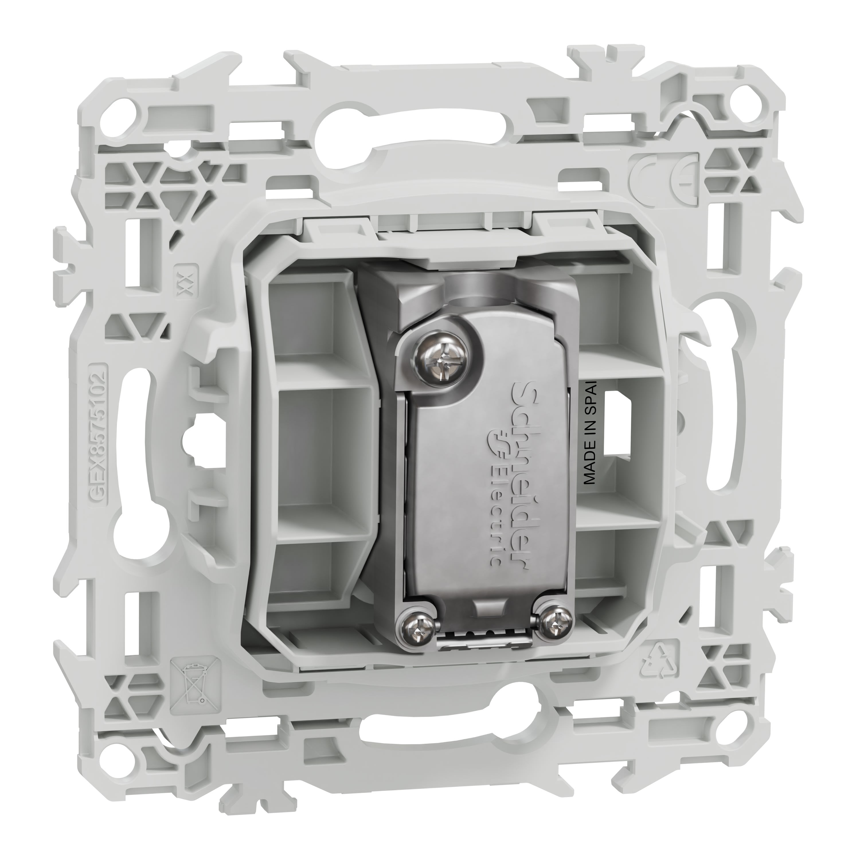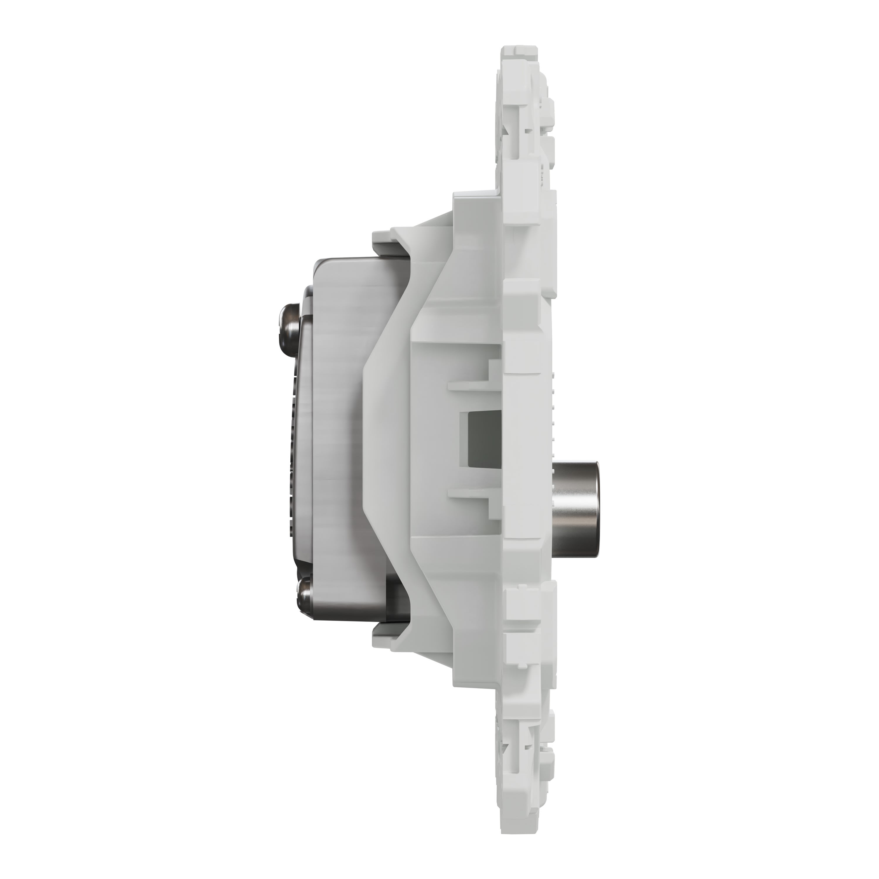 La fixation du mécanisme est facile et robuste sur tout type de boîte d'encastrement grâce à son support rigide à vis ou à griffes clipsables en option idéales pour la rénovation.
