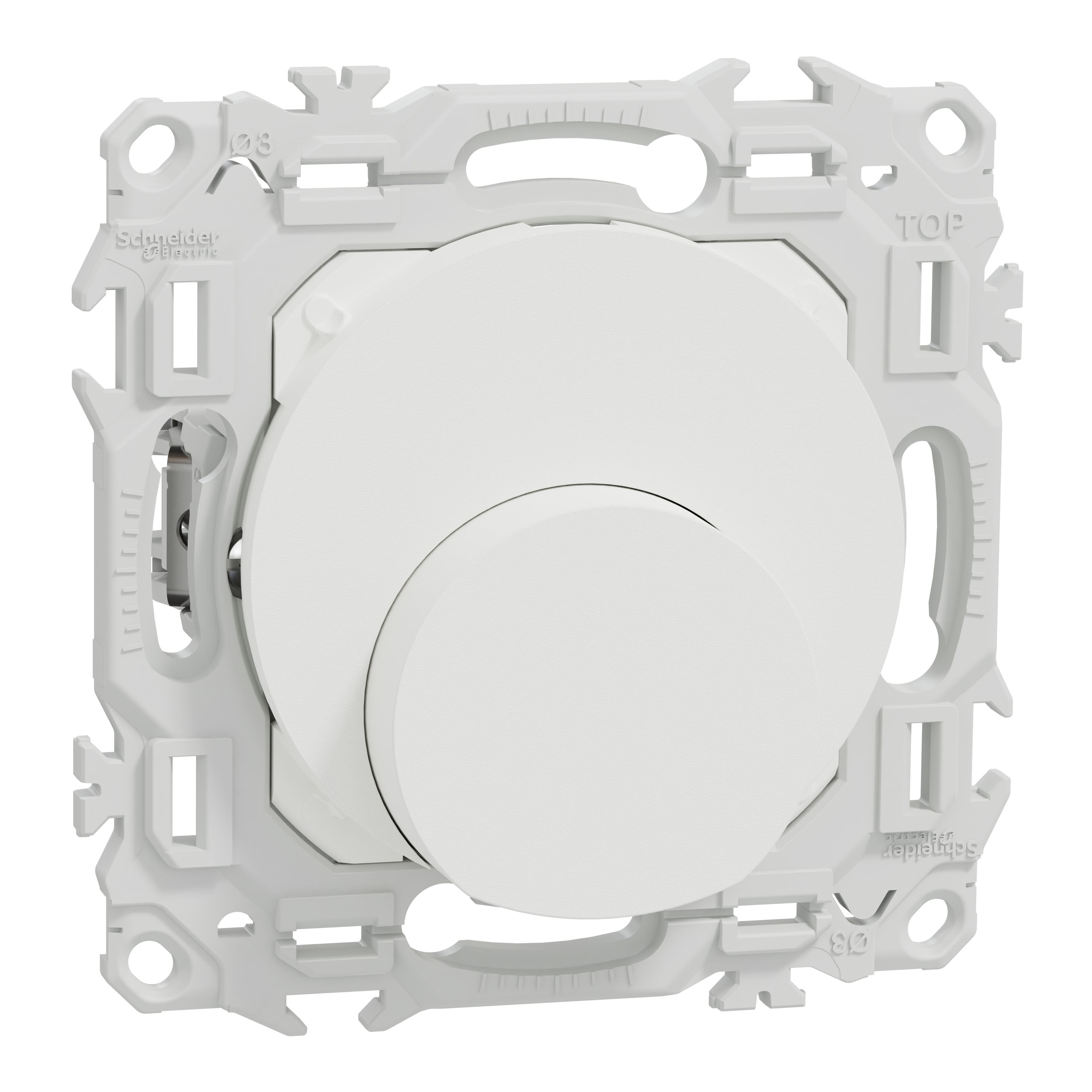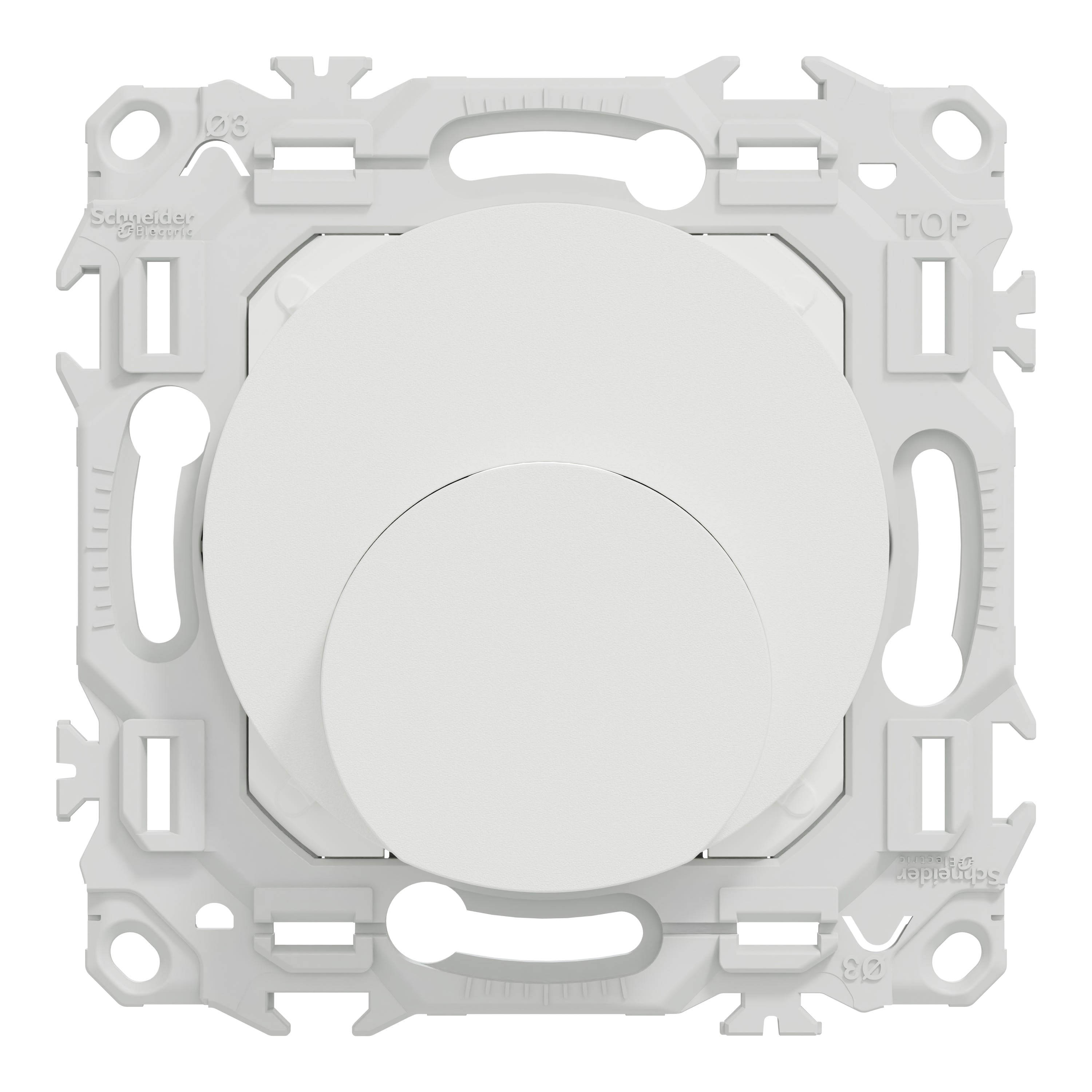 La sortie de câble Odace est livrée avec son support de fixation intégré, ses griffes montées, et son cache peinture. Elle est à associer à une plaque de finition Odace, Odace Métal, Odace Architecte ou Odace Origine.