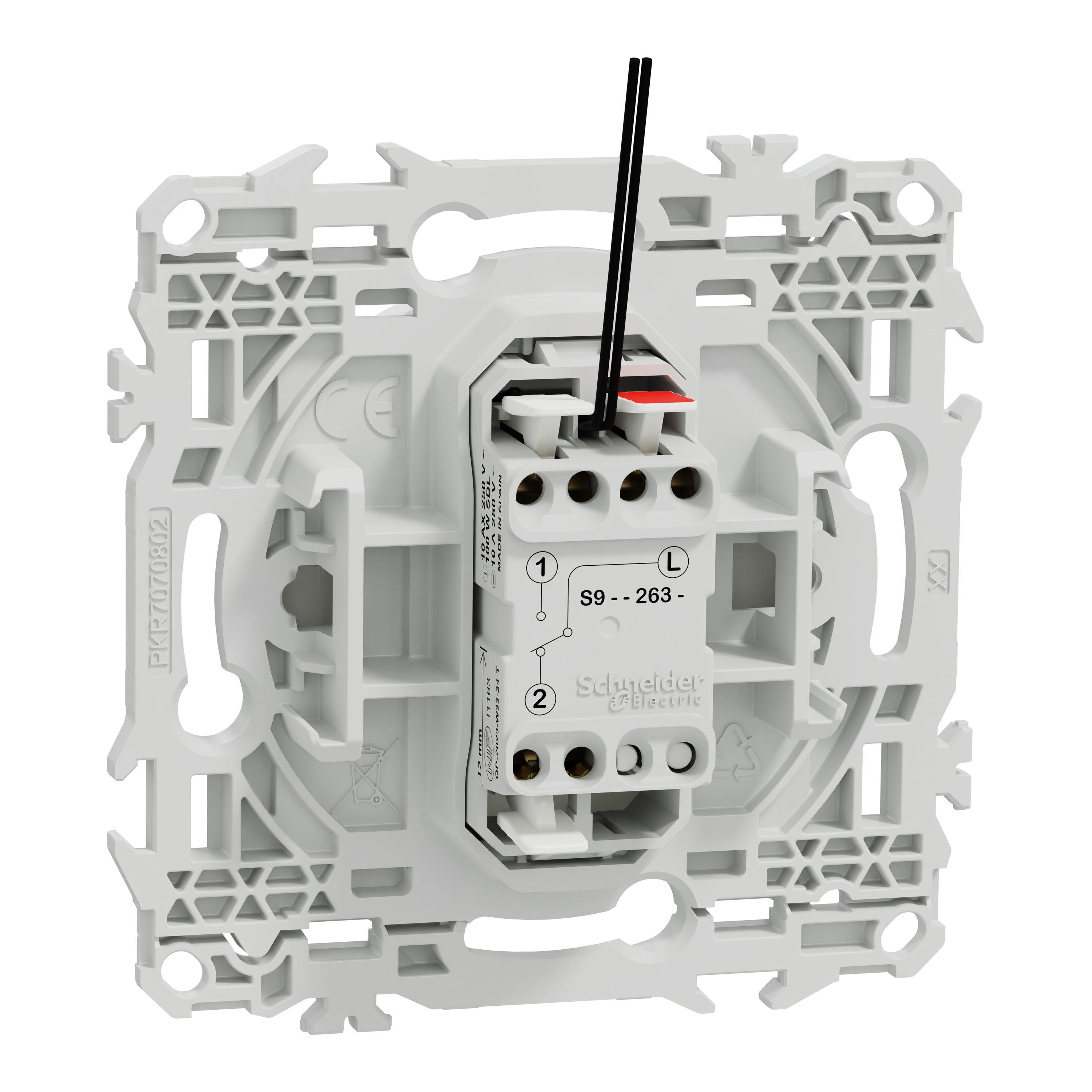 La fixation du mécanisme est facile et robuste sur tout type de boîte d'encastrement grâce à son support rigide à vis ou à griffes clipsables en option idéales pour la rénovation. Le produit dispose de 3 bornes automatiques jusqu'à 2 câbles de 1,5mm² rigides ou souples & multibrins pour chaque pôle, pour une installation plus rapide et fiable, réduisant le temps de montage et minimisant les risques d’erreur.