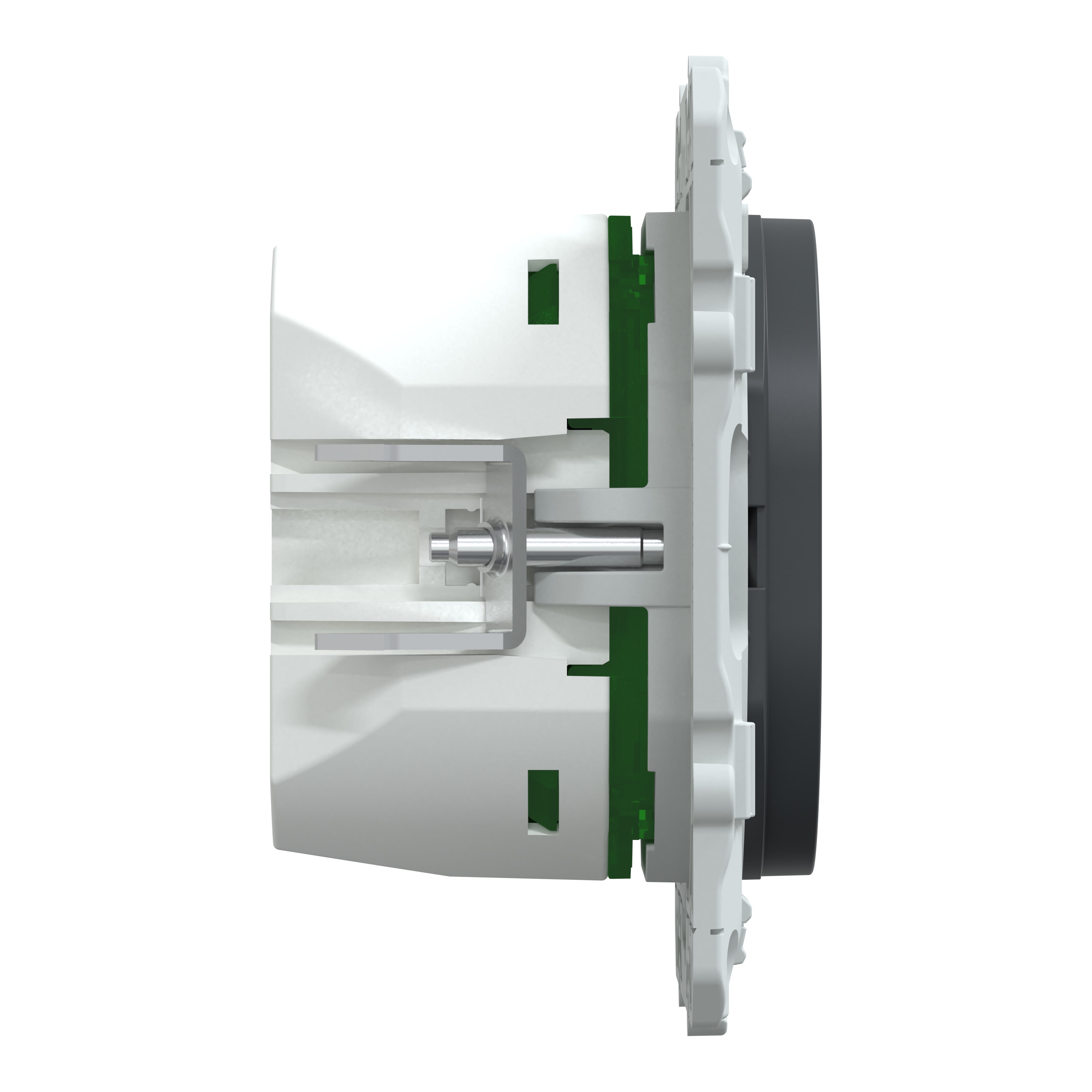 S340406 se compose d'un support de fixation pour boîte d'encastrement, d'un mécanisme avec le chargeur type C 65W et d'un enjoliveur gris anthracite. Son support de fixation intégré permet l'installation sur une boîte et la fixation de sa plaque de finition à acheter séparément. Cache peinture de protection fourni (en plastique PET recyclé/recyclable).