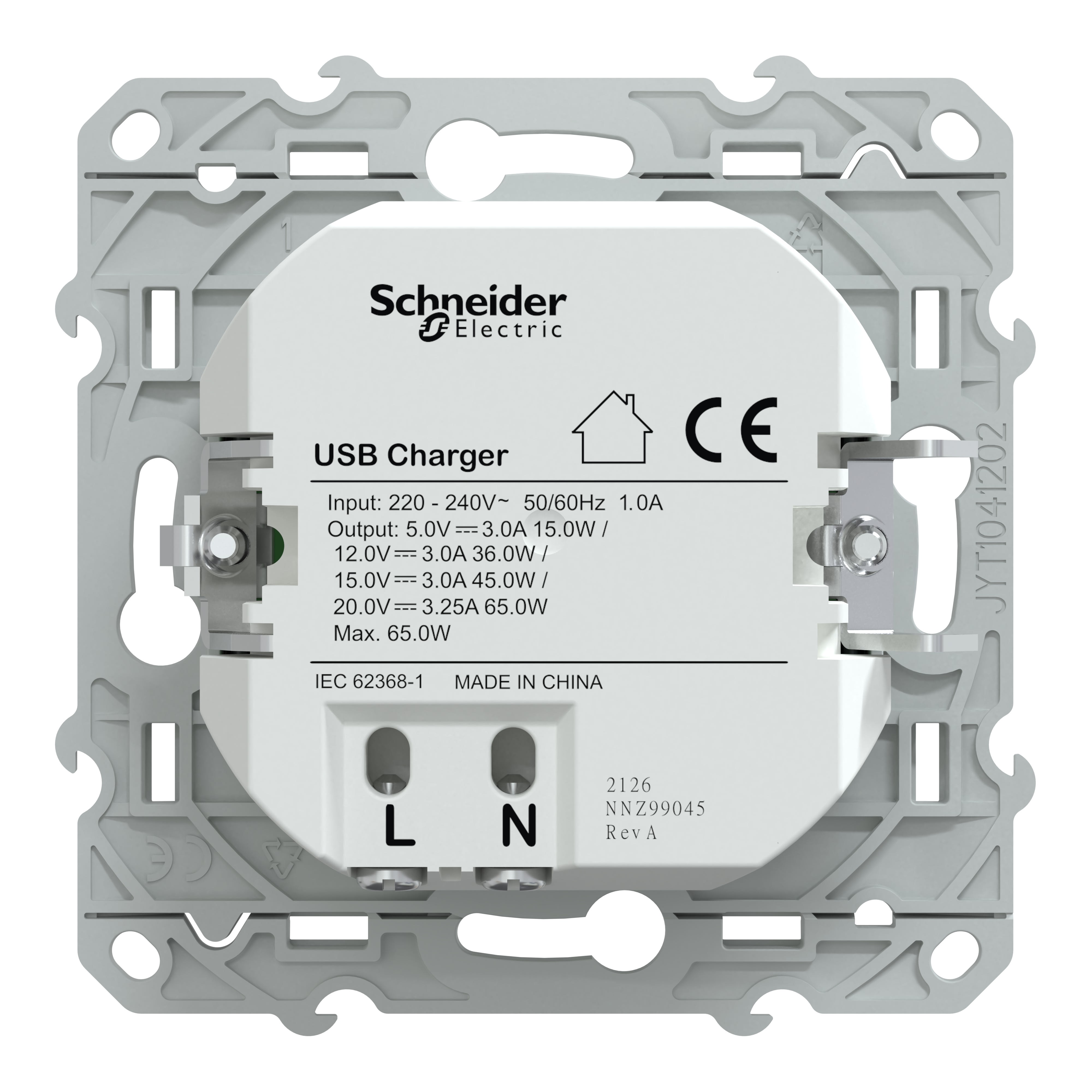 Ce chargeur USB-C 65W de forte puissance permet d'alimenter smartphones, tablettes, et ordinateurs portables. Son faible encombrement offre une meilleure facilité de câblage. Ce chargeur USB est conforme à la directive CEE sur l'harmonisation du standard de recharge de terminaux portables et la réduction des chargeurs mobiles à partir de 2024. Il s'installe dans une boîte d'encastrement en simple poste ou multipostes 57 ou 71mm. Son design contemporain et sa signature unique avec le doigt oblong répondra à vos besoins d'une intégration esthétique parfaite et discrète.