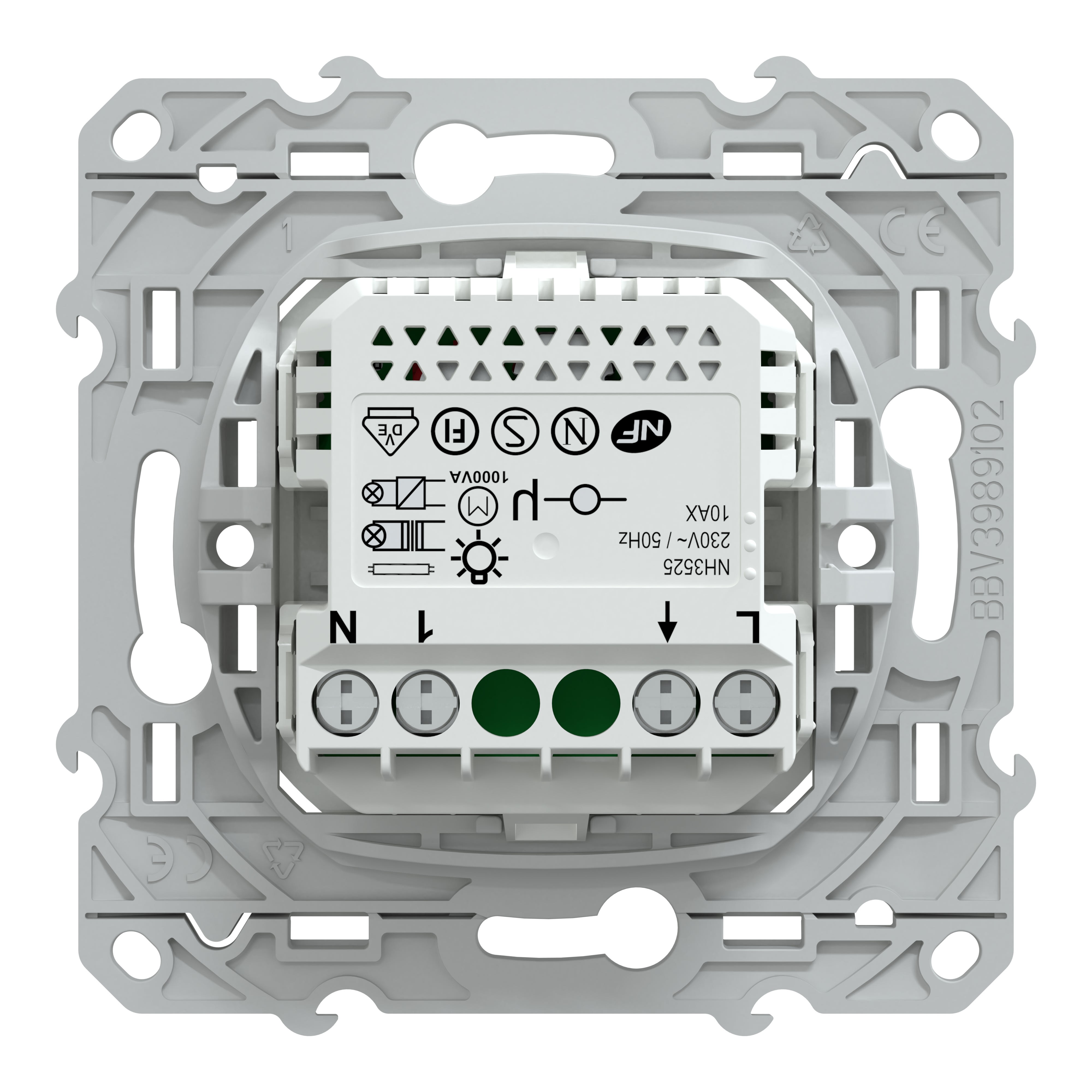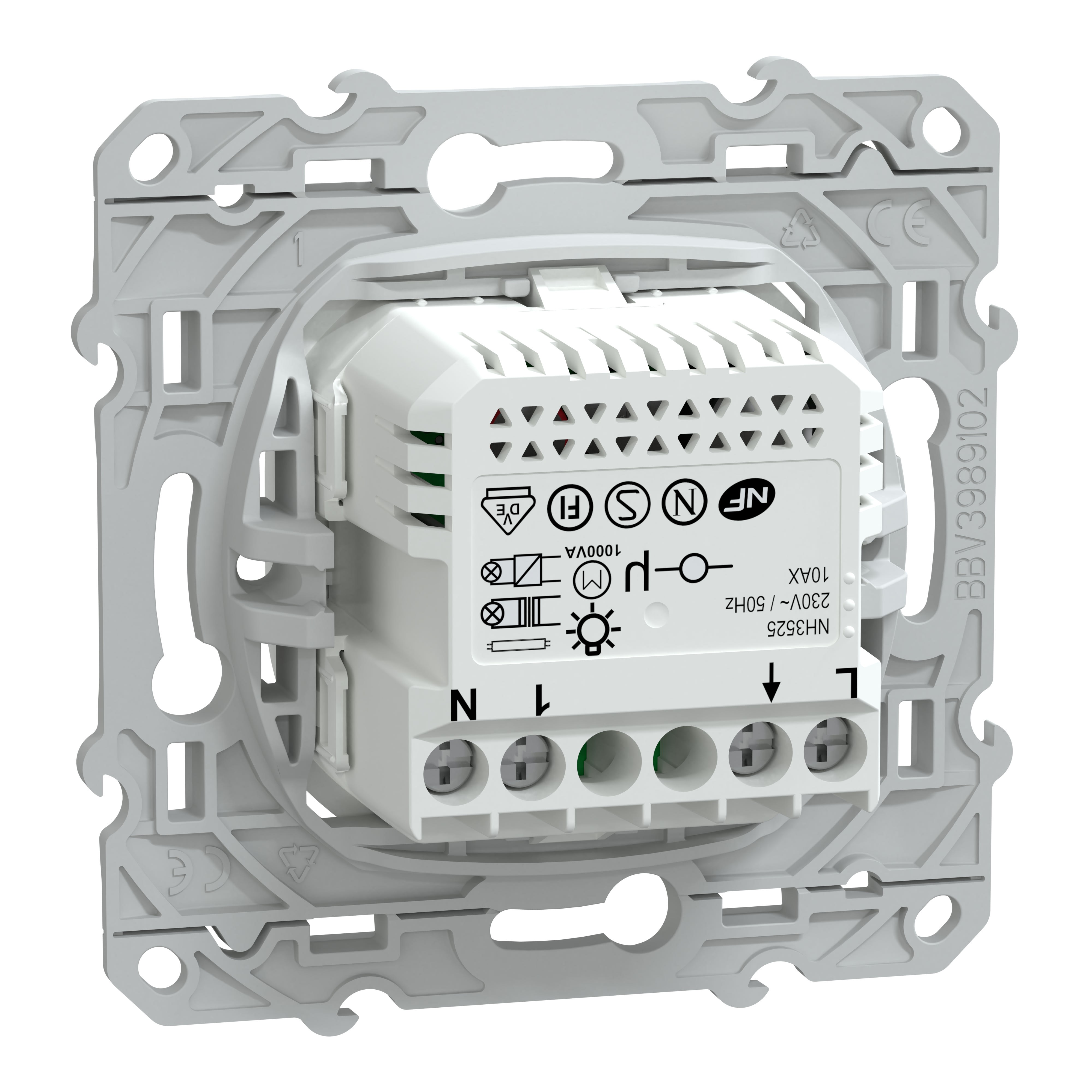 Le câblage de ce détecteur se fait avec 3 bornes à vis phase, retour lampe et neutre. Avec son mécanisme réduit, il peut s'installer dans une boîte de 40mm. La robustesse du mécanisme permet une installation fiable/durable. Les poussoirs de déconnexion sont ergonomiques et avec un code couleur pour une identification rapide du câblage et une pose sans erreur. Le cache peinture permet de protéger les mécanismes quand ils sont posés avant le passage du peintre. Il est transparent, en plastique PET recyclé et recyclable et permet l'installation du mécanisme sans démontage du cache.