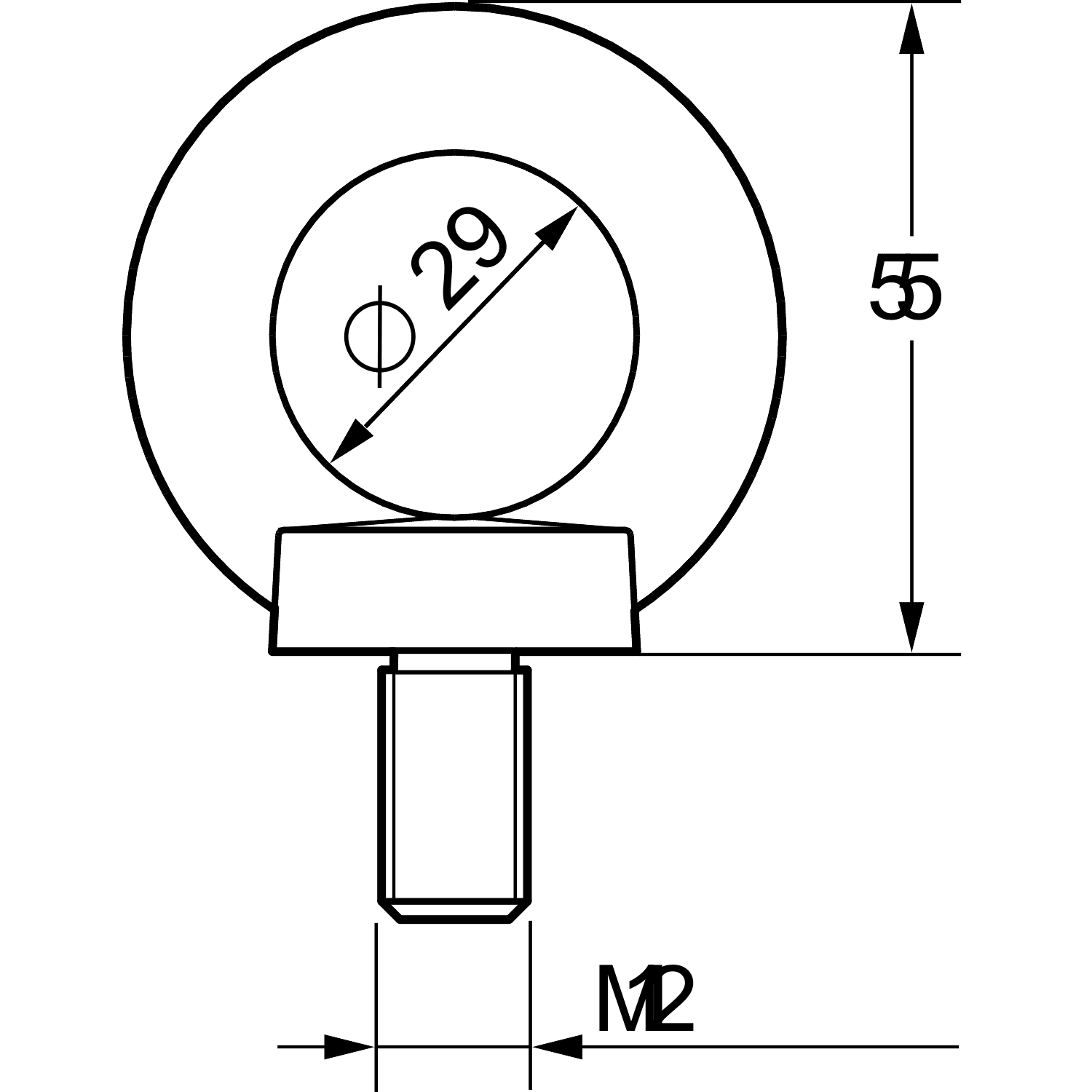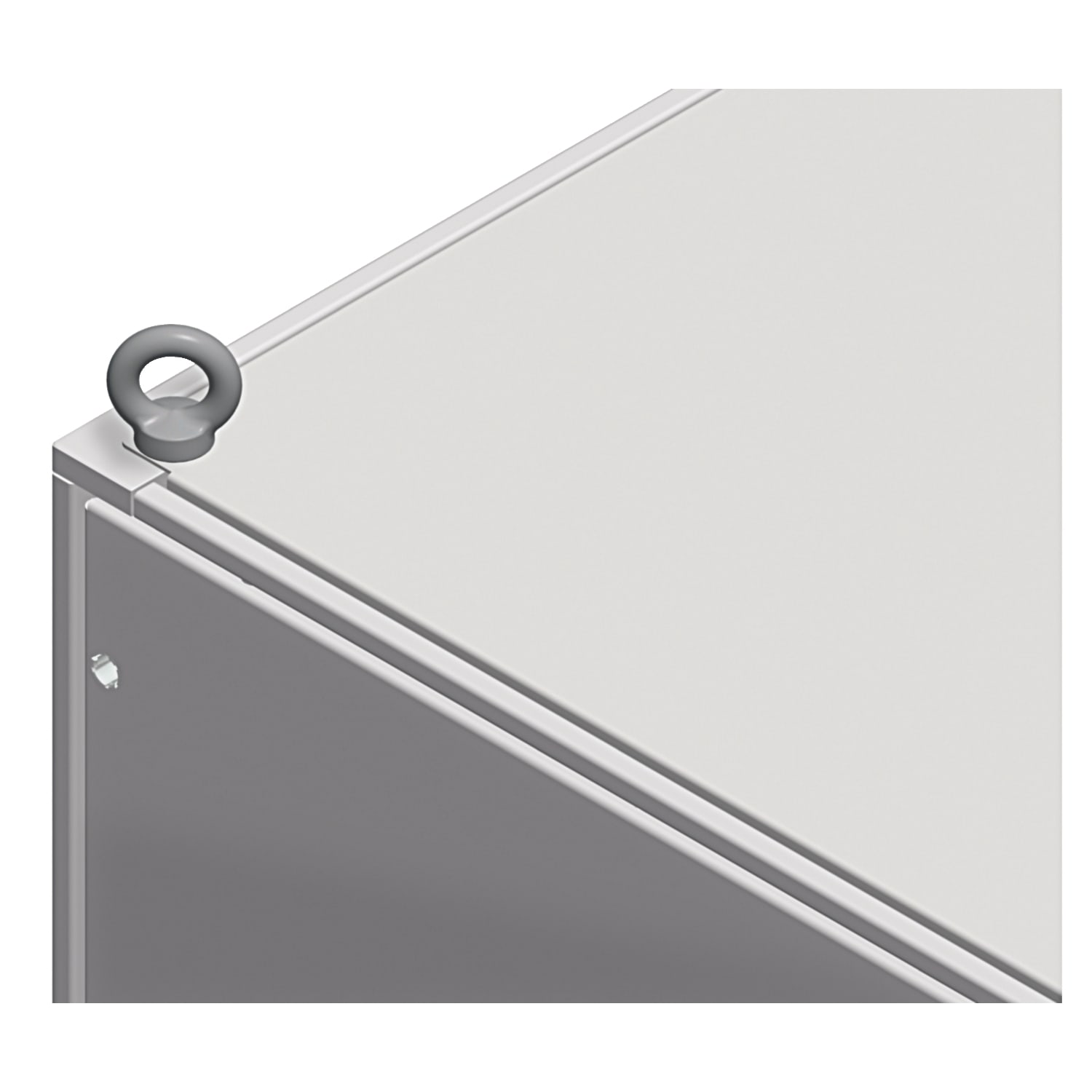 Jeu d'anneaux de levage à visser avec filetage ISO M12 pour enveloppes PanelSeT SF / SFHD / SFM et armoire Prisma PH. (H) 62,5 mm x (L) 55 mm x (P) 24 mm. Montage sur le dessus du coffret. Appui directement dans l'axe des montants. Charge permanente admissible 1360 kg élingage à 60 °. Acier moulé, finition de surface galvanisée.Jeu de 4 articles.