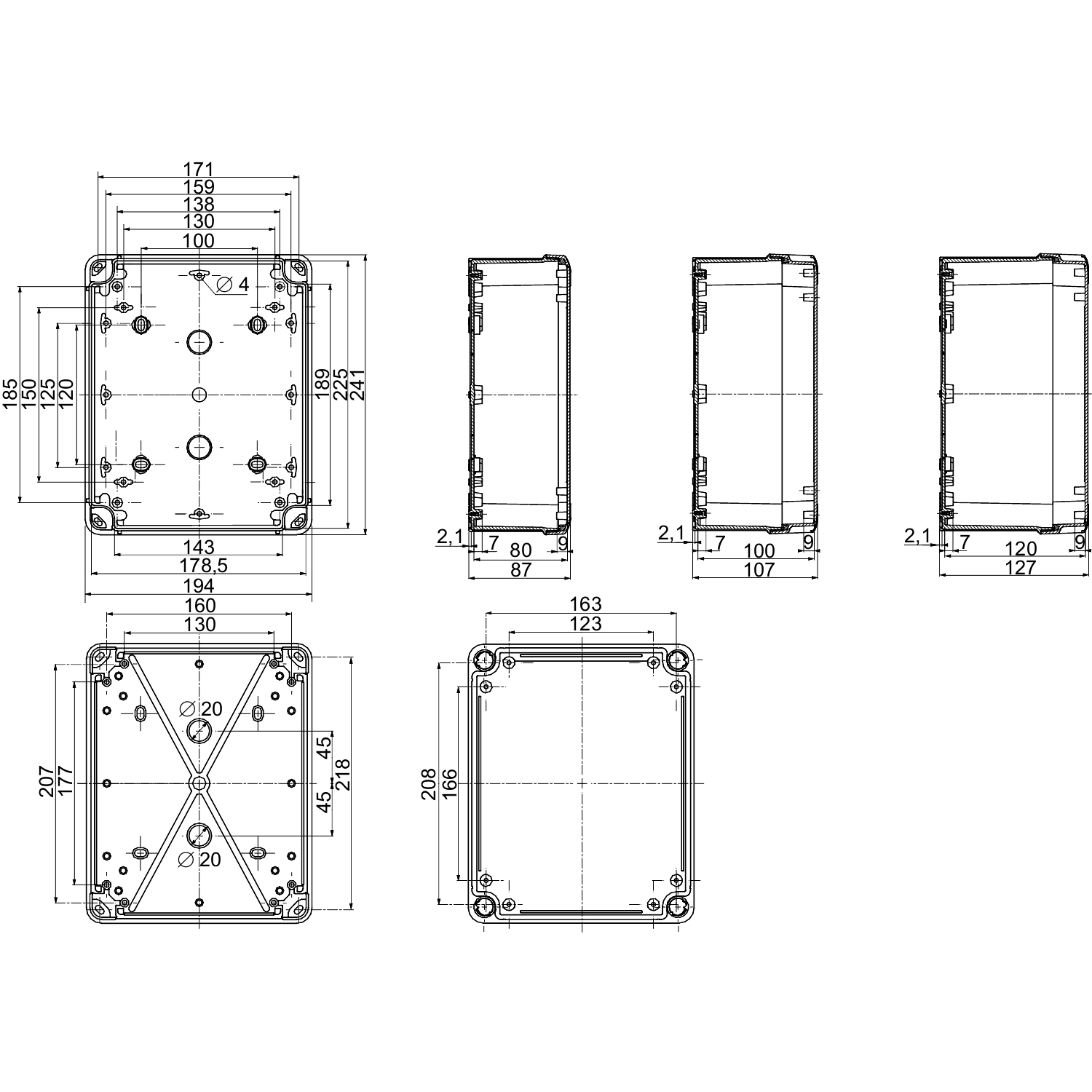 Ce TBP est un boîtier mural en polycarbonate. Il est conçu pour des applications polyvalentes et peut être utilisé à l'intérieur ou à l'extérieur Il est gris (RAL 7035). Les dimensions intérieures de la boîte sont de 225mm x 175mm x 100mm. Le couvercle est fermé par quatre vis plates imperdables situées à l'extérieur de la zone scellée du boîtier pour conserver l'IP. Son isolation électrique est de classe II, pour éviter les chocs électriques et pour des solutions totalement isolées. Il résiste également au feu jusqu'à 960°C conformément à la norme IEC 62208. Le boîtier offre une haute protection contre la poussière et l'eau avec un indice IP66 (NEMA 4,4X) et une grande résistance aux chocs avec un indice IK08 (IEC 62262). Il peut être stocké à des températures comprises entre -15 et 60 °C et utilisé entre -25 et 80 °C sans affecter ses performances. Le produit est certifié UL.