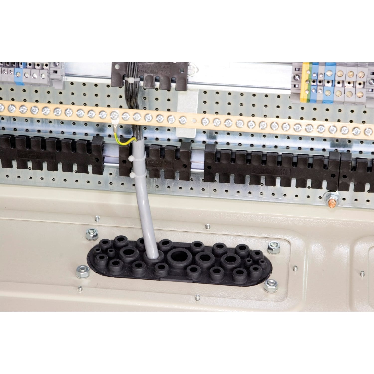 Membrane passe-câbles type FL21 pour coffrets PanelSeT S3D, PanelSeT CRN et PanelSeT SF. Les 27 entrées permettent une utilisation polyvalente avec des câbles allant de 5 mm à 26 mm de diamètre. Les 27 diamètres d'entrée sont les suivants : 4 entrées allant de 5 mm à 7 mm, 4 entrées allant de 8 mm à 12 mm, 13 entrées allant de 10 mm à 14 mm, 4 entrées allant de 14 mm à 20 mm et 2 entrées allant de 20 mm à 26 mm. La protection IP66 contre l'eau et la poussière est maintenue selon la norme IEC 60529. Le produit peut être utilisé dans une plage de température de -40 ºC à +100 ºC et a une résistance aux flammes de 650 ºC selon UL 94 V0 Les dimensions de découpe sont de 214 mm x 90 mm et les dimensions extérieures sont de 214 mm x 88 mm L'entrée de câble peut être installée sur l'adaptateur de plaque passe-câbles ou directement sur le boîtier. Les éléments de fixation sont livrés avec le produit. Ce produit détient le label Green PremiumTM en raison d'une utilisation minimale de subtances dangereuses.