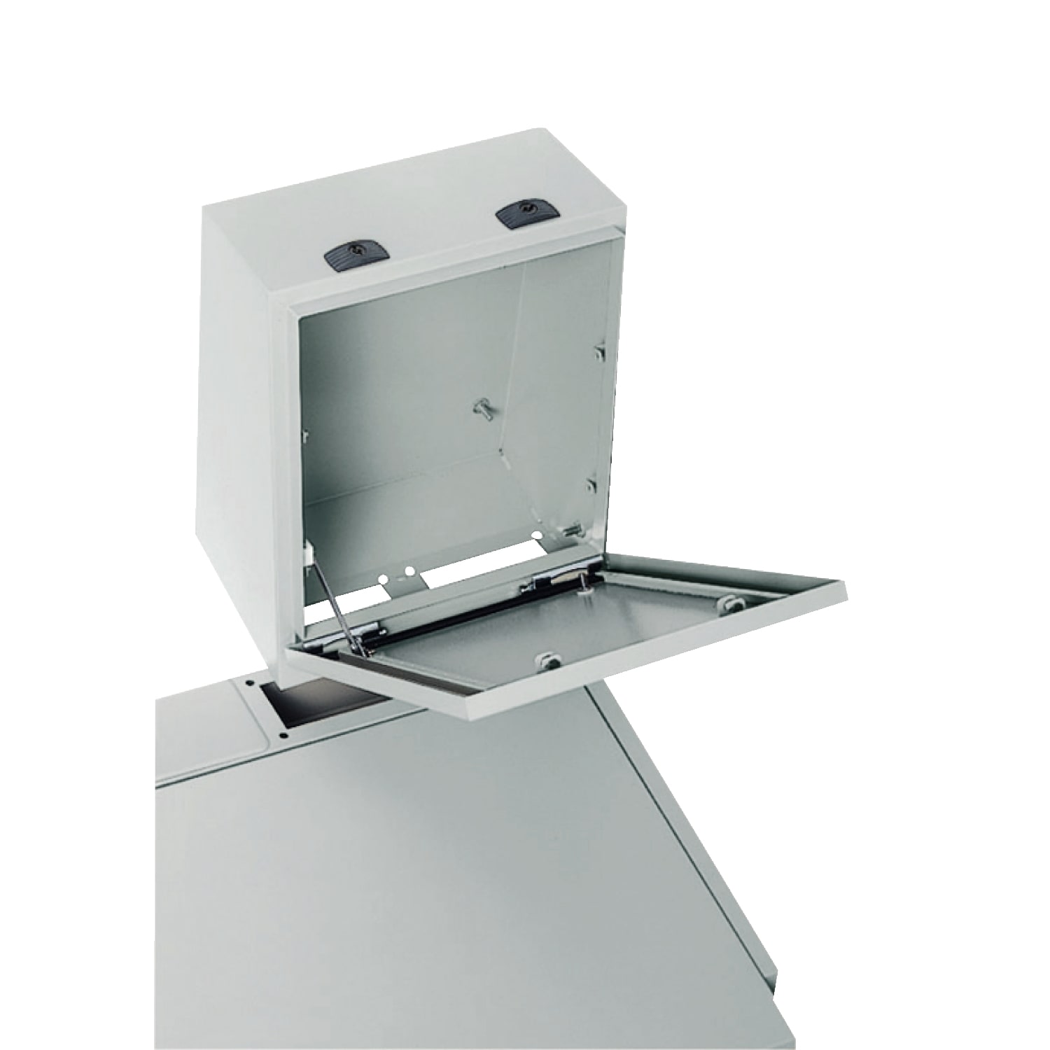 Ce couvercle de console à charnières en tôle d'acier grise de 1,5mm d'épaisseur (RAL 7035) pour PanelSeT SD. La console est équipée d'un compas d'ouverture pneumatique avec angle d'ouverture de 75°. Il se fixe sur le dessus du pupitre. Le verrouillage se fait par serrure double barre de 3mm. La protection anticorrosion est assurée par un revêtement en poudre époxy-polyester. Le kit est composé de 1 porte, 1 carrosserie, 1 retenue, 1 panneau arrière, 4 marches coulissantes et 2 serrures. Son indice de protection est IP55 conformément à la norme CEI 60529. L'indice de protection mécanique est IK10 conformément à la norme CEI 62262.