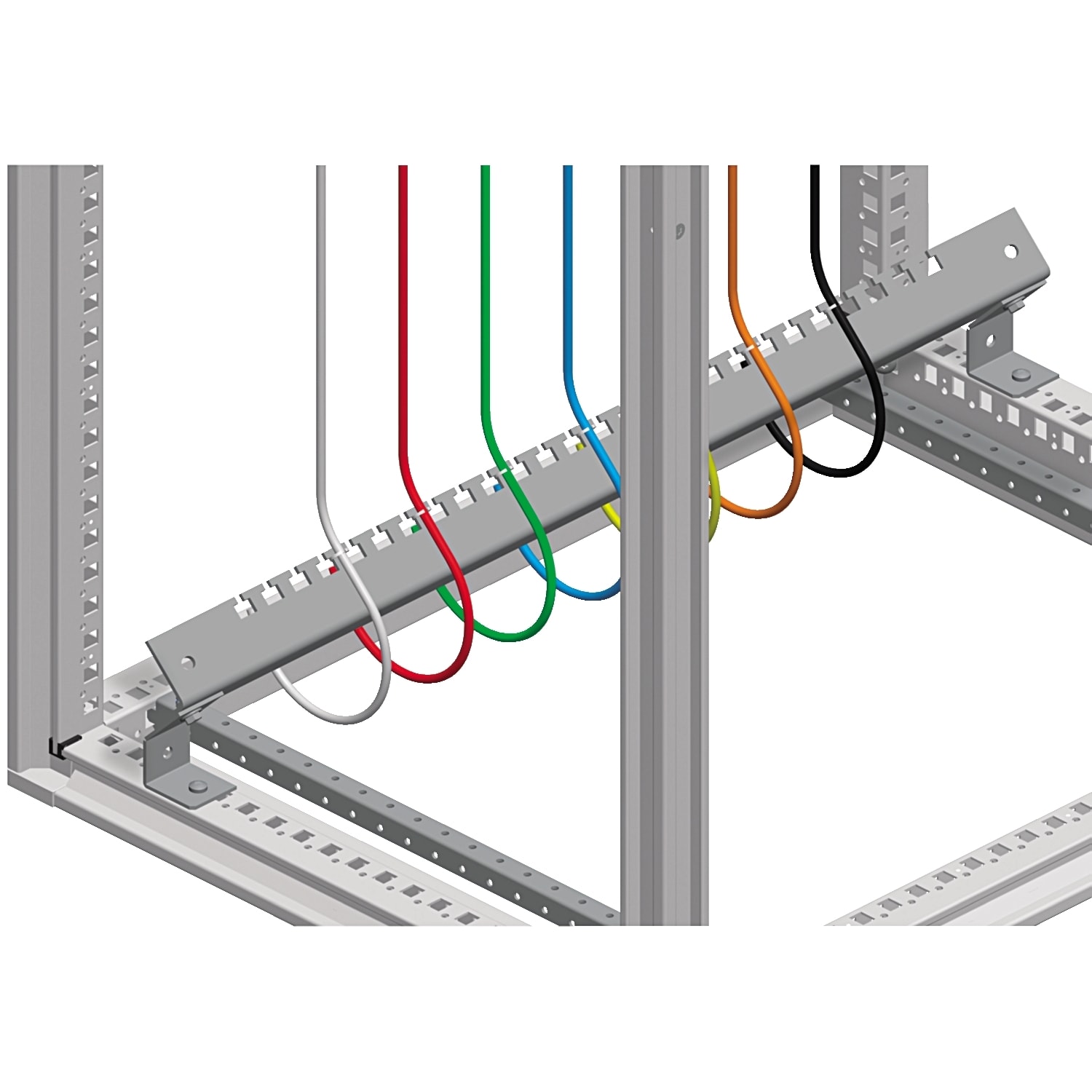 Accessoire polyvalent. 1 rail et éléments de fixation inclus. Permet une fixation simple et rapide de tout câble entrant ou sortant. Acier galvanisé. Montage sur structure d’armoire. Ajustable en profondeur par pas de 25 mm.