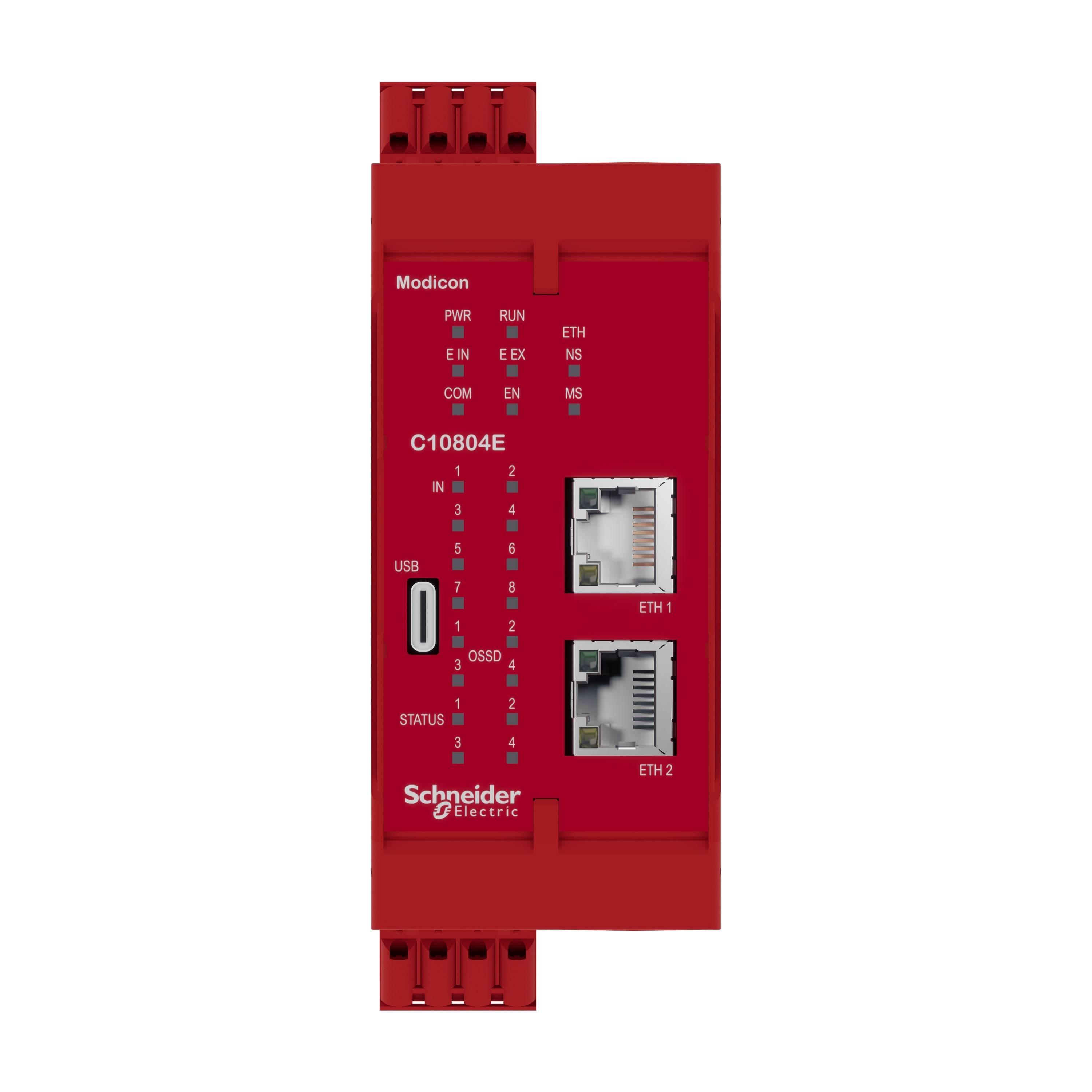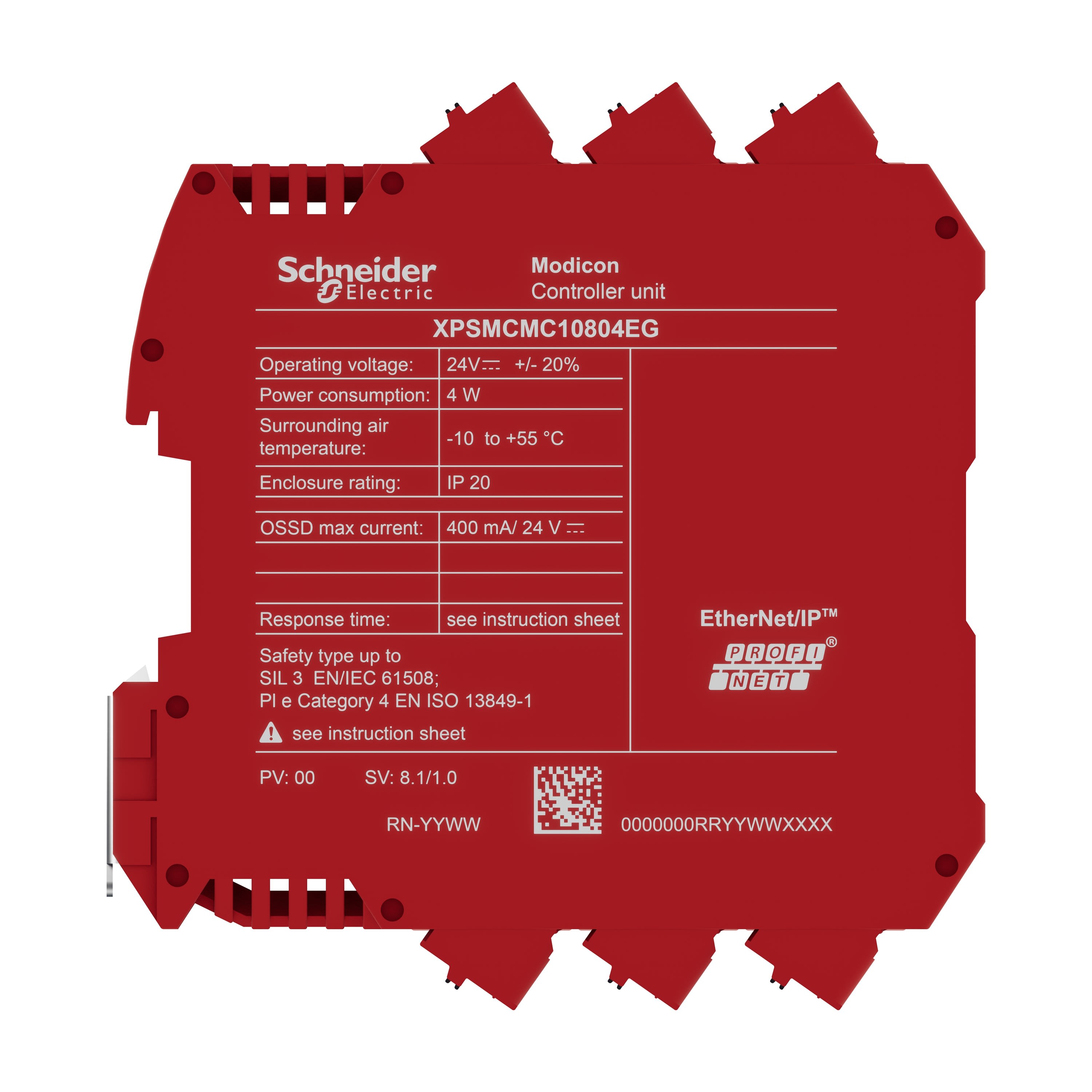 Ce contrôleur de sécurité CPU est conçu pour surveiller à distance les E/S de sécurité et appartient à la gamme Modicon MCM, une gamme de contrôleurs de sécurité modulaires. Il dispose de 8 E/S de sécurité, 4 E/S de sortie à canal unique, 4 sorties d'état, une interface de communication pour 4 protocoles configurables tels que ModbusTCP, Ethernet/IP, EtherCAT, PROFINET. Il comporte des voyants LED sur sa face avant pour afficher l'état, des bornes à ressort amovibles pour le raccordement électrique et est classé IP20. Il peut être utilisé seul ou avec quatorze modules d'extension. Il intègre un connecteur Mini USB 2.0 pour recevoir la configuration effectuée avec le logiciel SoSafe Configurable, ainsi que 2 ports RJ45 basés sur Ethernet. Il a une tension d'alimentation nominale de 24 V CC et une dissipation de puissance maximale de 3 W. Il pèse 0,225 kg. Ses dimensions sont 45 mm (profondeur), 99 mm (hauteur) et 114,5 mm (largeur). Son boîtier est rouge. Il est conçu pour surveiller les arrêts d'urgence, la surveillance des protections, la protection périmétrique, la surveillance de position, la surveillance de vitesse et l'activation des mouvements sur les réseaux Ethernet. Il est certifié par TüV SÜD, RCM, cULus. Il atteint la catégorie 4, PL e, selon les normes EN/ISO 13849-1, SIL CL 3, et IEC/EN 61508, IEC/EN 60261. Il est compatible avec une carte mémoire et les connecteurs du fond de panier. Il est vendu dans un emballage d'1 pièce. Il s'installe sur un rail DIN Omega 35 mm conforme à la norme EN 50022. La gamme Modicon MCM est conçue pour offrir la protection la plus complète possible au personnel et aux équipements. La gamme Modicon MCM est conçue pour fournir des applications de sécurité nécessitant la conformité au niveau de performance PL e/catégorie 4 EN ISO 13849-1 et SIL3 EN/IEC 61508.