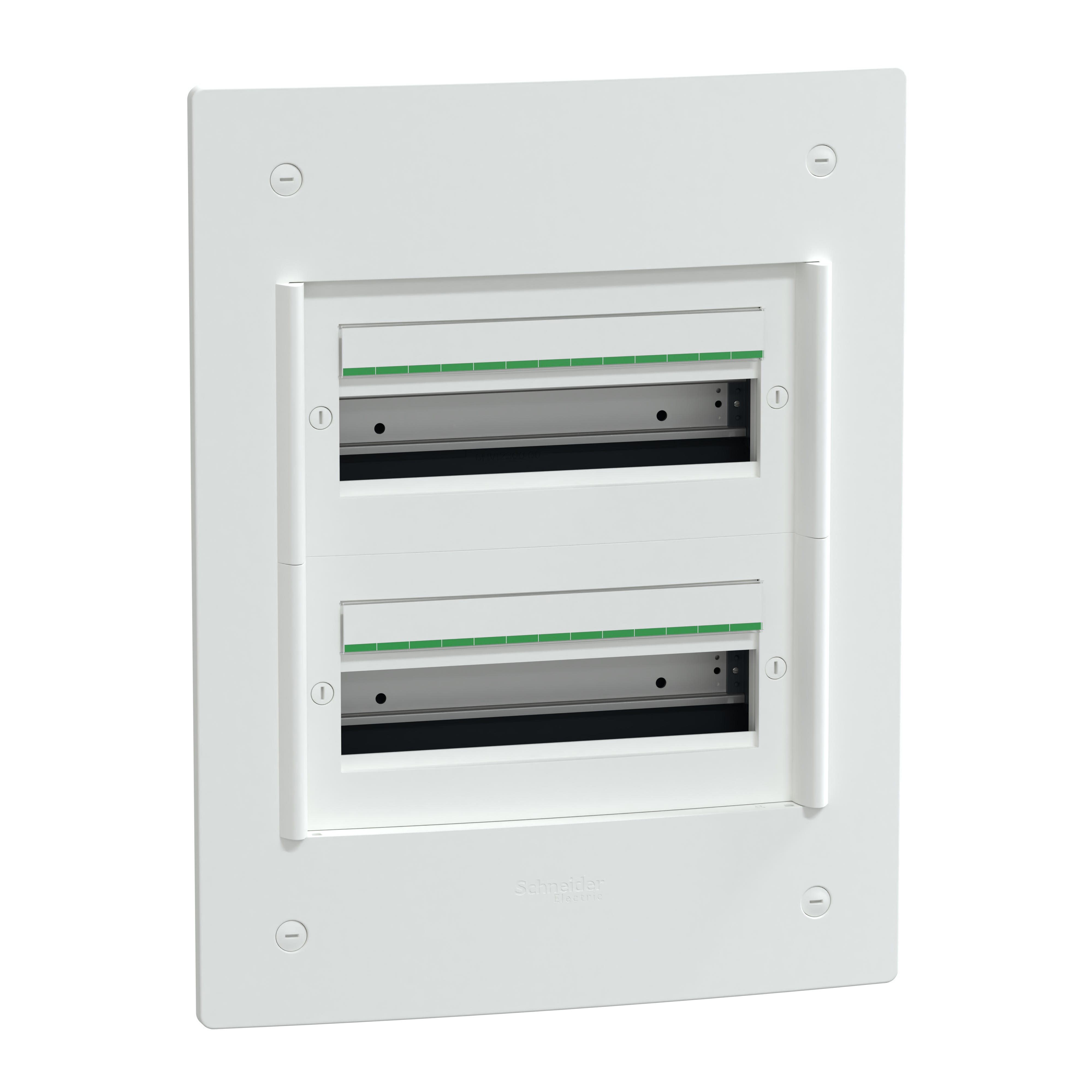 Ce coffret PrismaSeT XS est un coffret de distribution électrique encastrable, en plastique, composé de 2 rangées de 13 modules de 18mm, avec des degrés de protection IP30 et IK08 sans porte. Il peut accueillir tous types d'appareillages modulaires. Compatibles avec nos produits embrochables (XE), ce coffret est dédié à une installation en intérieur et est destiné aux secteurs résidentiel et tertiaire. Le coffret, le plastron et la porte de couleur blanche (RAL 9003) rendent plus esthétique vos équipements. La classe d'isolation électrique est de classe II.