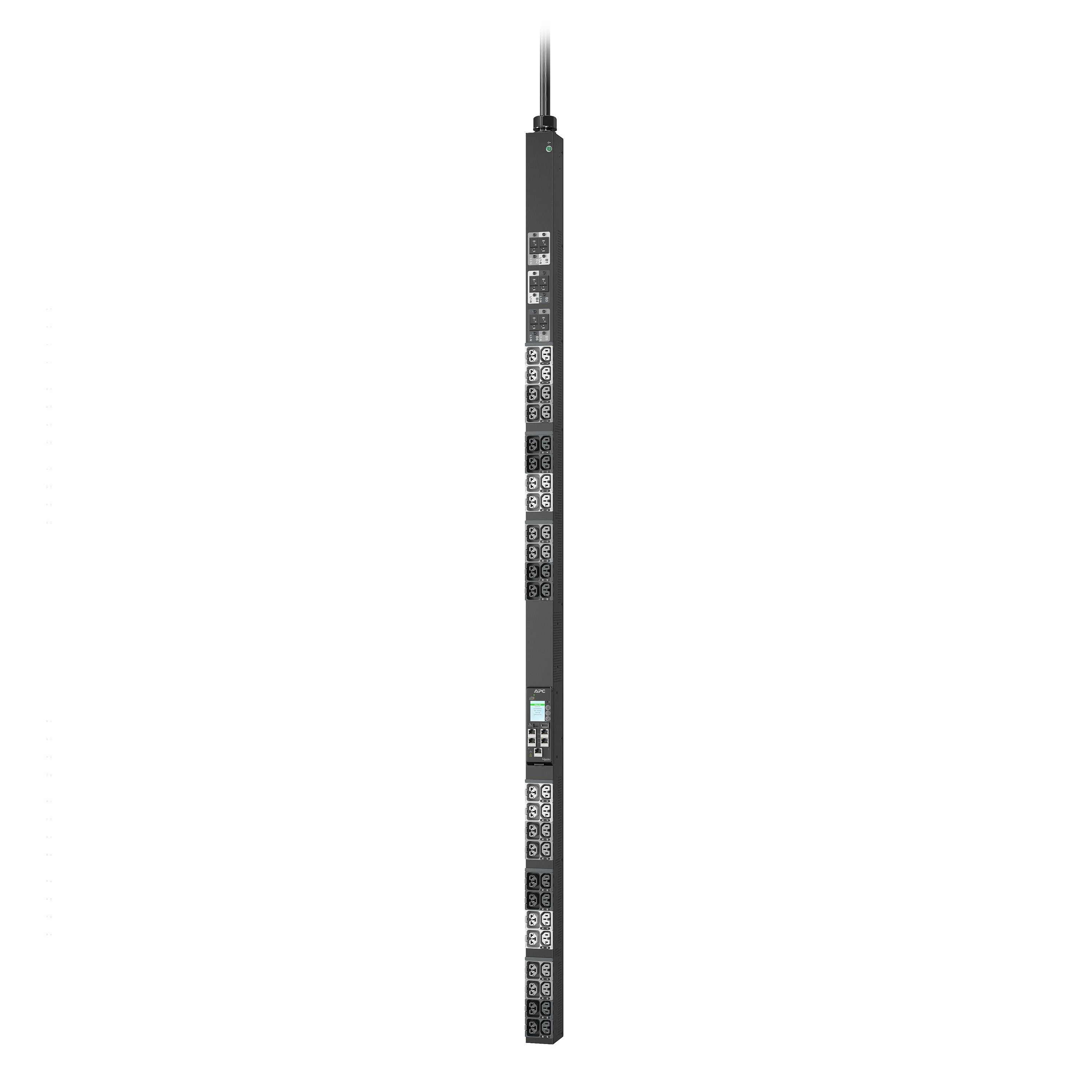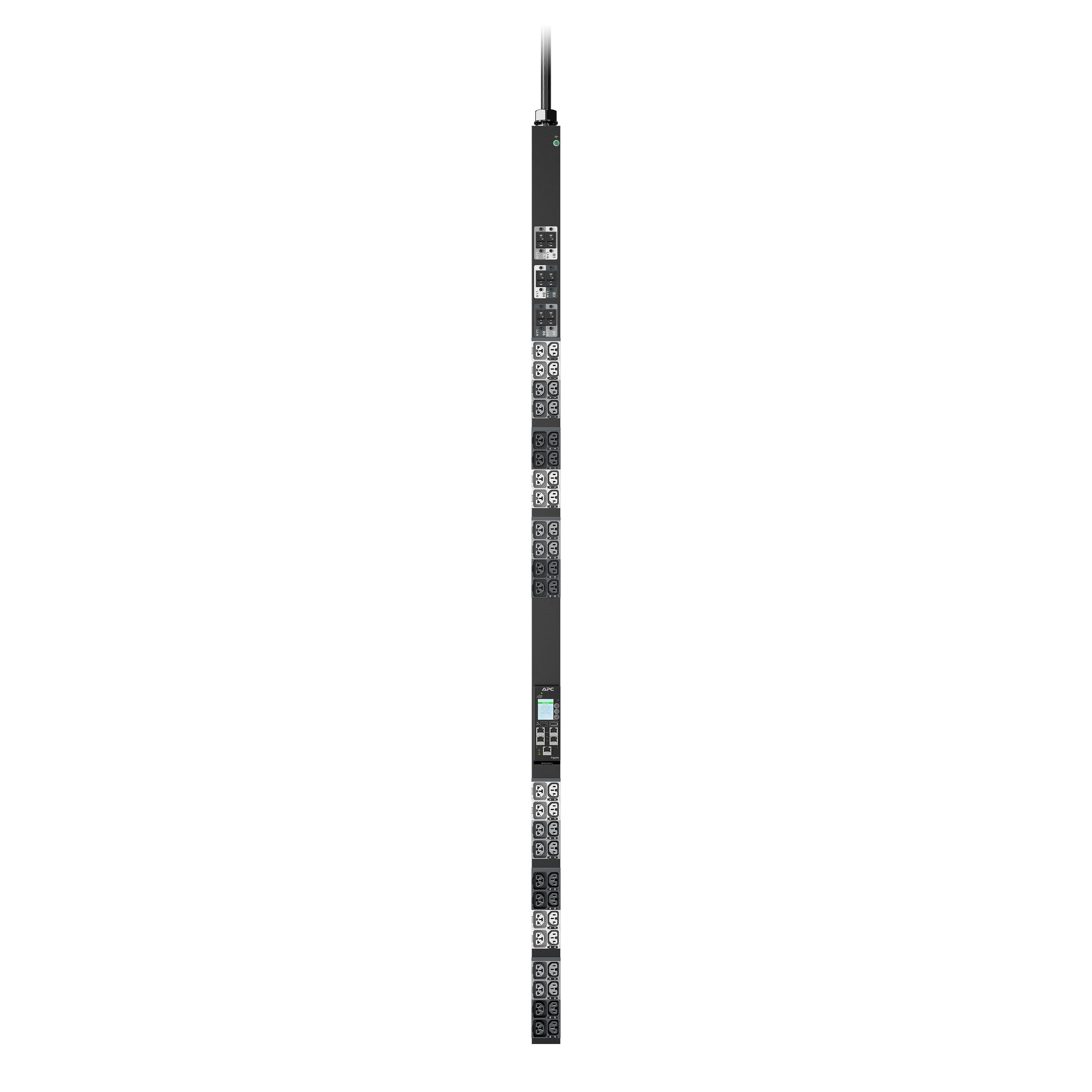 La PDU en rack avancée APC NetShelter (série 11K) fournit une distribution d'alimentation fiable à l'équipement informatique dans les racks de serveur et/ou de réseau. Les prises commutées permettent d'activer ou de désactiver les prises à distance. La mesure de l'alimentation au niveau de la PDU fournit une visibilité de l'alimentation et une notification des surcharges potentielles. Les prises combinées 4 en 1 qui peuvent être utilisées comme prises C13, C19, C15 ou C21 offrent une flexibilité de déploiement inégalée. Densité de sortie maximale avec 48 sorties dans un emplacement de 2,2 pouces. (5,6 cm) de large permet d'installer davantage d'équipements dans le rack. Les prises des PDU sont identifiées par un code couleur et étiquetées par disjoncteur. Échangez en direct la carte de gestion réseau 3 pour minimiser les temps d’arrêt dans l’éventualité peu probable d’un événement d’alimentation de la carte. La PDU en rack s'intègre à EcoStruxure IT via une carte de gestion réseau 3 et peut être accessible et configurée via le Web, SNMP et une interface en ligne de commande (CLI). Un cordon d’entrée de 3 mètres (10 pieds) facilite l’accès de la PDU à l’alimentation. Évalué pour fonctionner jusqu'à 60 C (140 F) à pleine charge, il garantit la fiabilité et la disponibilité même dans les déploiements haute densité actuels. Un port Gigabit Ethernet/réseau (10/100/1000) améliore et normalise la connectivité réseau. Deux ports de liaison peuvent être branchés en cascade sur un maximum de 32 PDU, avec une fonctionnalité de partage de port réseau (NPS) pour permettre le partage de l’alimentation entre les PDU en rack du groupe en cascade. Suivez ou facturez la consommation électrique en toute confiance avec une précision de mesure de 1 %. Deux ports de capteur d'environnement permettent de connecter des capteurs en option (vendus séparément). Pour les déploiements de datacenters dans plusieurs régions, ces PDU possèdent les certifications suivantes : UL, CE, CSA, UKCA, Nemiko, PSE, KC, China RoHS, RCM et CMIM. Le cordon d'alimentation d'entrée de ce modèle est conforme à la norme CEI-309 32 A 3P+N+PE. Il est équipé de prises combo C13/C15/C19/C21 à 24 comptes et de prises C13/C15 à 24 comptes.