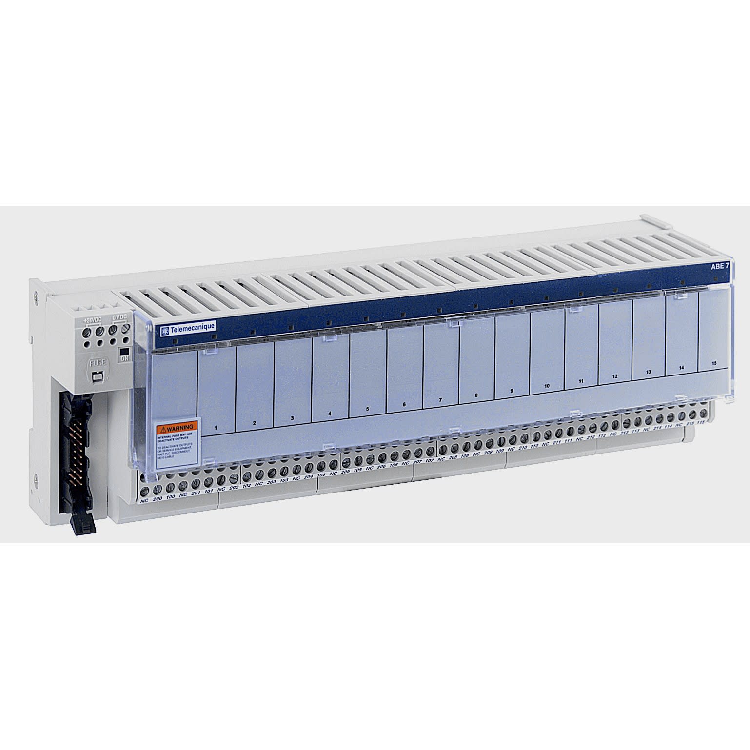 Le système Telefast est un ensemble de produits permettant le raccordement rapide des modules d'entrées/sorties aux parties opératives. Cette embase d'entrée pour relais embrochable fait partie de la gamme Modicon ABE7. Le système Telefast se connecte uniquement sur les voies munies de connecteurs de types HE 10 et SUB-D ou sur borniers standard équipés de câble (limande). Il se compose de câbles de liaison et d’embases d’interfaces. 16 canaux disponibles. Ce produit répond à la plupart des applications industrielles, des besoins du secteur tertiaire et des infrastructures : travail des matériaux, emballage, pompage, biens de consommation courante, eau/eaux usées, pétrole et gaz, manutention. Ce système se substitue aux borniers à vis, déportant et supprimant en partie le raccordement unifilaire. Il a été conçu pour résister dans les environnements industriels.