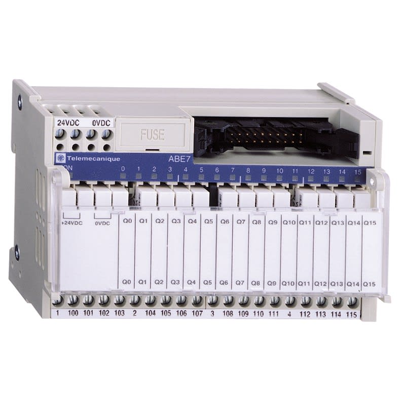 Telefast ABE7 - embase - relais embrochable - 16 voies - relais 5mm - tension d'alimentation : 19...30 V - 1 LED puissance ON - 1 DEL par canal statut du canal - groupe de distribution commune de 4