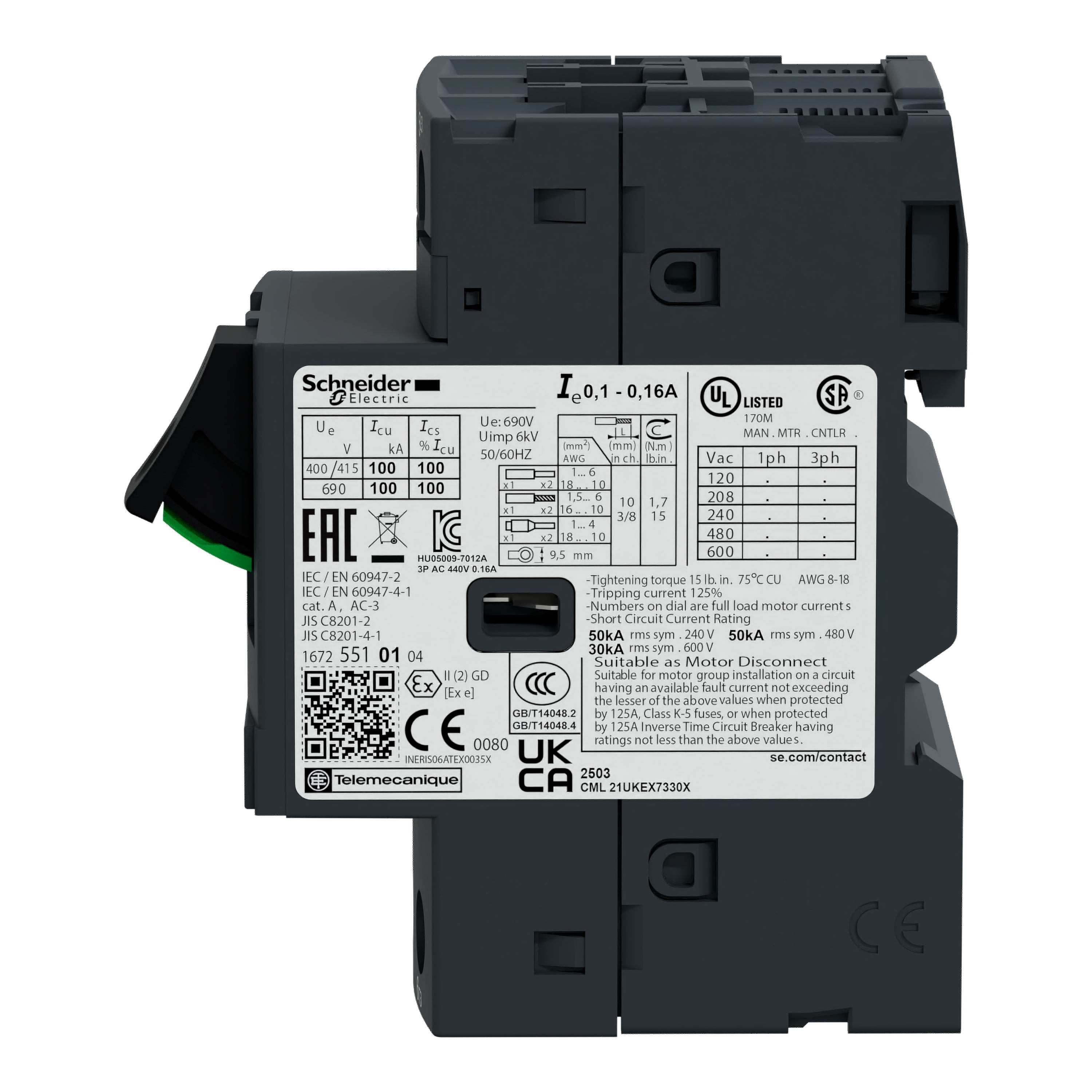 Ce disjoncteur moteur TeSys GV, 6,3 A/690V, convient aux applications de moteurs triphasés 2,2kW à 400V. Il offre une protection thermomagnétique avec une plage de réglage thermique de 4 à 6,3A, un déclenchement magnétique à 13xIn, un pouvoir de coupure élevé Icu 100kA à 400V. La connexion se fait par cosses. La commande start-stop par bouton poussoir est garantie pour 100 000 cycles AC-3. Il est certifié multinormes (IEC, UL, CSA, CCC, EAC, Marine, ATEX) et est conforme à la directive RoHS et à la règlementation REACh.