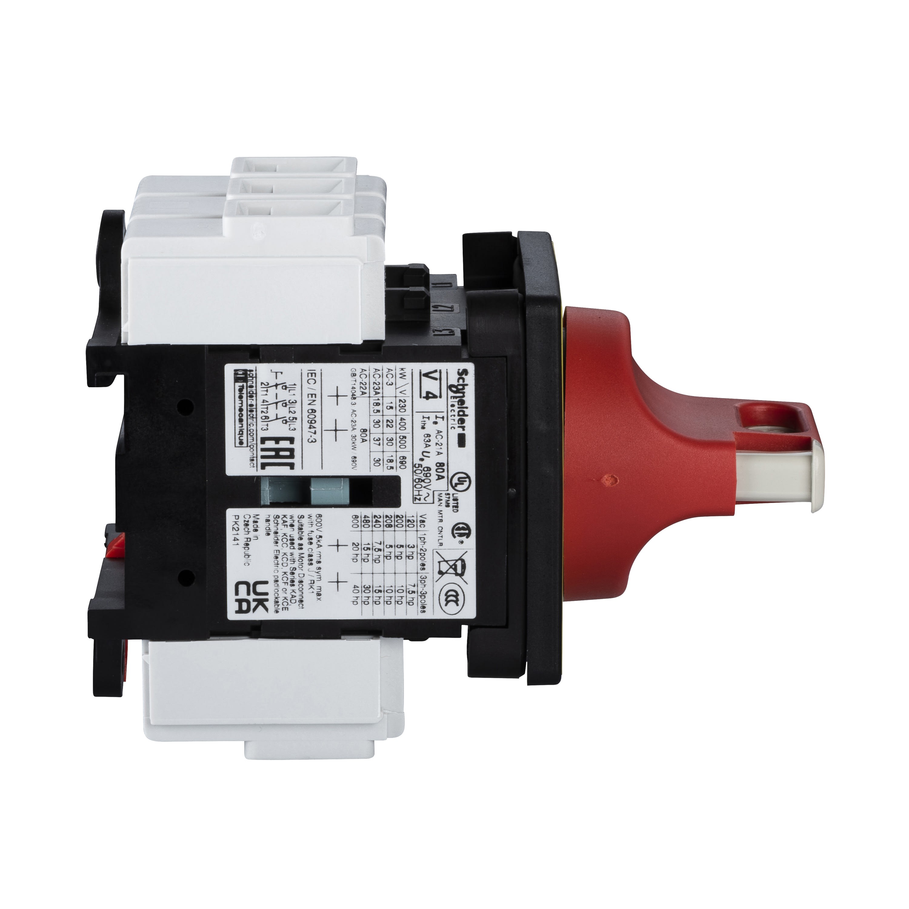 Interrupteur-sectionneur TeSys Vario pour montage sur porte, 3 pôles, 80A / 690V, pour applications de commutation de moteur jusqu'à 30kW à 400V en AC-23 Unité complète composée d'un corps d'interrupteur V4, d'une poignée rouge avec face avant jaune 60x60mm KCF2PZ Destiné à la déconnexion de l'interrupteur principal et de l'interrupteur d'arrêt d'urgence Poignée cadenassable, pour 3 cadenas (à commander séparément) Poignée avec 4 vis de fixation sur porte, assurant un indice de protection IP65 après montage Certifié multi normes (CEI, UL, CSA, CCC, EAC, Marine), conforme Green Premium (RoHS / REACh)