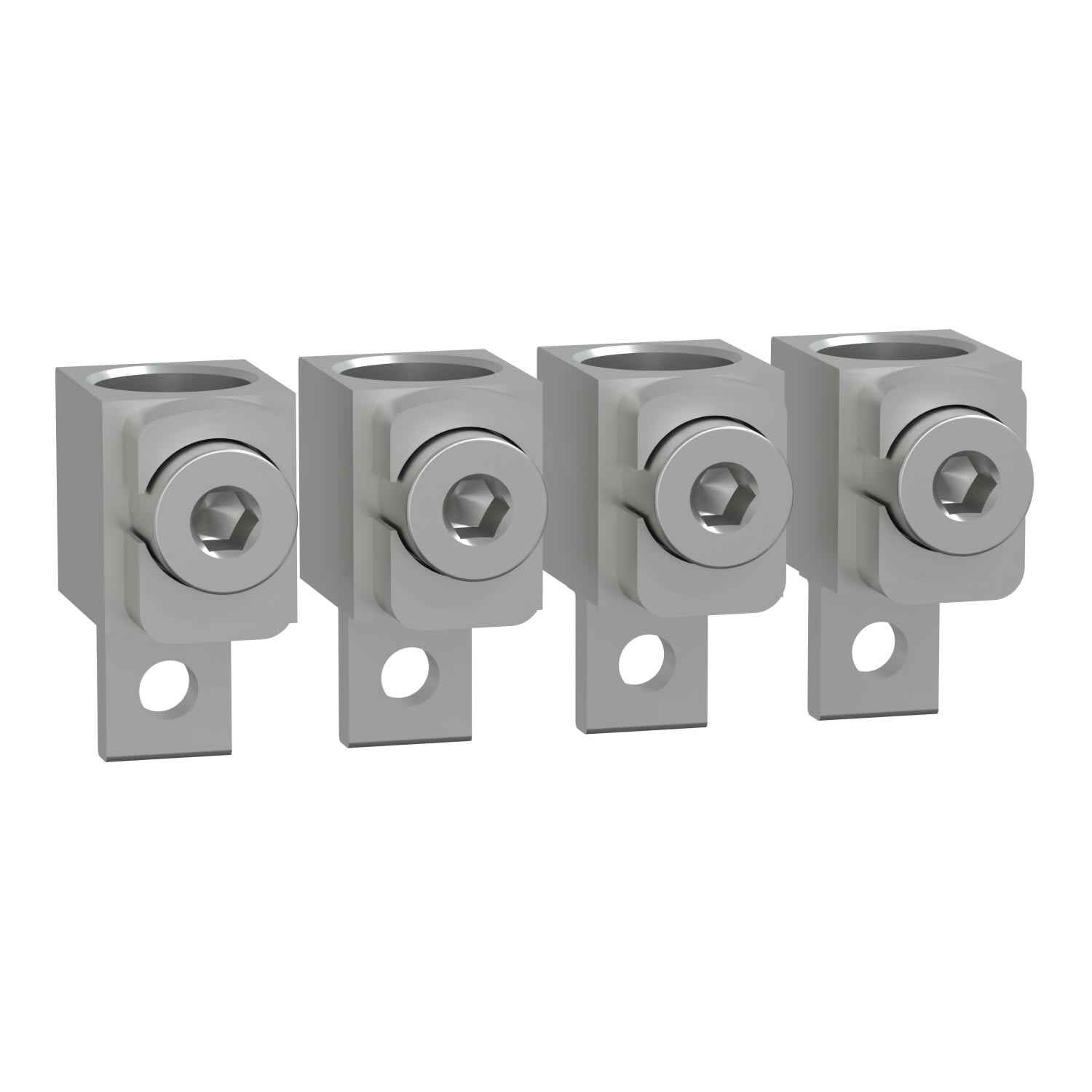 Ce lot de 4 bornes en aluminium permet de fixer 1 câble d'alimentation ou câble de départ sur l'inverseur de source TransferPacT TA250. Cet accessoire de raccordement s'installe sur les bornes de l'appareil TransferPacT TA250.