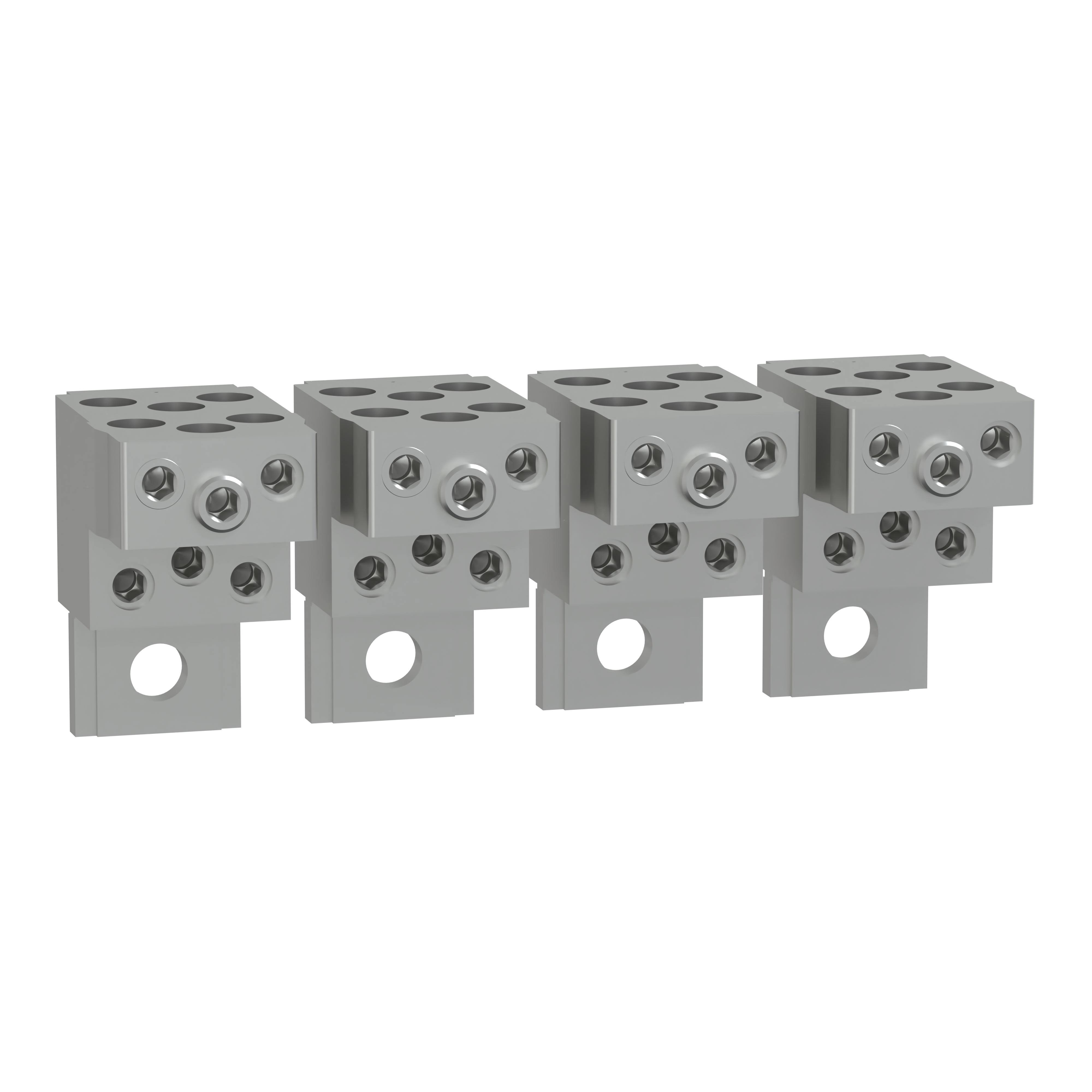 Ce lot de 4 bornes en aluminium permet de fixer 6 câbles d'alimentation ou câbles de départ sur l'inverseur de source TransferPacT TA250. Cet accessoire de raccordement s'installe sur les bornes de l'appareil TransferPacT TA250.