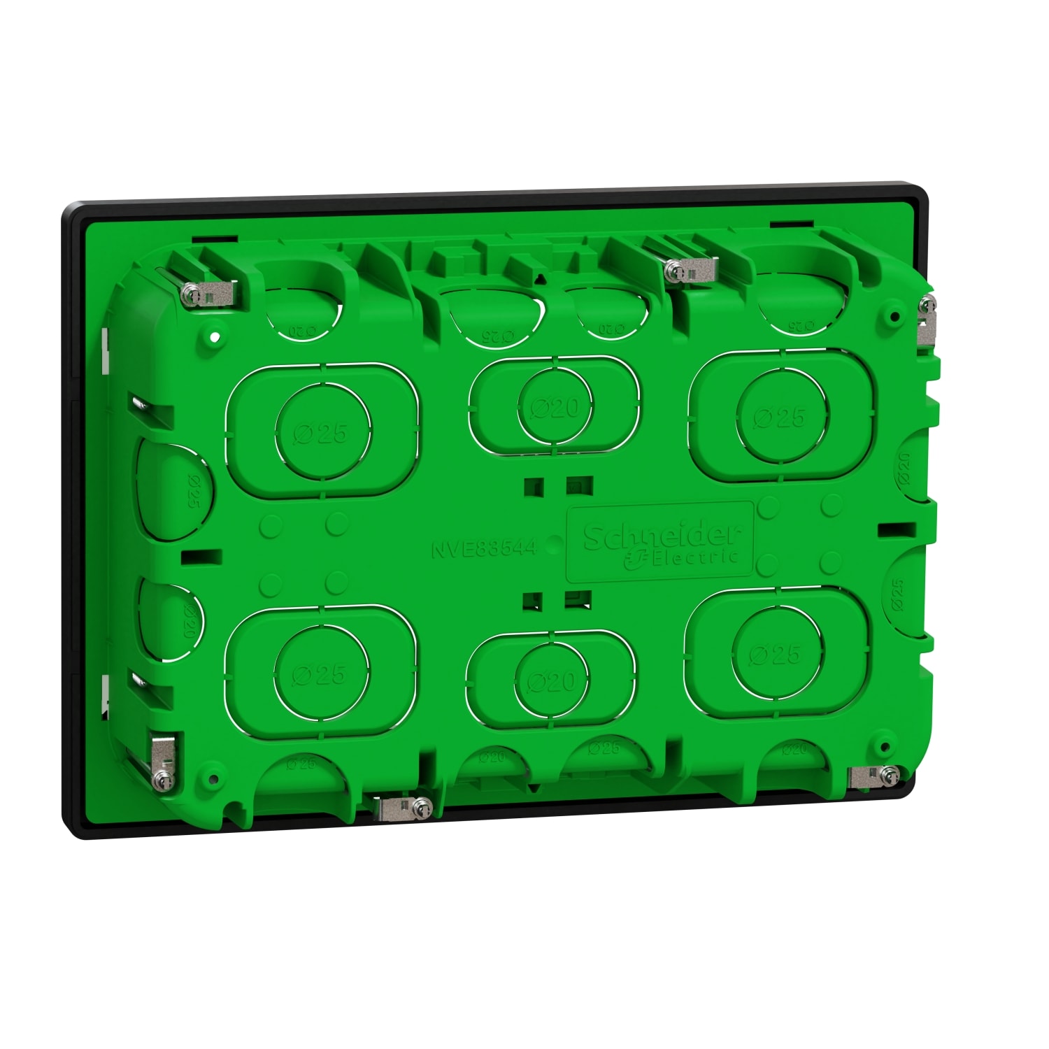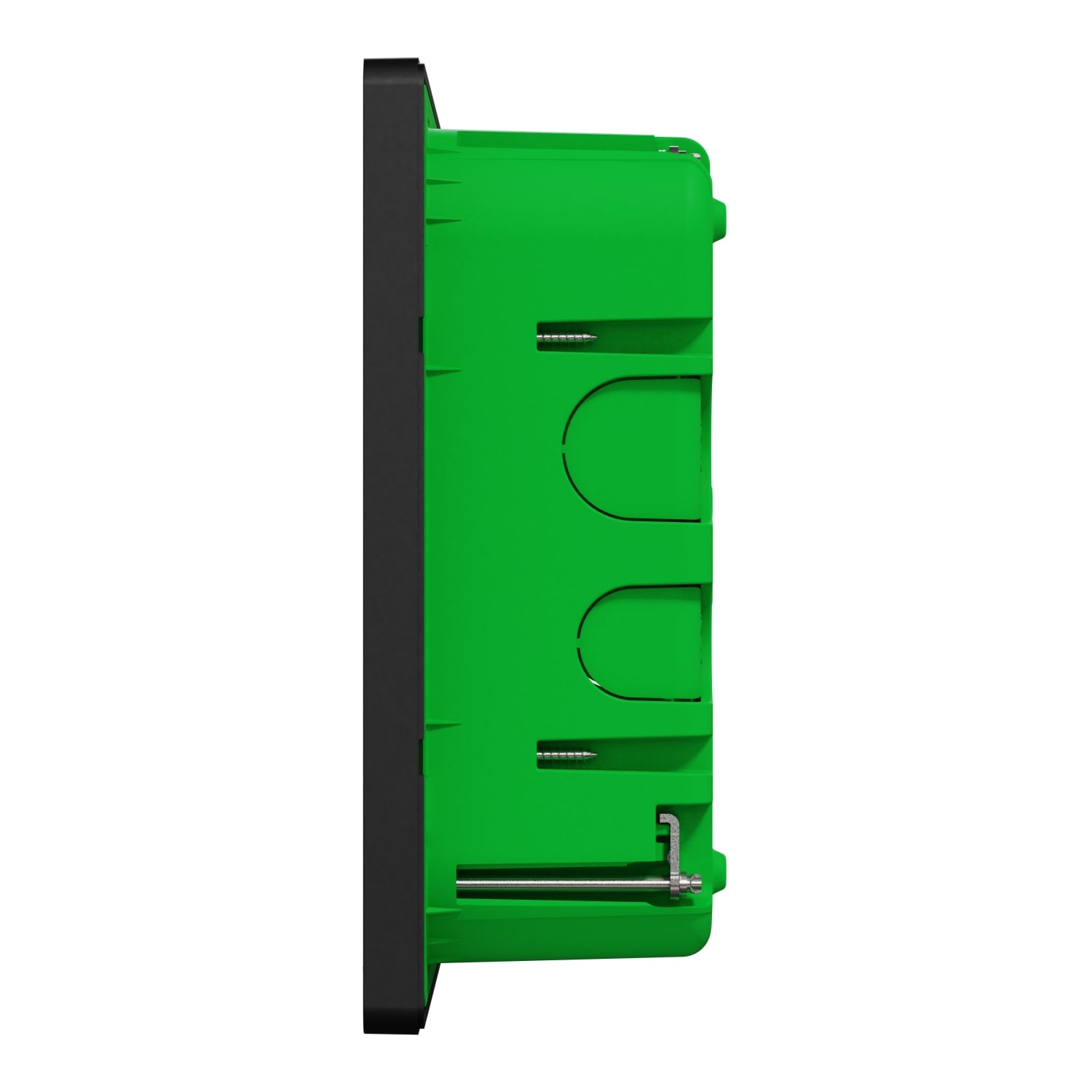 NU171854 se compose d'un boitier encastré, de 2 supports de fixation en zamac et d'une plaque de finition de couleur anthracite.