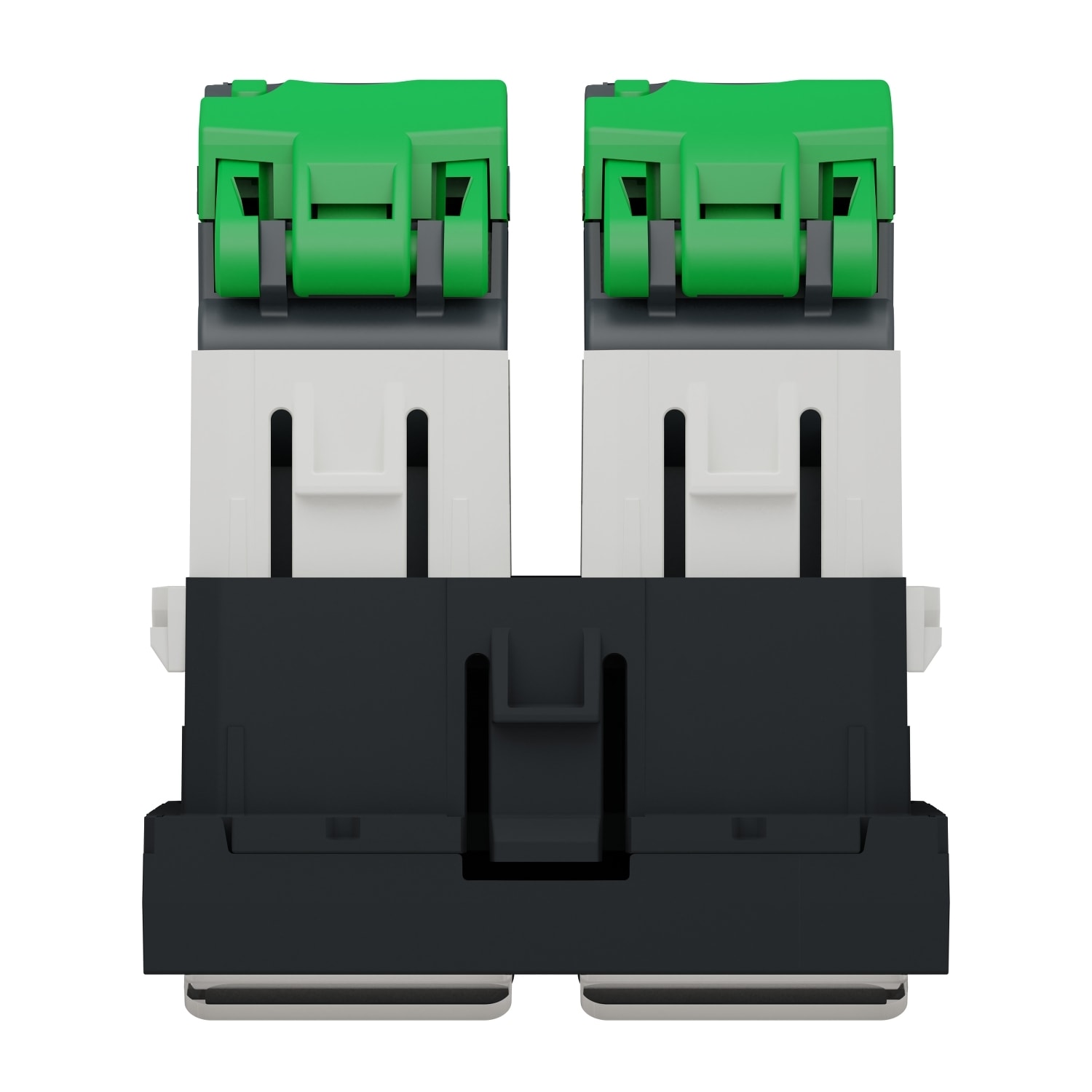 NU342654, en version 2 modules, se compose d'un support gris anthracite équipé 2 volets de protection, 2 portes étiquettes ainsi que de 2 connecteurs RJ45 S-One Catégorie 5 blindé en zamac. Les connecteurs sont à câbler avec des câbles VDI à paires torsadées Catégorie 6 blindé du type STP et acceptent les fils monobrins AWG22 à AWG26. Pour une installation murale, le support sera à associer avec un support de fixation et une plaque de finition Unica (Pro, Studio, Pure). Sinon il se clipsera directement sur le support compatible : goulottes, boitiers de sol,…