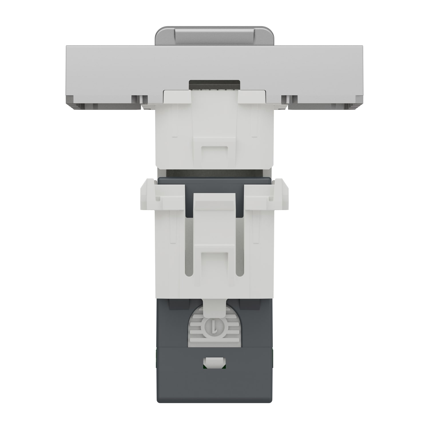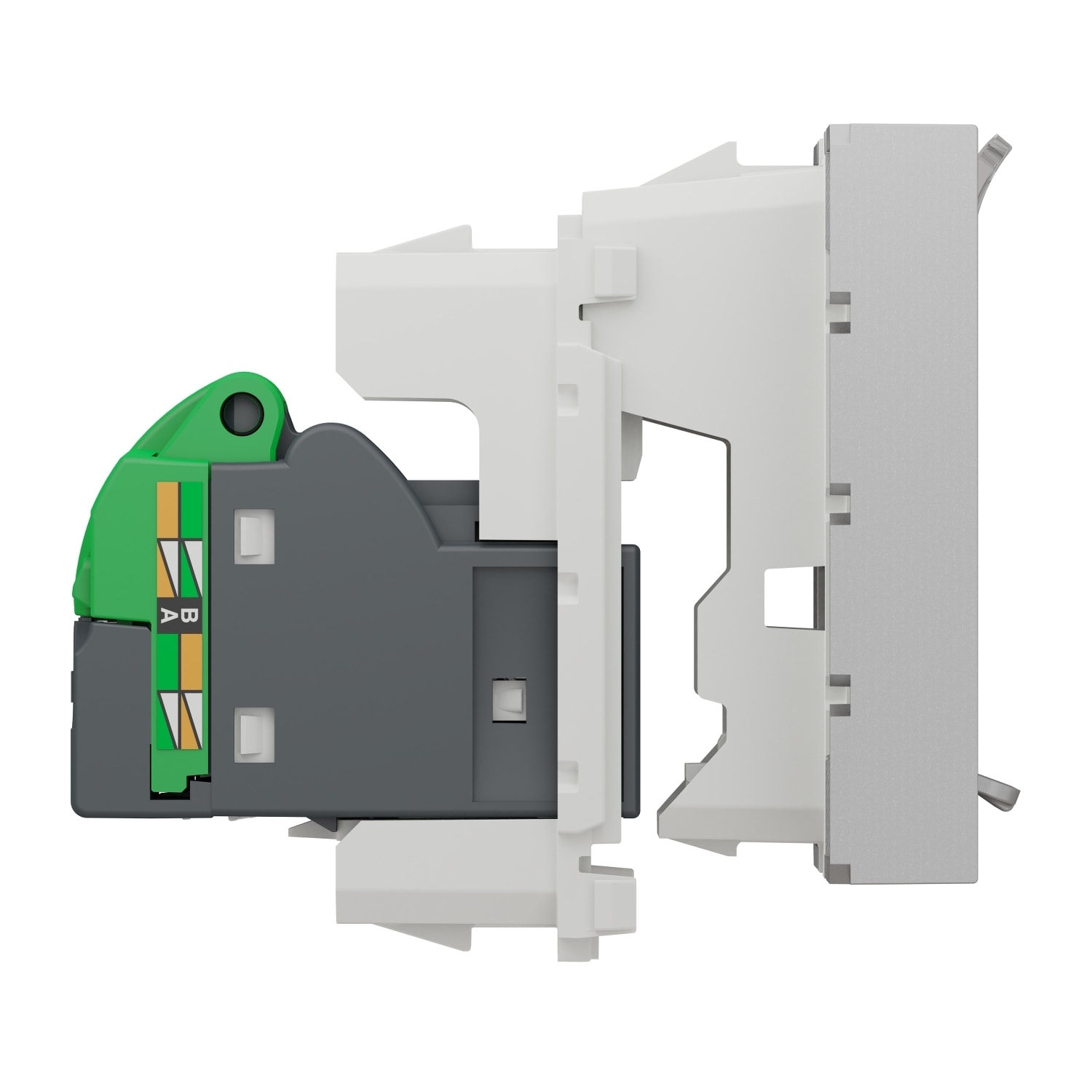 NU344930, en version 2 modules, se compose d'un support aluminium équipé d'un volet de protection, d'un porte étiquette ainsi que d'un connecteur RJ45 S-One Catégorie 6A blindé en zamac. Le connecteur est à câbler avec un câble VDI à paires torsadées Catégorie 6 blindé du type STP, FTP et accepte les fils monobrins AWG22 à AWG26. Pour une installation murale, le support sera à associer avec un support de fixation et une plaque de finition Unica (Pro, Studio, Pure). Sinon il se clipsera directement sur le support compatible : goulottes, boitiers de sol,…