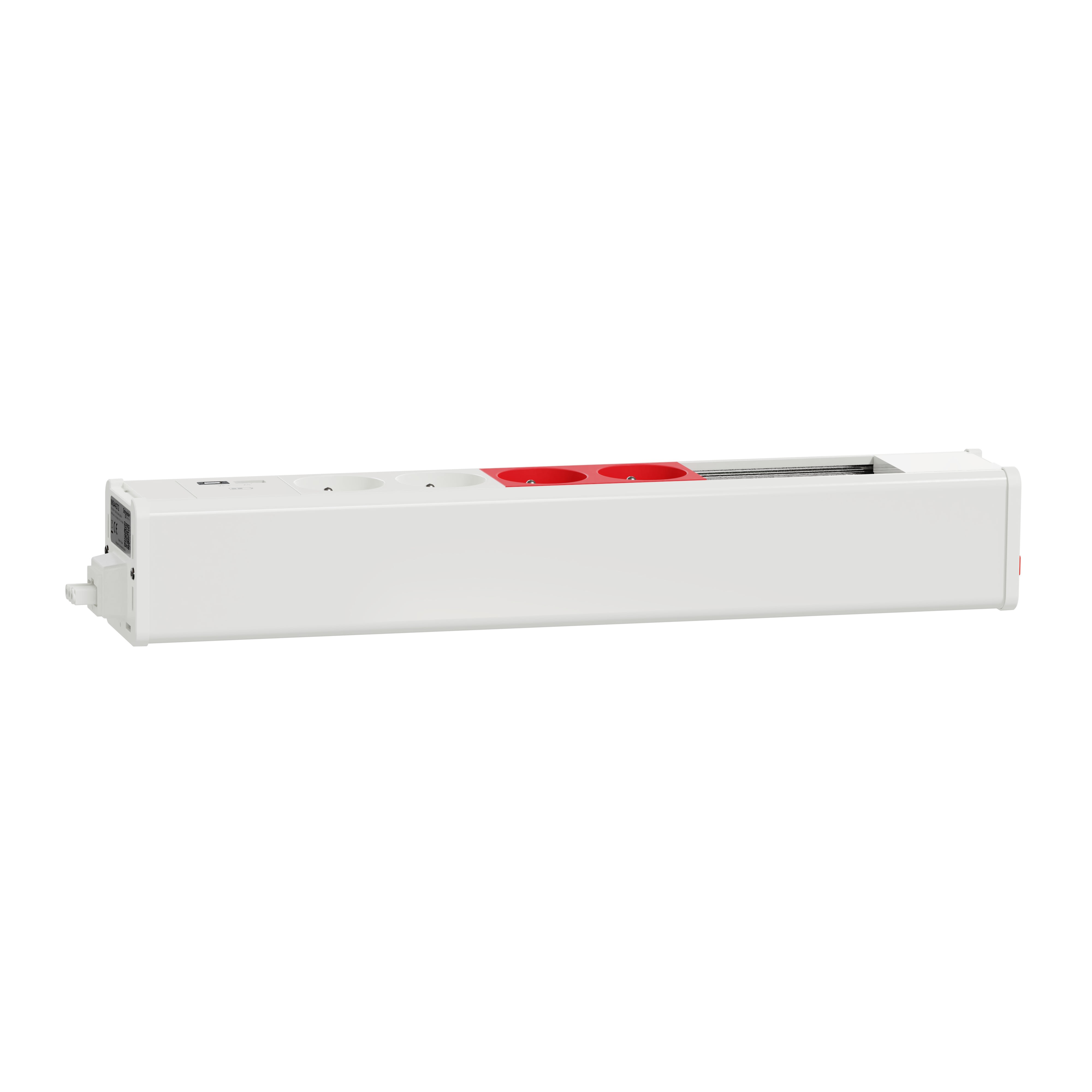 Découvrez les produits de la gamme Unica System+, la nouvelle génération des systèmes d’installations ! Esthétique, flexible, évolutive, ingénieuse, Unica System+ est rapide à installer et facile à utiliser pour répondre aux nouveaux environnements de travail (au bureau, à la maison) et dans tous les espaces accueillant du public Ce module de bureau M pré-configuré et pré-câblé (type nourrice) Unica System+ propose 2 prises de courant 2P+T normales, 2 prises de courant 2P+T ondulées (rouge), 2 ports USB type A et C Il propose également 2 emplacements pour prise Unica (RJ45 ou multimédia sur 45x90mm) et est en matière aluminium de couleur blanche Les prises Unica qui le composent sont de couleur blanche Peut être installé sur colonne, colonnette ou sur le mobilier en utilisant des kits de finitions et de fixation disponibles séparément Il peut être fixé par serrage sans perçage sur le mobilier et peut ainsi être déplacé et repositionné si besoin Il peut également être vissé sur le mobilier pour une installation permanente Unité précâblée avec connexion rapide (Mini-Wieland) pour alimenter chaque extrémité Plusieurs blocs nourrices peuvent être rapidement connectés les unes aux autres, en utilisant un seul et même circuit d'alimentation, garantissant ainsi l'évolutivité de l'installation Puissance: 16 A / 250 V, USB 5 V / 2,4 A Longueur 421mm - Largeur 64mm - Hauteur 64mm Les solutions Unica System+ ont été conçues pour les espaces tertiaires et résidentiels où l'accès à des prises pour brancher ses équipements (PC, tablette, smartphone, etc) se développe de plus en plus Ces espaces incluent les bureaux, les écoles, les hôtels, les gares, les commerces, la cuisine à la maison ou le coin bureau et finalement tous les nouveaux espaces de travail, d'attentes ou de détentes Combinez les produits de cette gamme pour créer des espaces de travail uniques