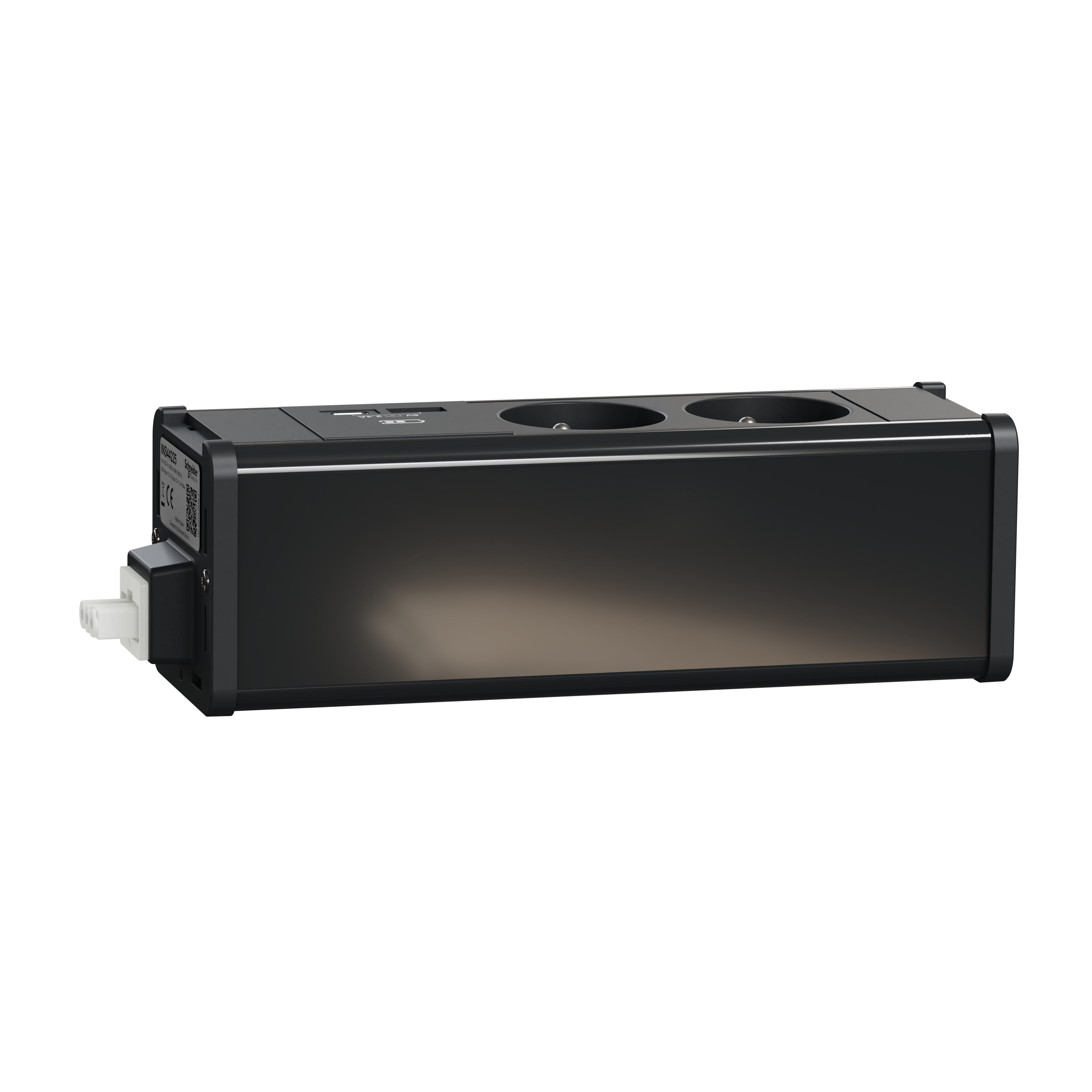 Découvrez les produits de la gamme Unica System+, la nouvelle génération des systèmes d’installations ! Esthétique, flexible, évolutive, ingénieuse, Unica System+ est rapide à installer et facile à utiliser pour répondre aux nouveaux environnements de travail (au bureau, à la maison) et dans tous les espaces accueillant du public Ce module de bureau M pré-configuré et pré-câblé (type nourrice) Unica System+ propose 2 prises de courant 2P+T et 2 ports USB type A et C Il est en matière aluminium de couleur anthracite Les prises Unica qui le composent sont de couleur anthracite Il peut être installé à la verticale sur une colonne, une colonnette ou à l'horizontal sur le mobilier en utilisant des kits de finitions et de fixation disponibles séparément Il peut être fixé par serrage sans perçage sur le mobilier et peut ainsi être déplacé et repositionné si besoin Il peut également être vissé sur le mobilier pour une installation permanente L'unité est précâblée et dispose à chaque extrémité d'une connexion rapide (Mini-Wieland) Plusieurs modules ou nourrices peuvent être rapidement connectés les uns aux autres, en utilisant un seul et même circuit d'alimentation, garantissant ainsi l'évolutivité de l'installation Puissance: 16 A / 250 V, USB 5 V / 2,4 A Longueur 218mm - Largeur 64mm - Hauteur 64mm Les solutions Unica System+ ont été conçues pour les espaces tertiaires et résidentiels où l'accès à des prises pour brancher ses équipements (PC, tablette, smartphone, etc) se développe de plus en plus Ces espaces incluent les bureaux, les écoles, les hôtels, les gares, les commerces, la cuisine à la maison ou le coin bureau et finalement tous les nouveaux espaces de travail, d'attentes ou de détentes Combinez les produits de cette gamme pour créer des espaces de travail uniques