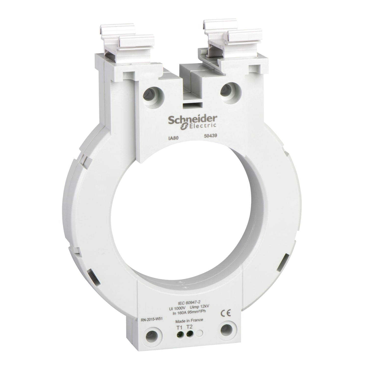 Ce tore fermé est dédié à la détection de défauts d'isolement Vigilohm, ainsi qu'aux relais de protection et de surveillance de courant résiduel Vigirex Le diamètre intérieur du tore est de 80 millimètres et le poids est de 0,420 kg Les câbles doivent être centrés dans le tore et le diamètre total de tous ces câbles ne doit pas dépasser 40 millimètres La section maximale par phase (R, S, T, N) est de 95 mm² pour un conducteur en cuivre Il permet la surveillance du composant injecté depuis Vigilohm Insulation Monitor, la mesure d'un courant nominal jusqu'à 160A pour les relais de surveillance et de protection Vigirex