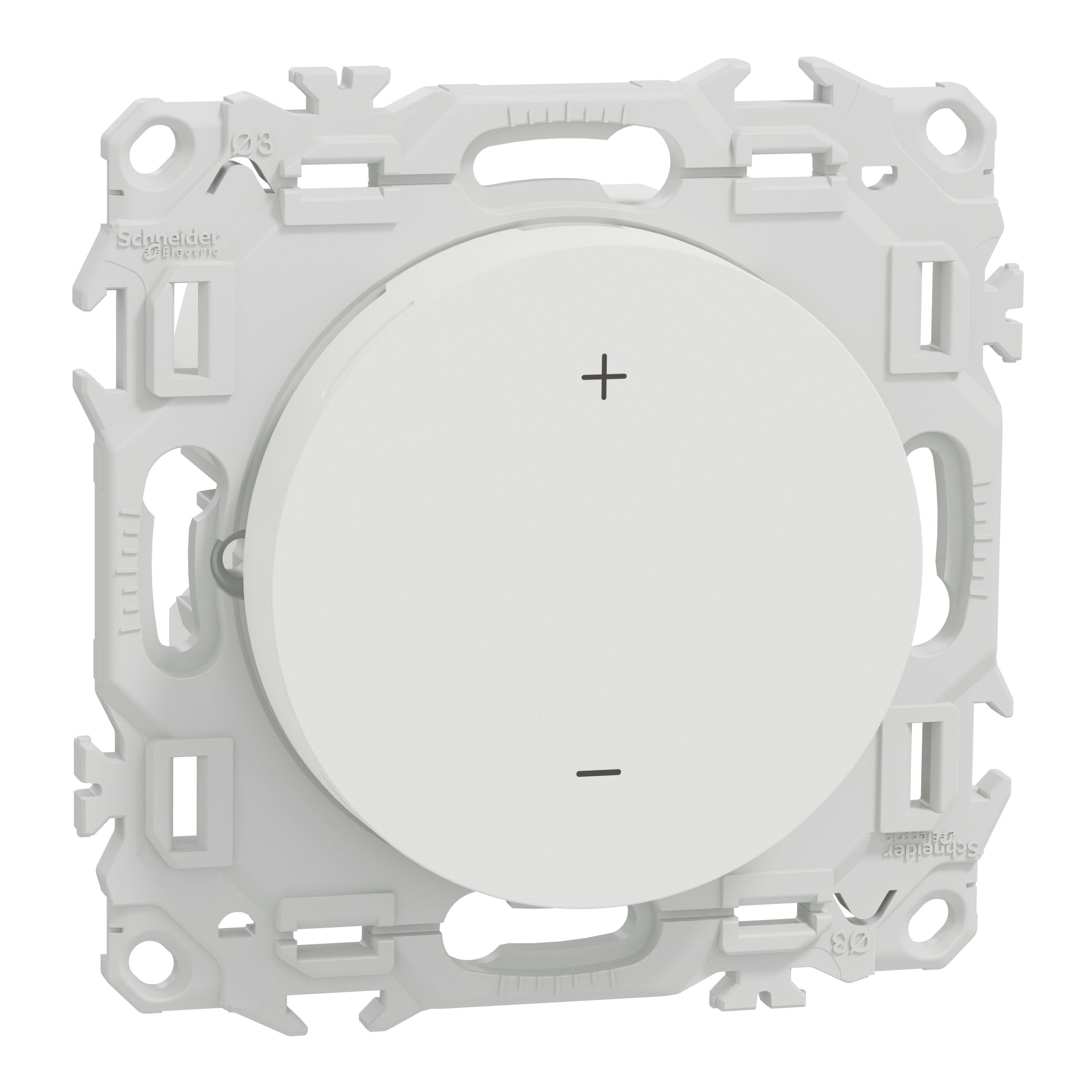 Le thermostat Odace est livré avec son support de fixation intégré et son cache peinture. Il est à associer à une plaque de finition Odace, Odace Métal, Odace Architecte ou Odace Origine.