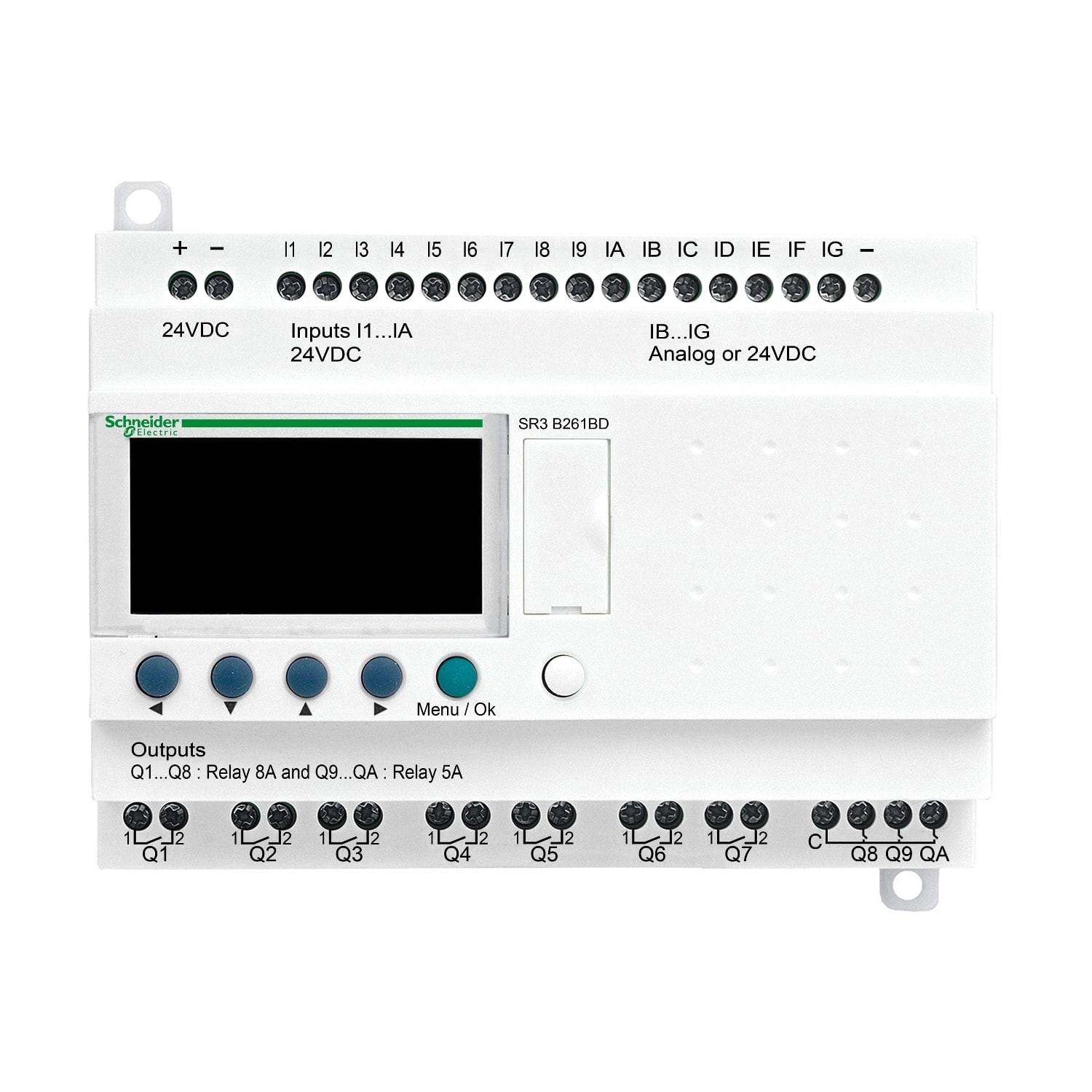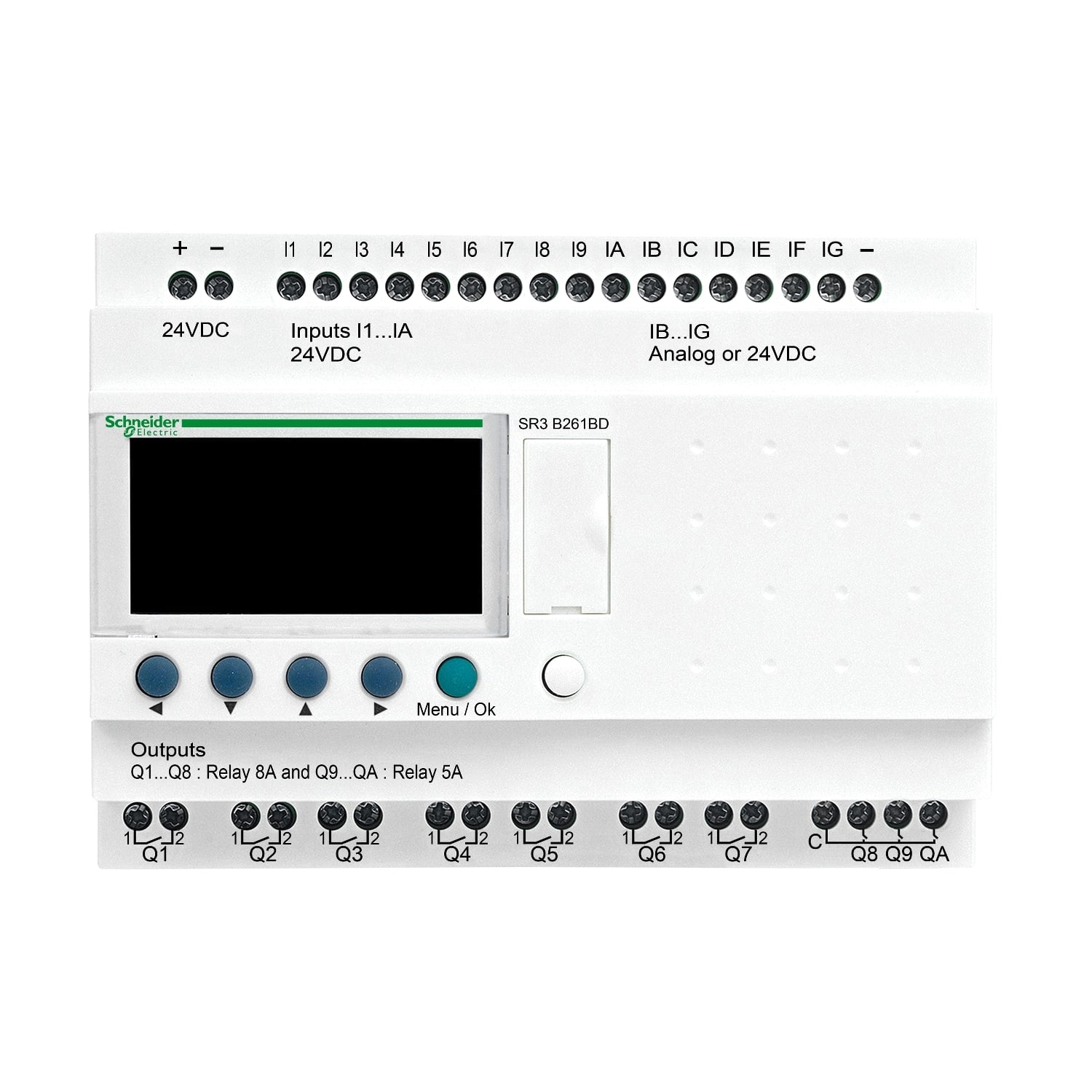 Ce relais intelligent - contrôleur programmable compact Zelio Logic SR3 utilise une tension d'alimentation de 24V CC. Il dispose de 26 entrées / sorties avec bornes à vis-étrier. Il est de conception compacte, permettant une installation sur rail DIN. Il offre également une programmation simple, l'affichage et le diagnostic des dysfonctionnements, l'affichage et les boutons de navigation. Sa programmation simple en échelle est apprécié des non-spécialistes.