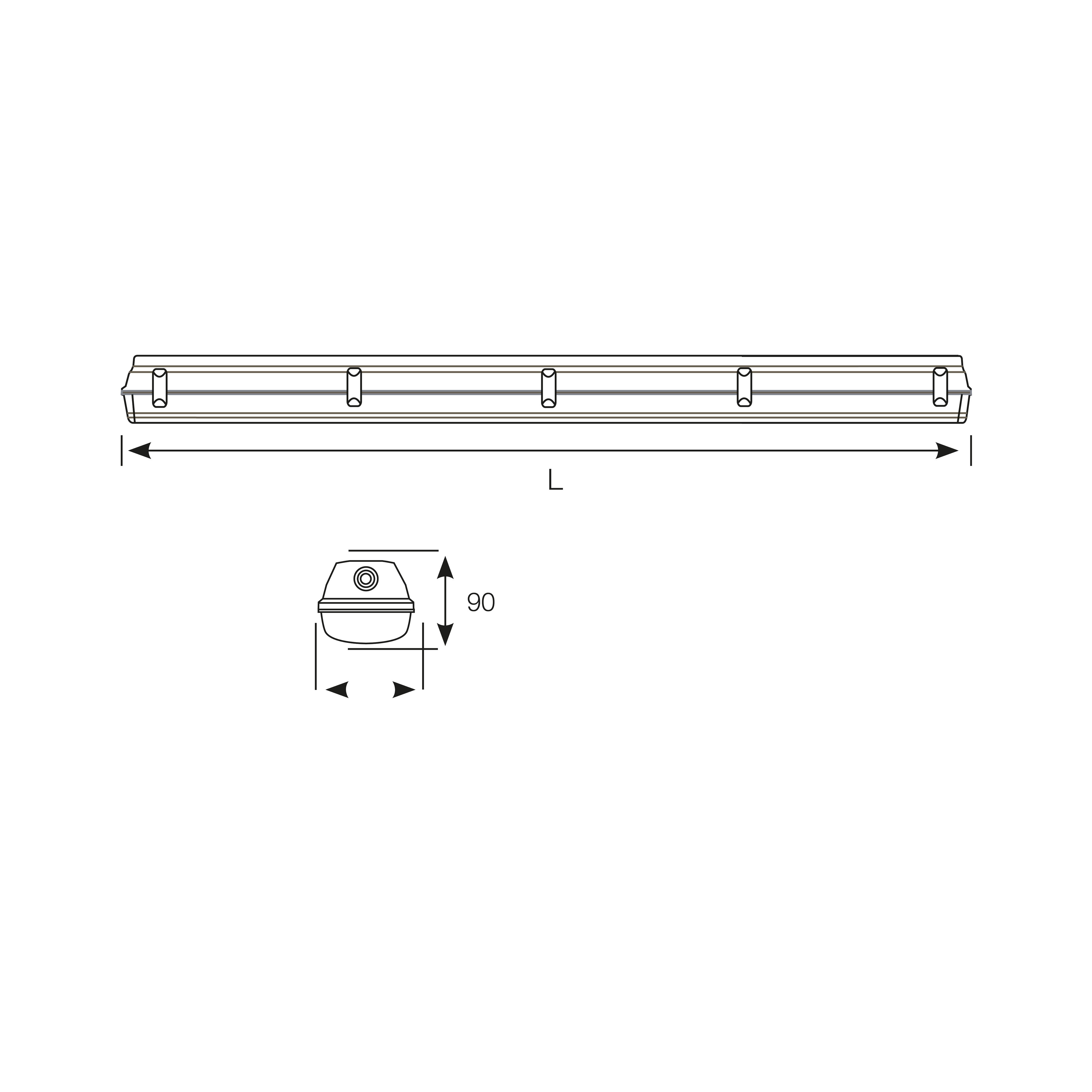 Réglette LED étanche pour parking et lieux publics, IK10 20JCorps polycarbonate injecté gris, diffuseur polycarbonate opalescent2 longueurs : 1277 et 1577mmClips de verrouillage antivandales acier inox