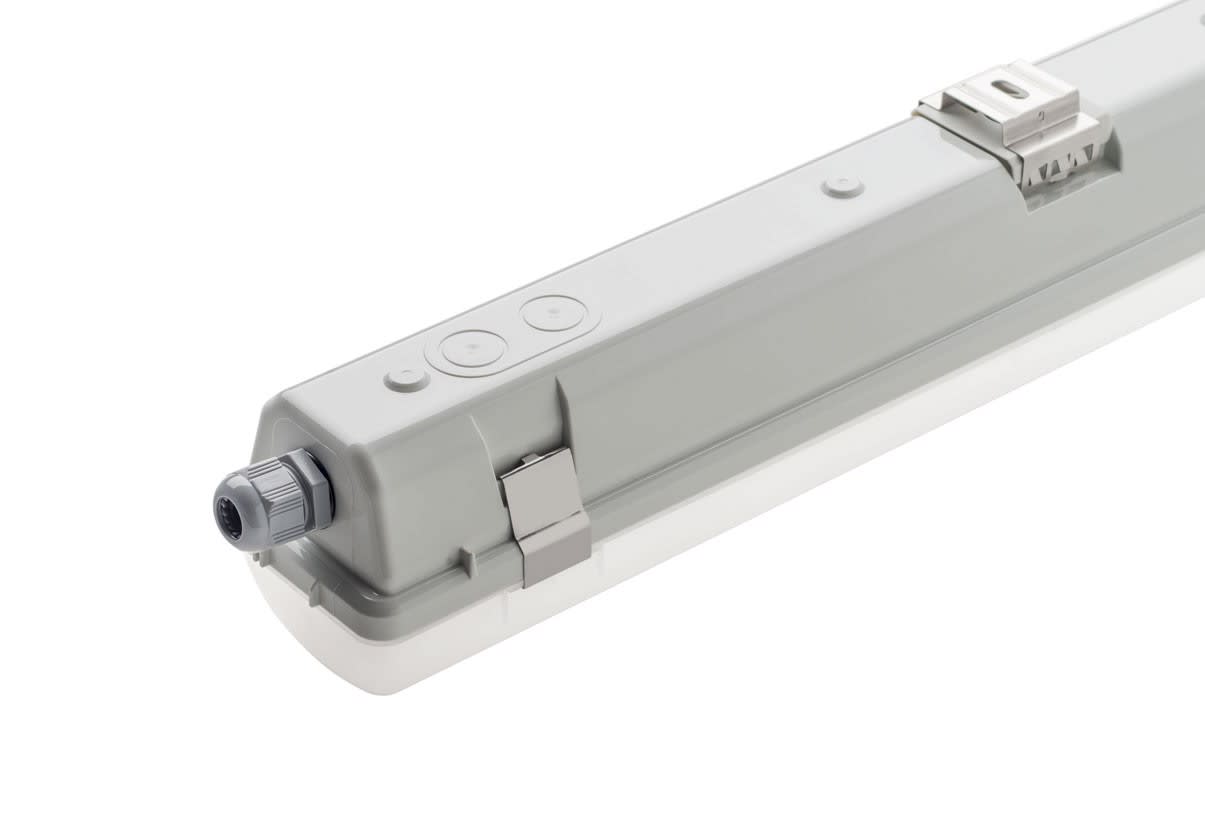 Réglette LED étanche pour parking et lieux publics, IK10 20JCorps polycarbonate injecté gris, diffuseur polycarbonate opalescent2 longueurs : 1277 et 1577mmClips de verrouillage antivandales acier inox