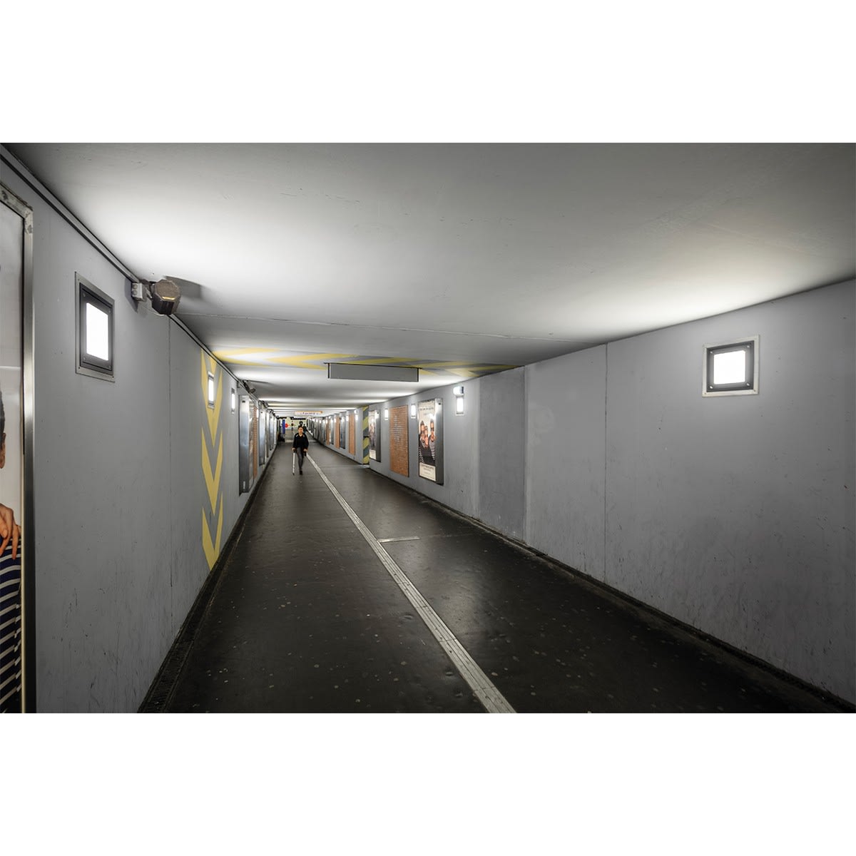 Luminaire architectural à diffuseur rasant, résistant à l'hypervandalisme IK11+ 80J, IP65Carré (315x315x85mm), pose encastréCorps et cadre en inox 304L peint, diffuseur polycarbonate opalescentFermeture par vis inox antivandalesFabrication française certifiée Origine France Garantie