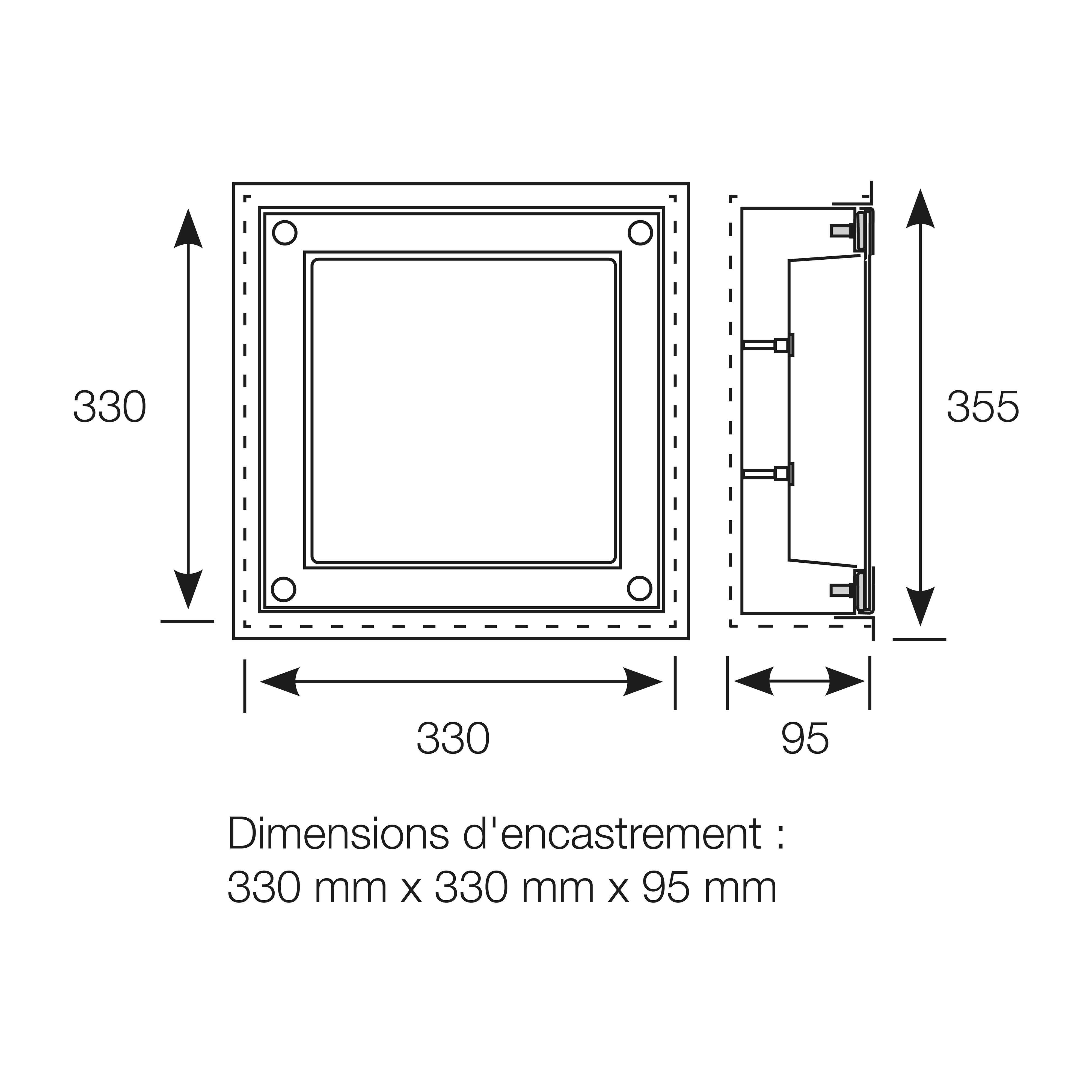 Luminaire architectural à diffuseur rasant, résistant à l'hypervandalisme IK11+ 80J, IP65Carré (315x315x85mm), pose encastréCorps et cadre en inox 304L peint, diffuseur polycarbonate opalescentFermeture par vis inox antivandalesFabrication française certifiée Origine France Garantie
